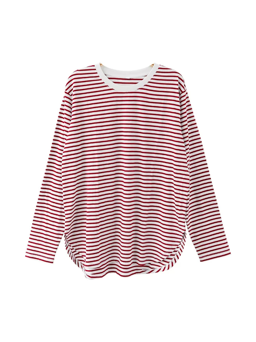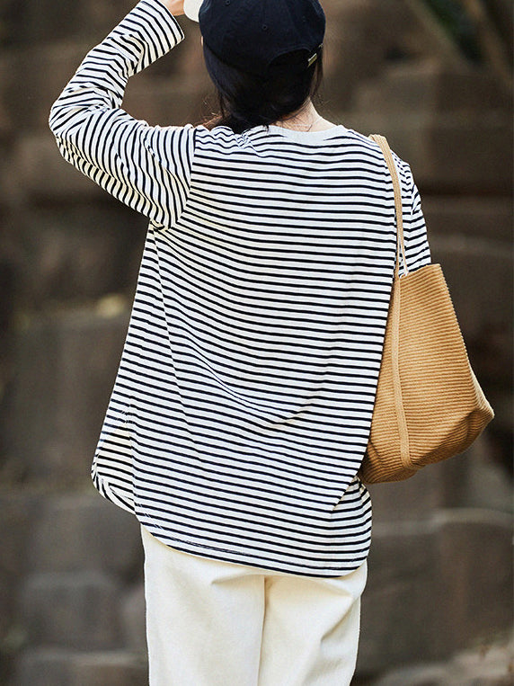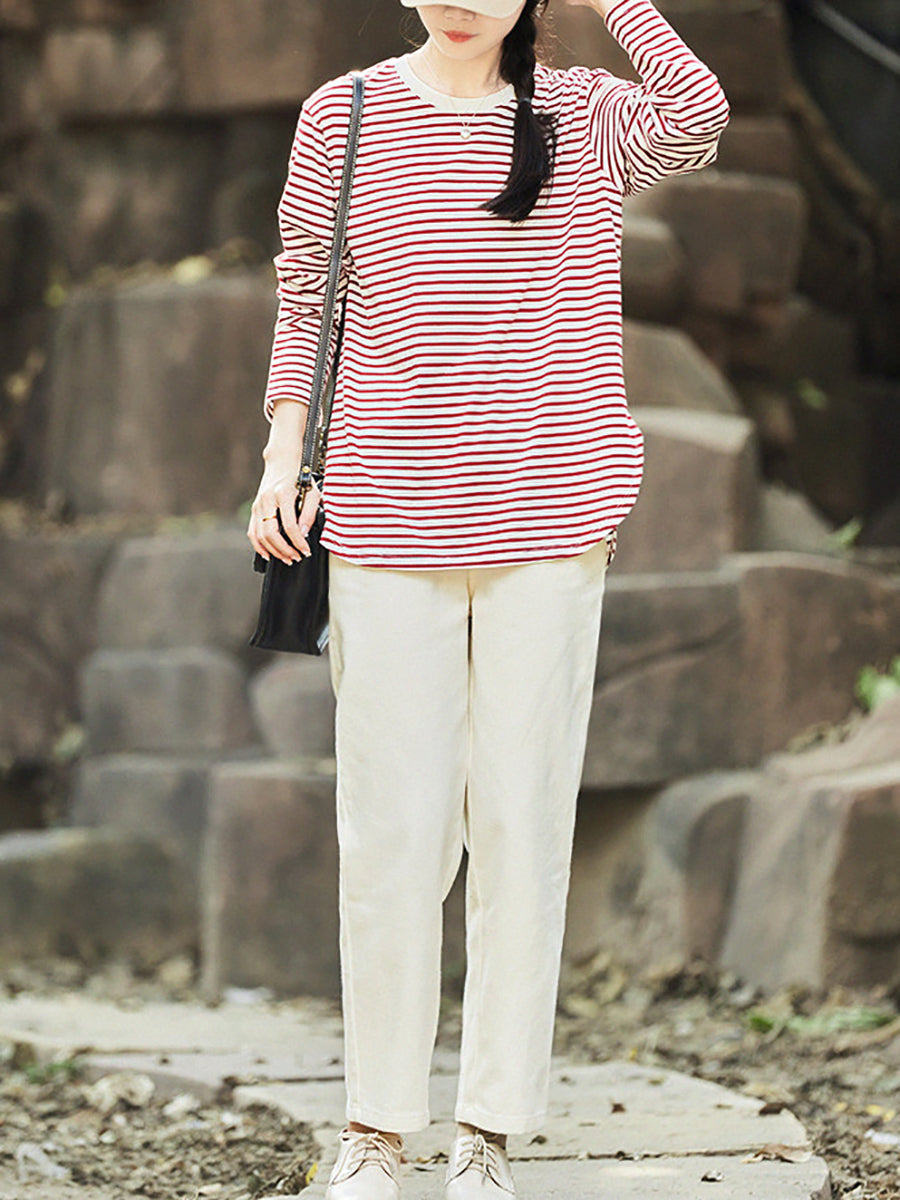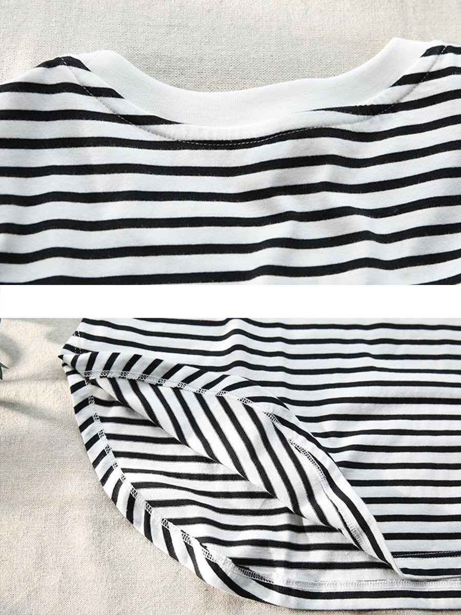 Women Summer Stripe O-Neck 100%Cotton Blouse