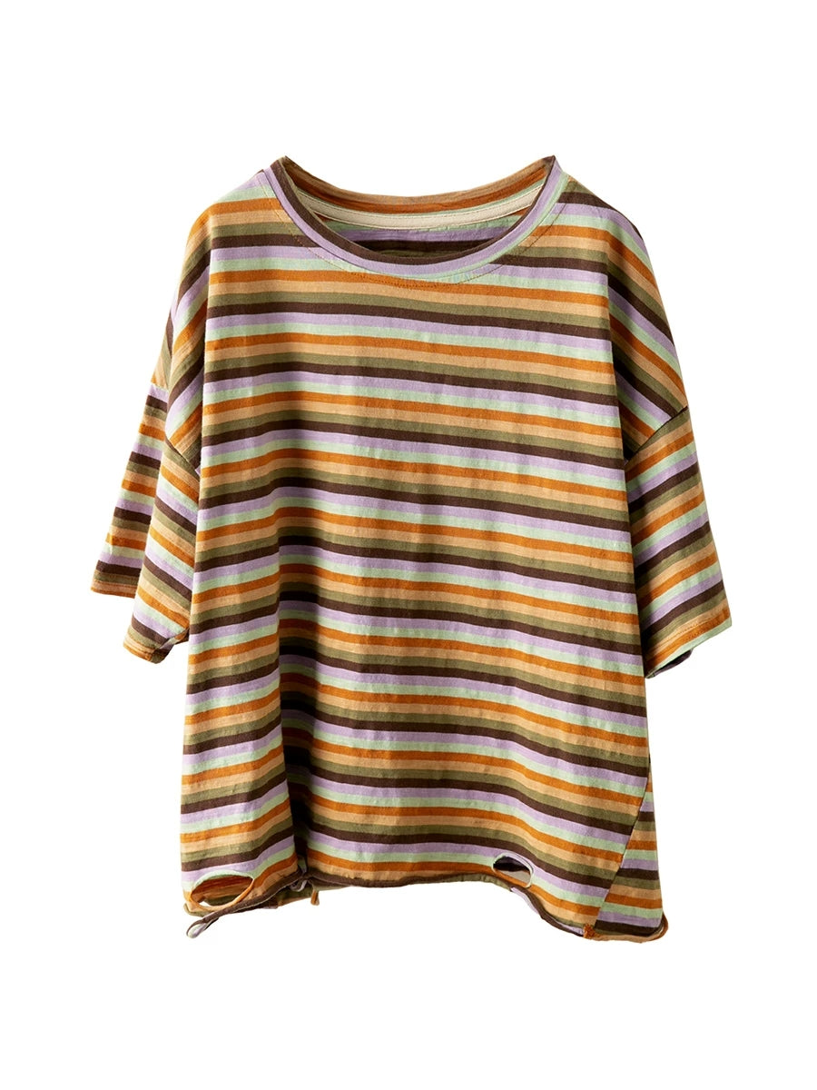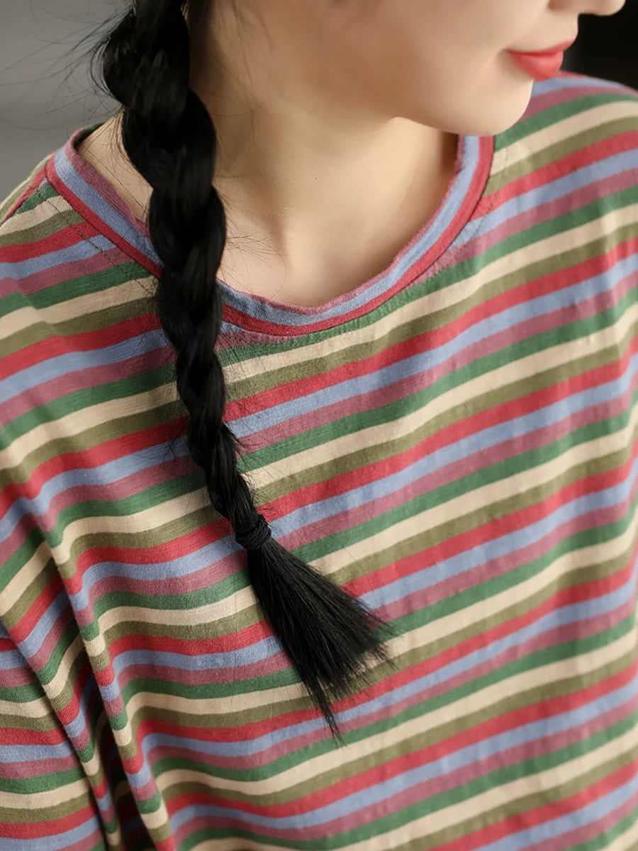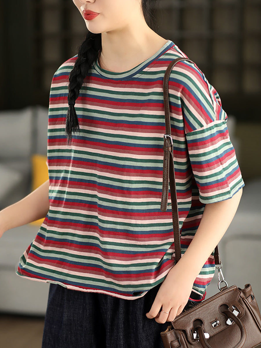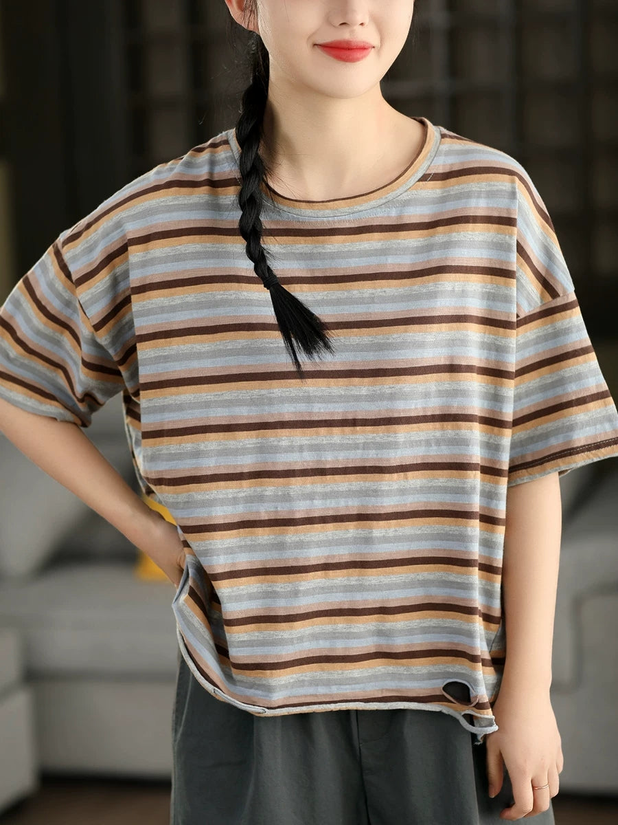 Women Summer Stripe O-Neck Cotton T-Shirt