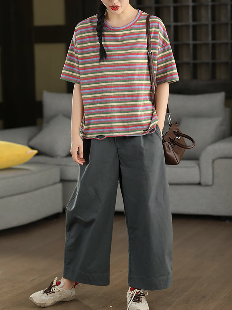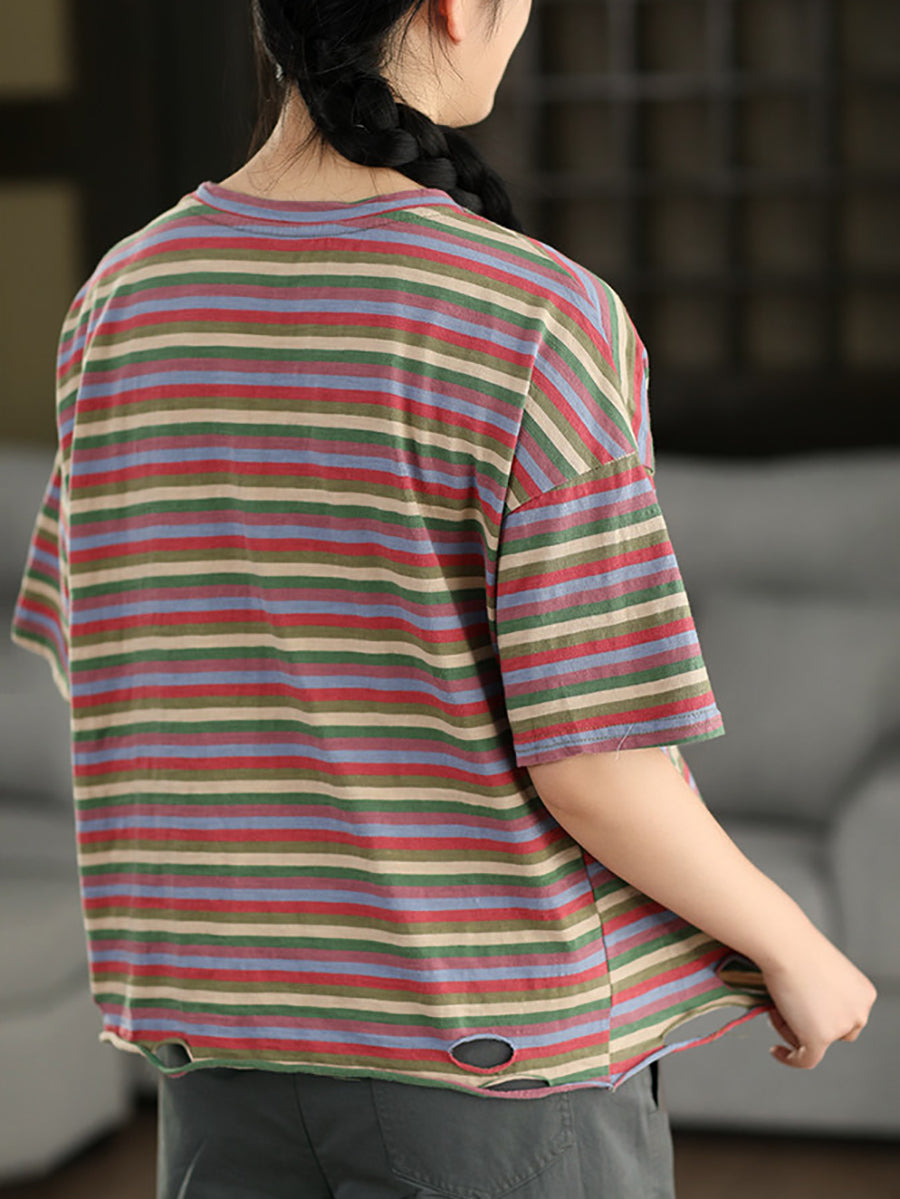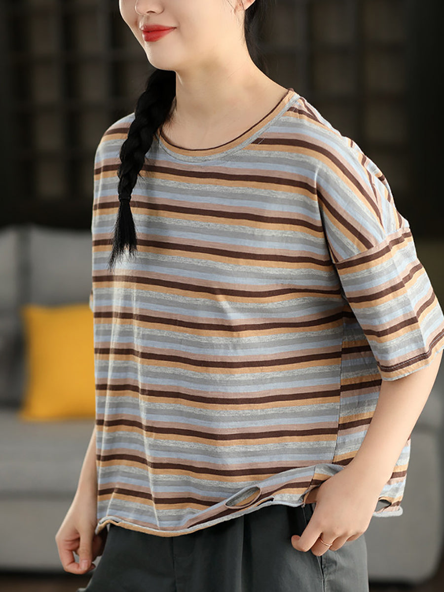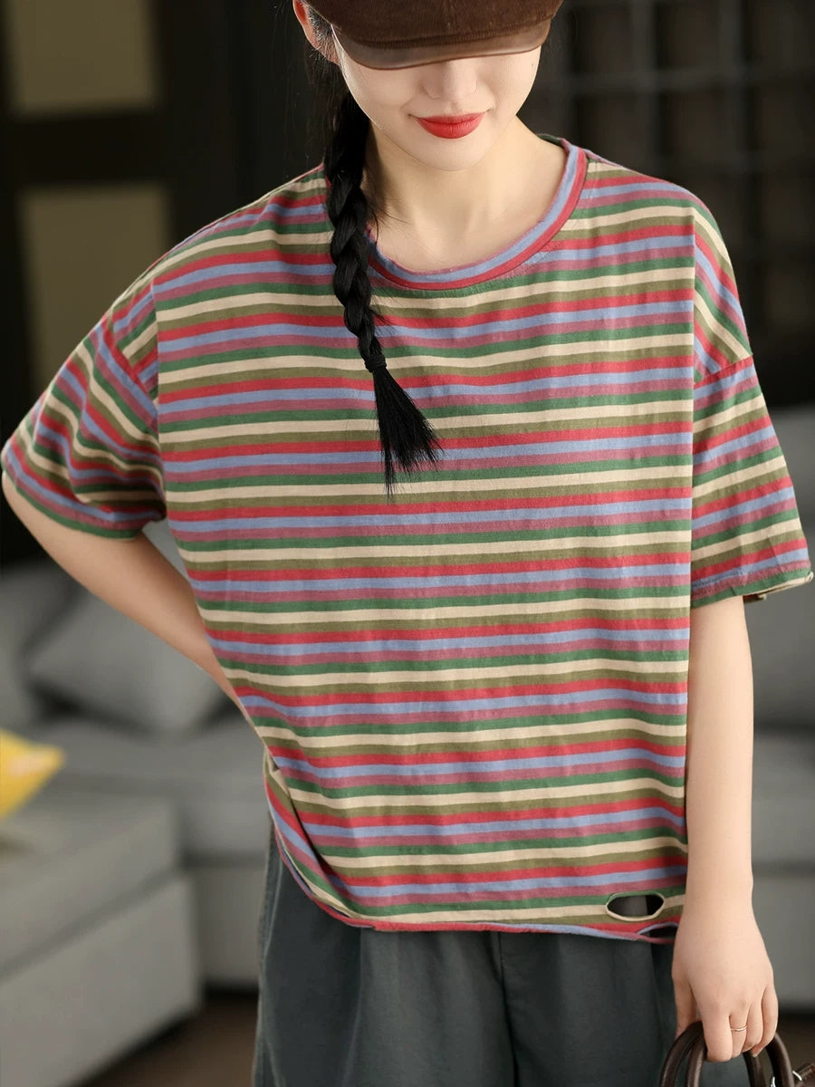 Women Summer Stripe O-Neck Cotton T-Shirt