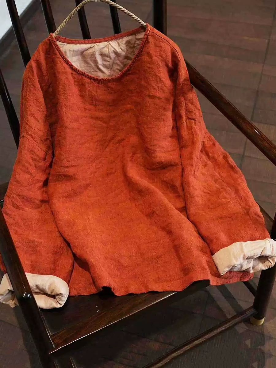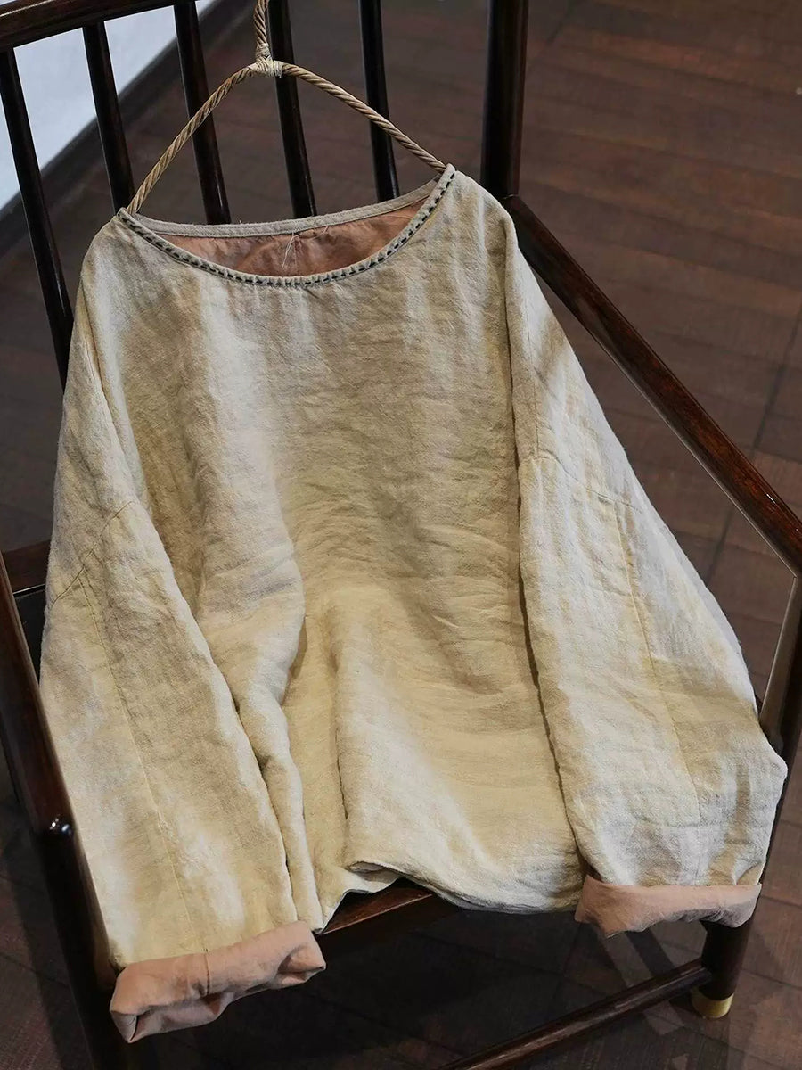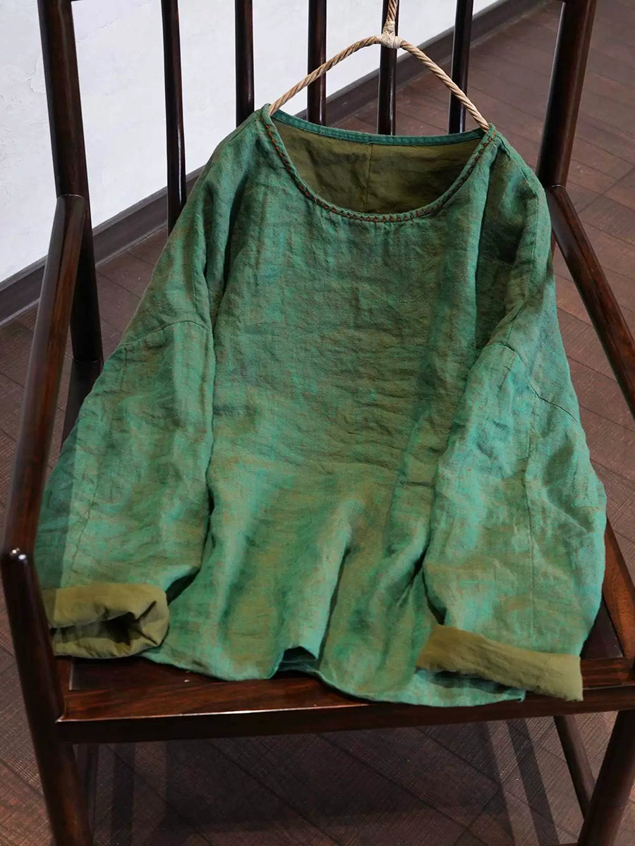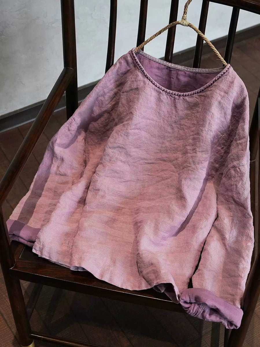 Women Spring Artsy Pure Color O-Neck Linen Blouse