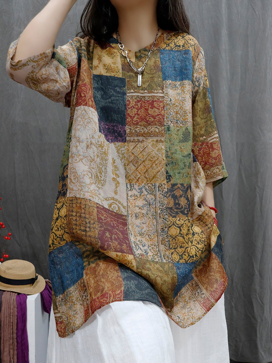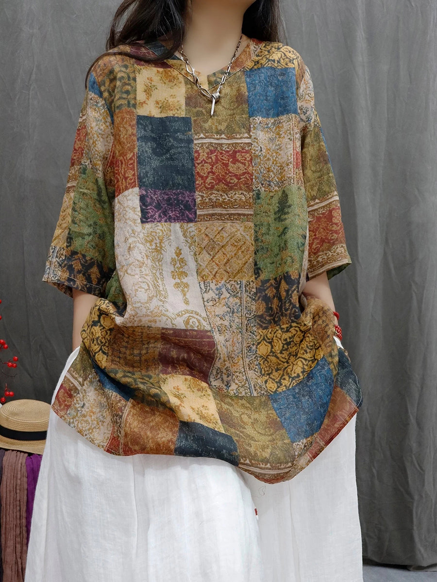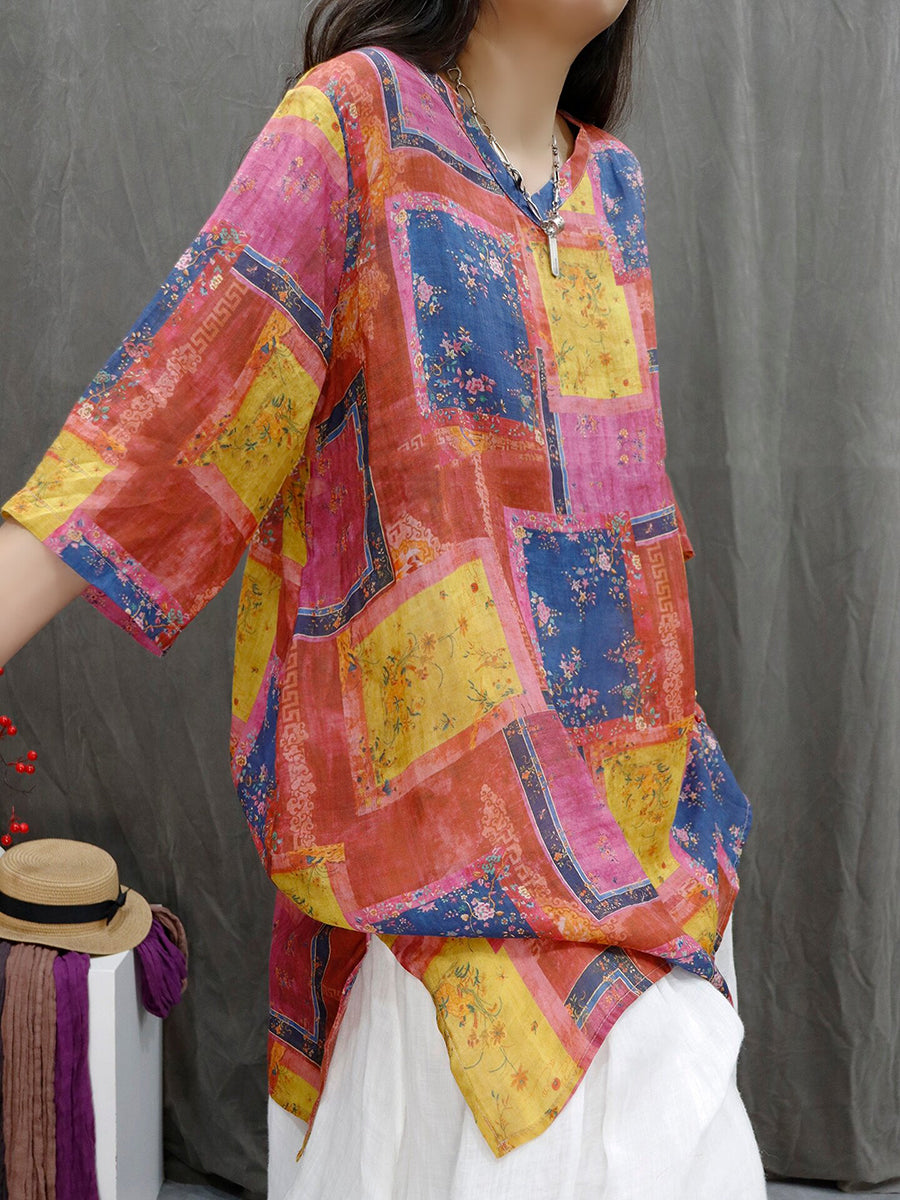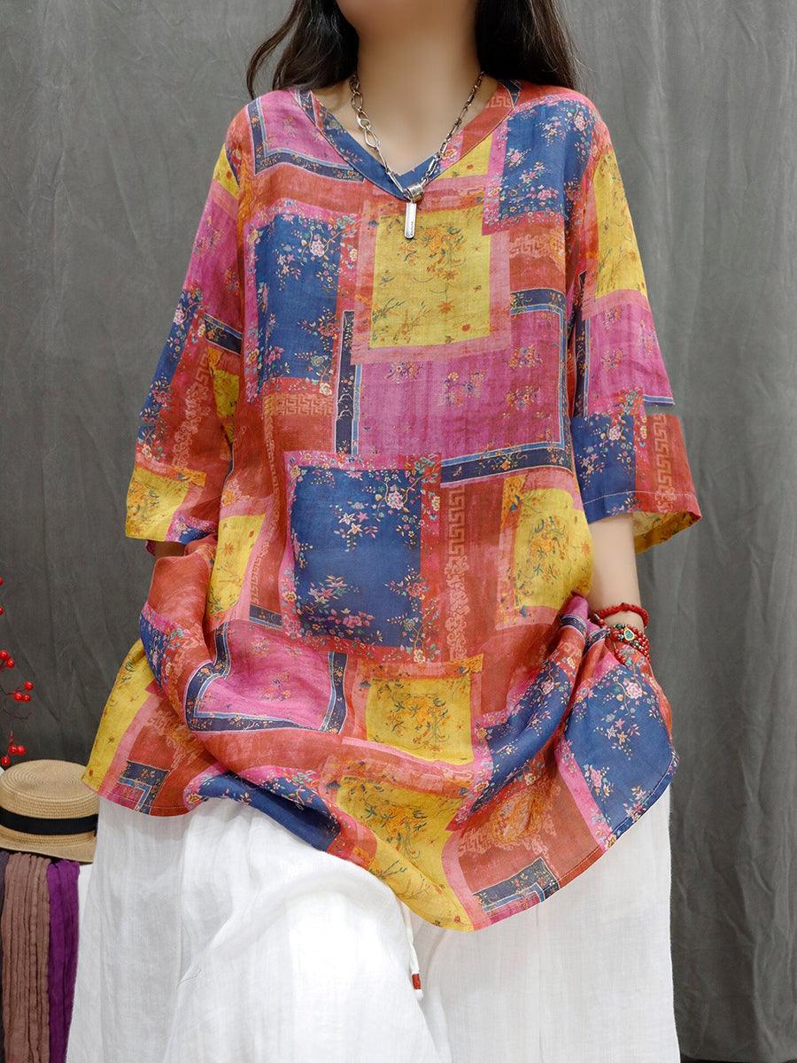 Women Summer Patchwork V-Neck 100%Ramie Blouse