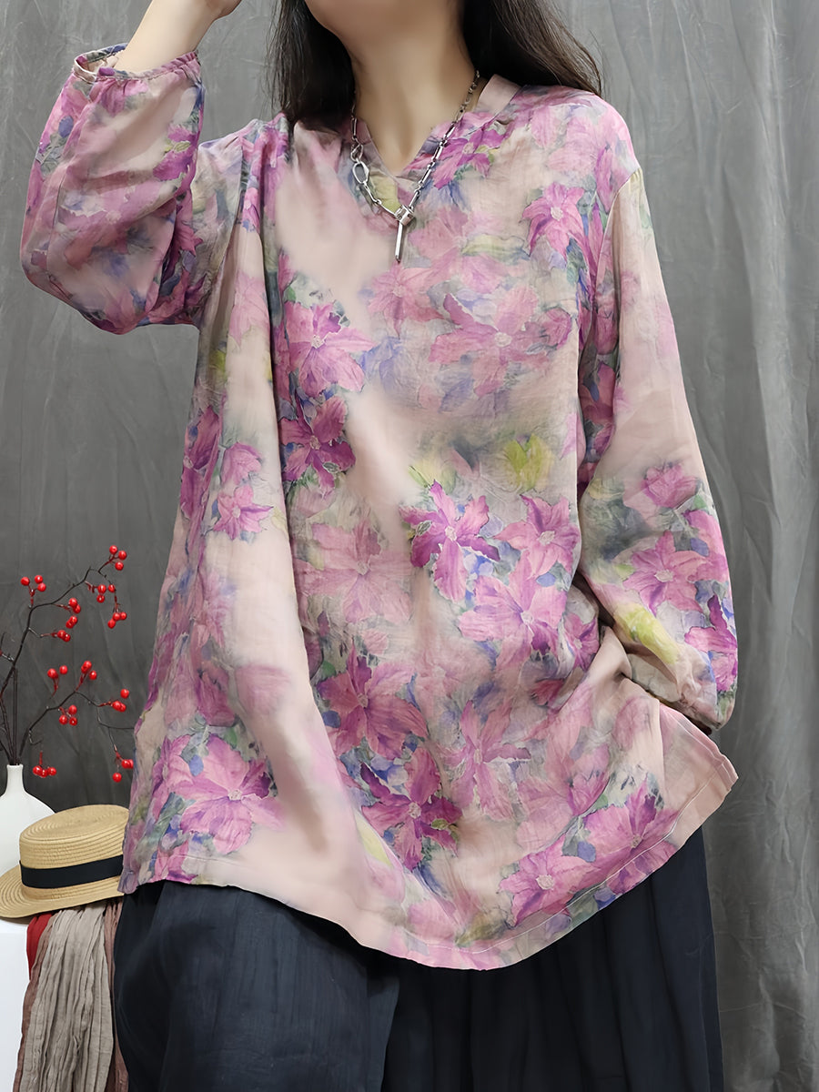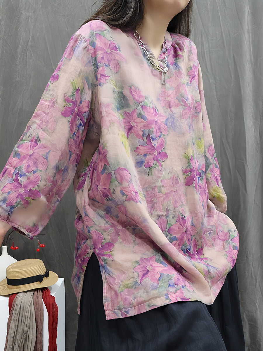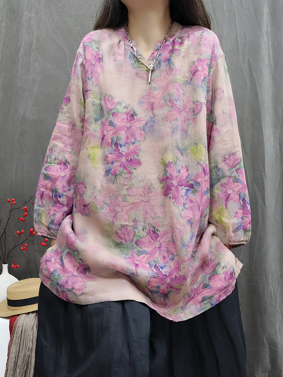 Women Artsy Spring Flower V-Neck 100%Ramie Blouse