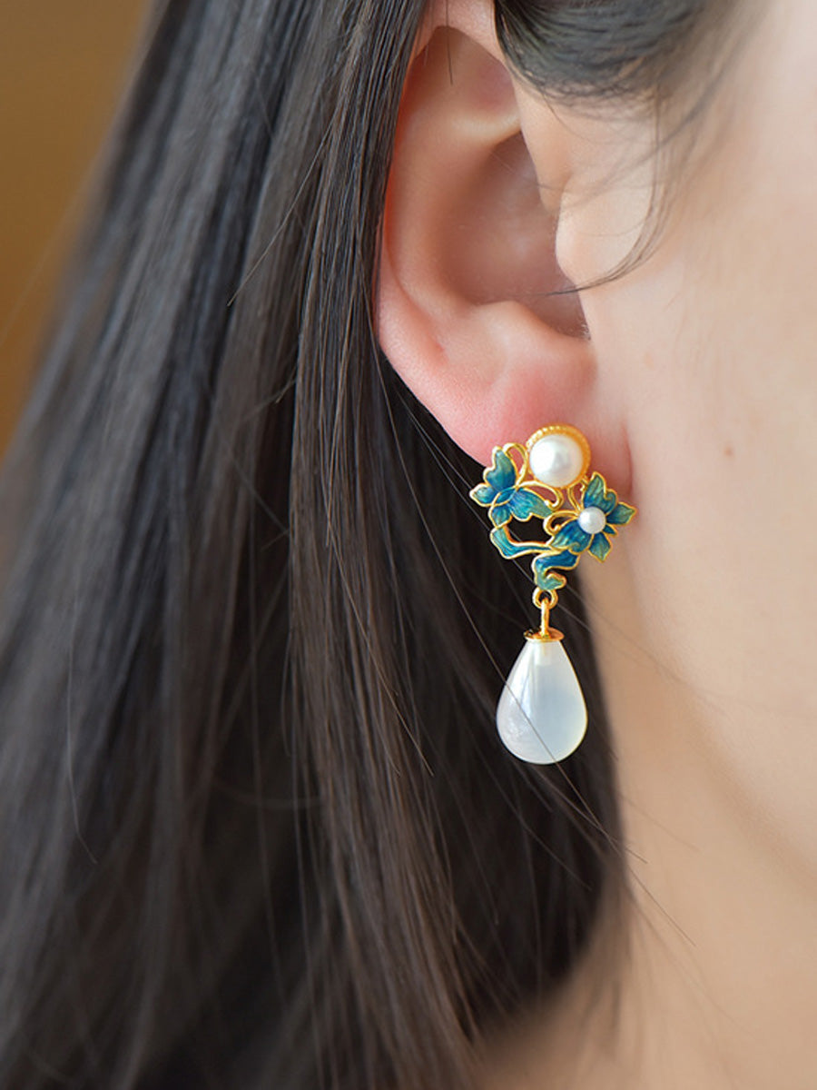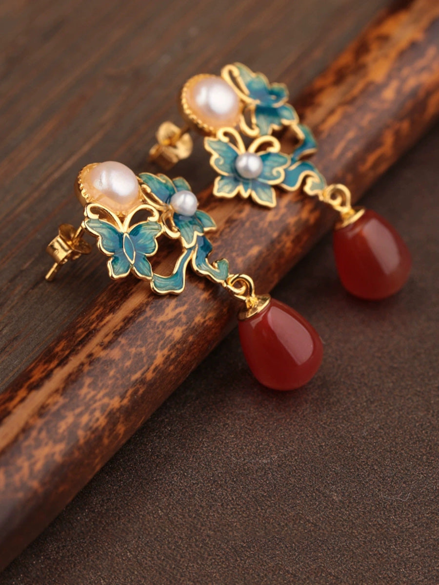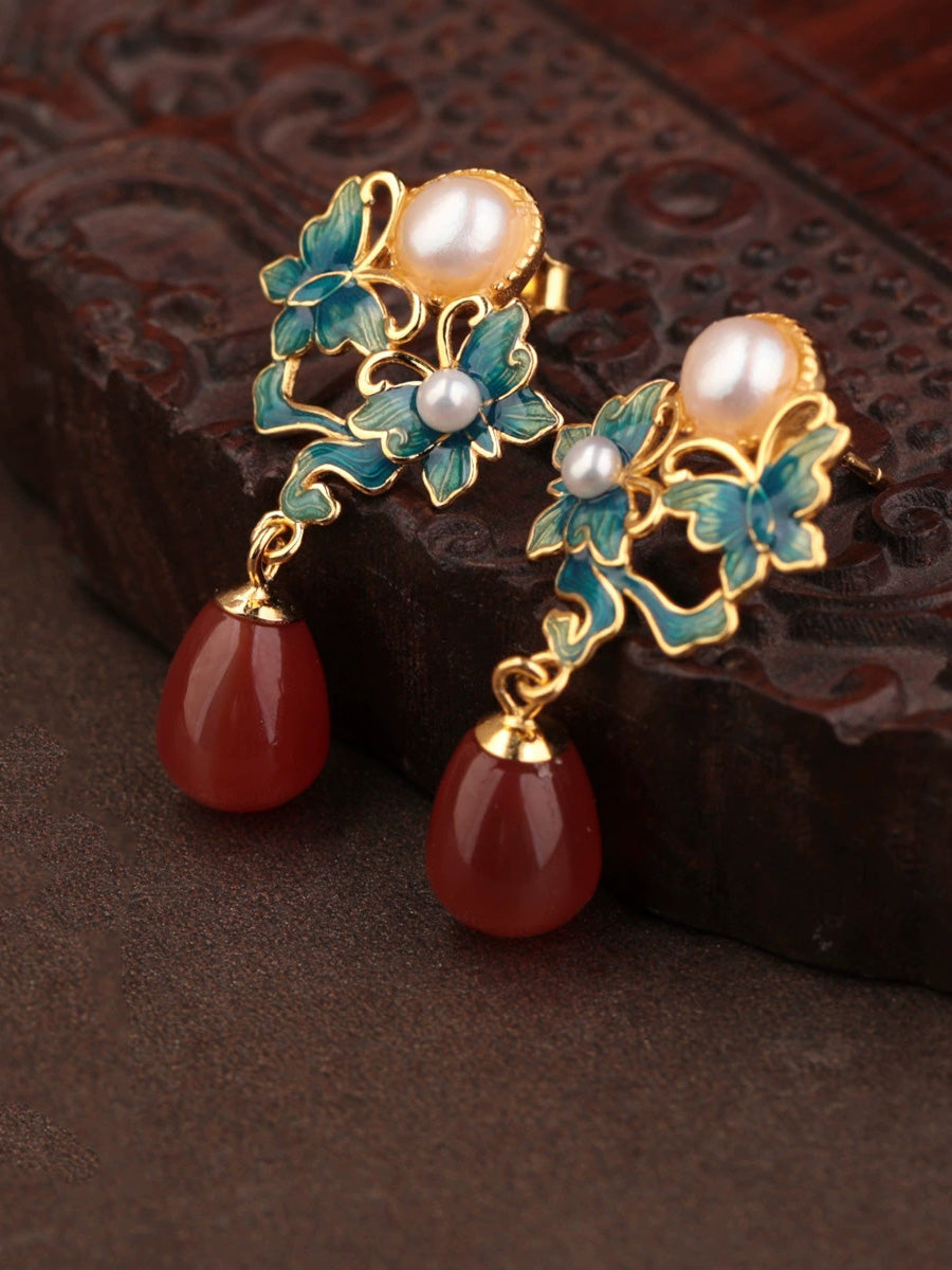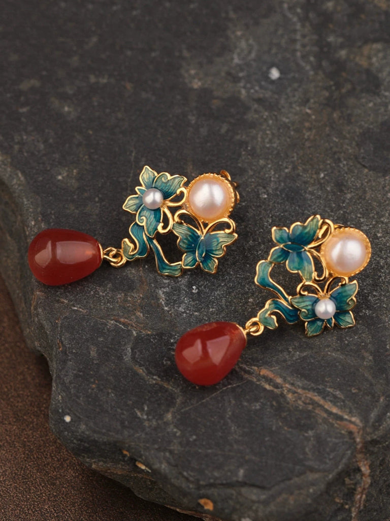 Women Ethnic Enamel Butterfly S925Silver Pearl Agate Earrings