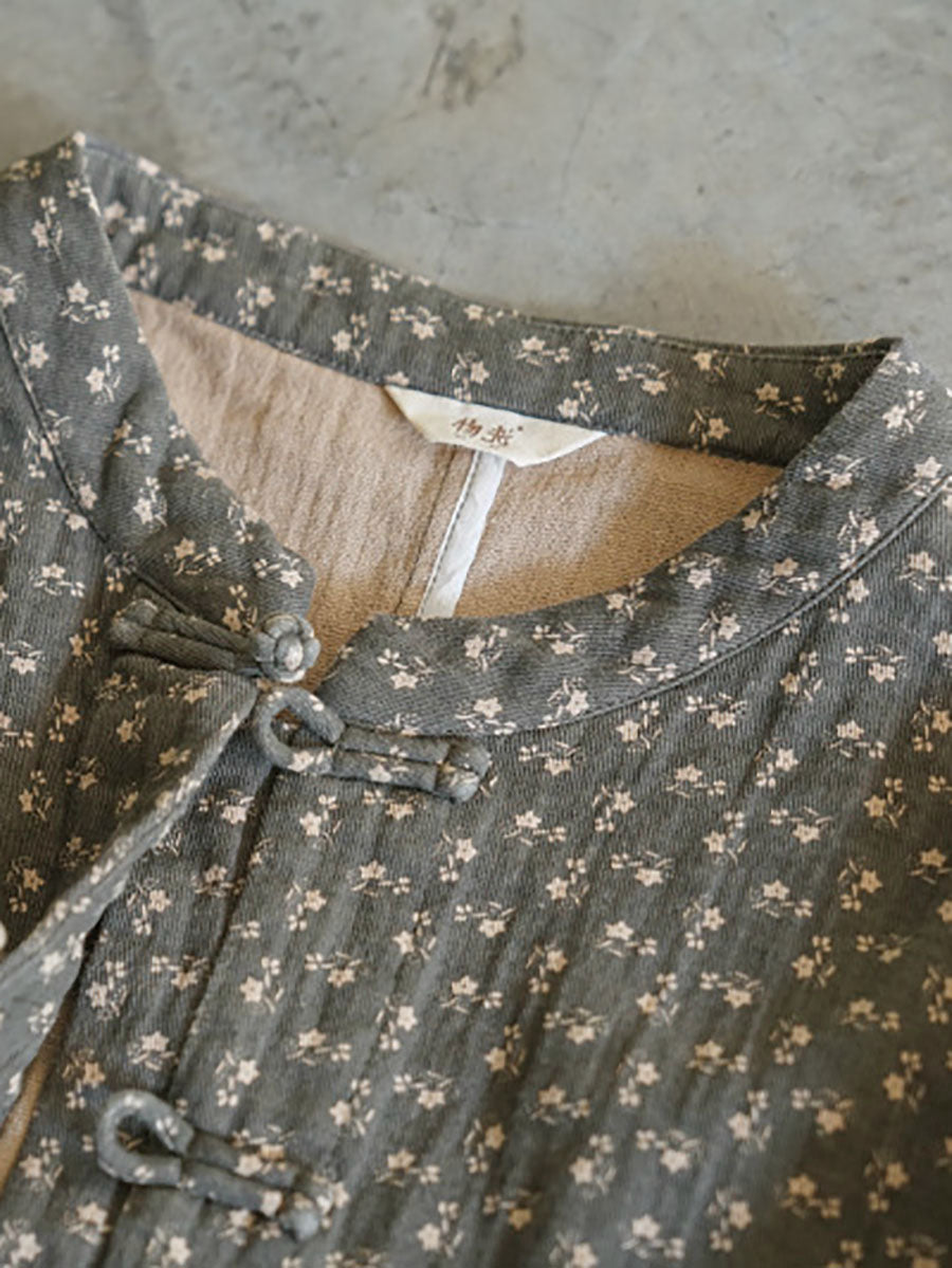 This coat is made of cotton and features a floral pattern. It has a stand collar and raglan style full length sleeves, giving it a vintage look. Perfect for both spring and autumn seasons.