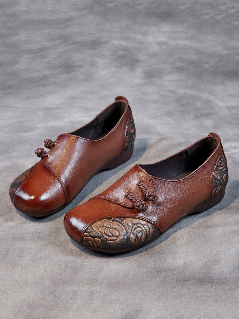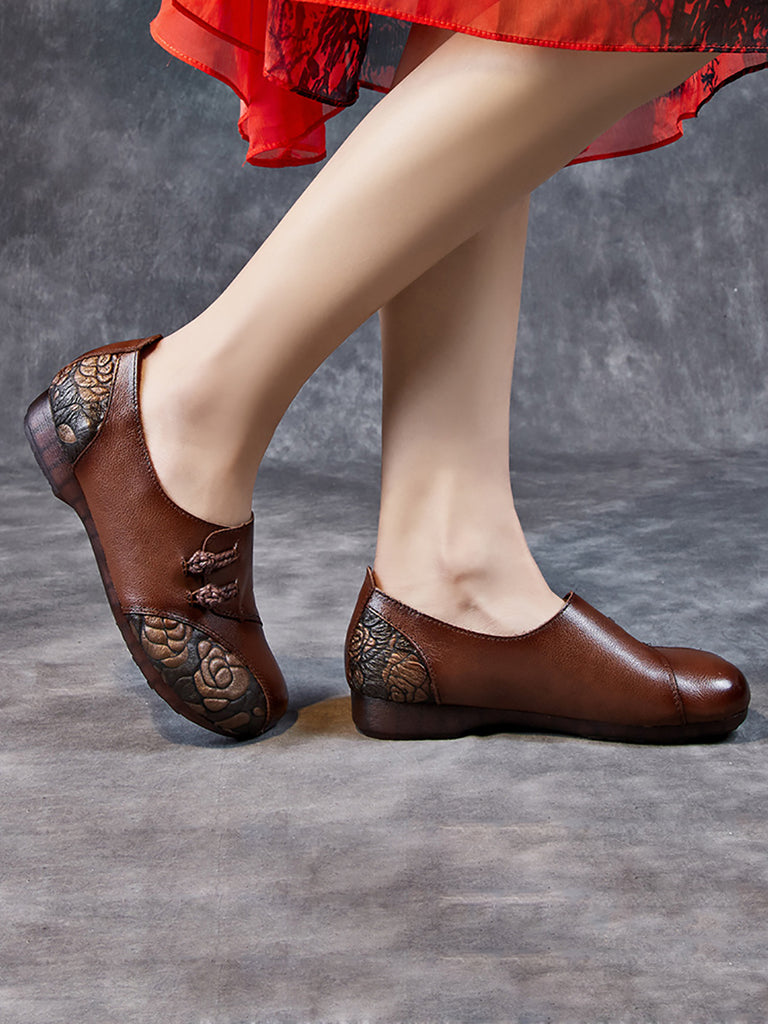 Women Spring Ethnic Flower Leather Spliced Flat Shoes