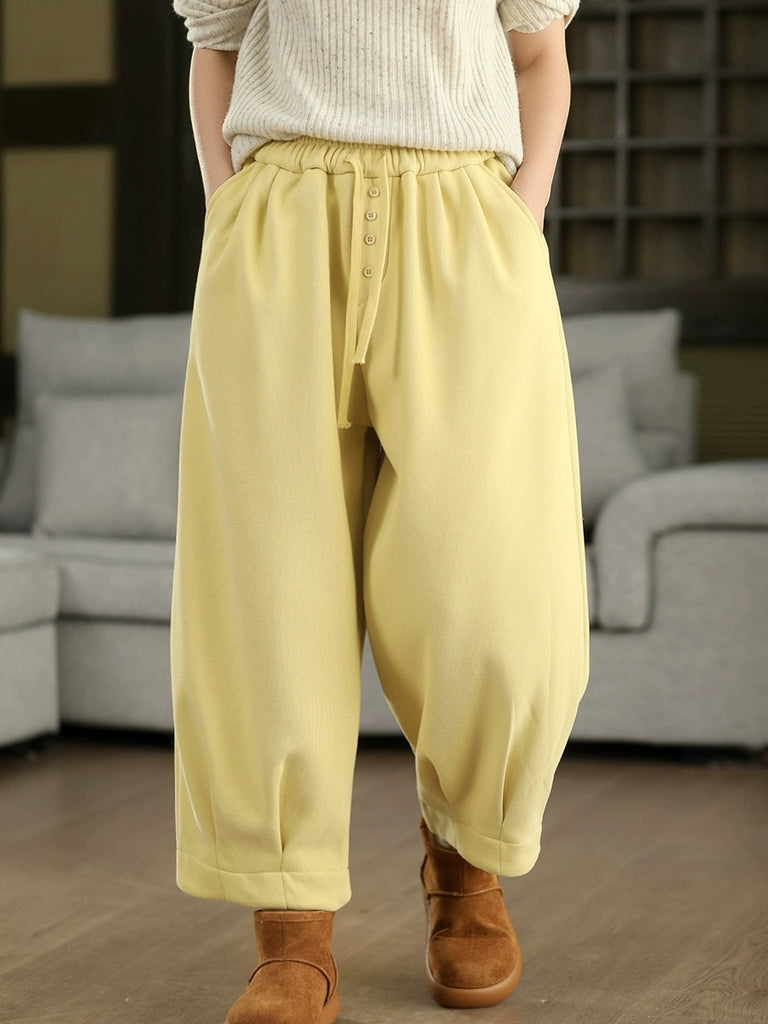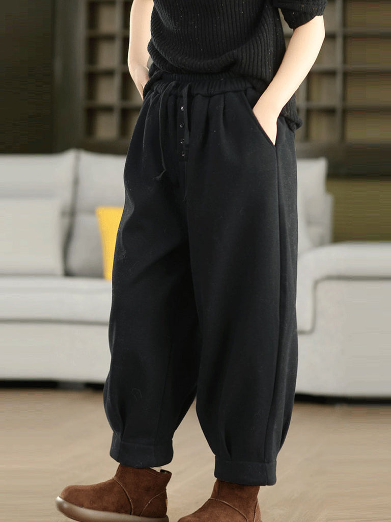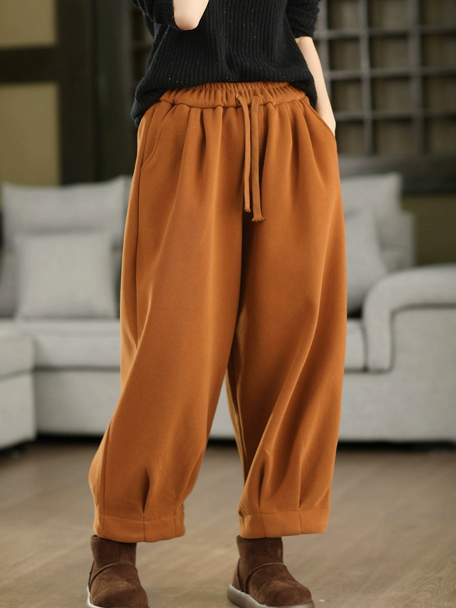 Women Winter Retro Pure Color Fleece-lined Harem Pants