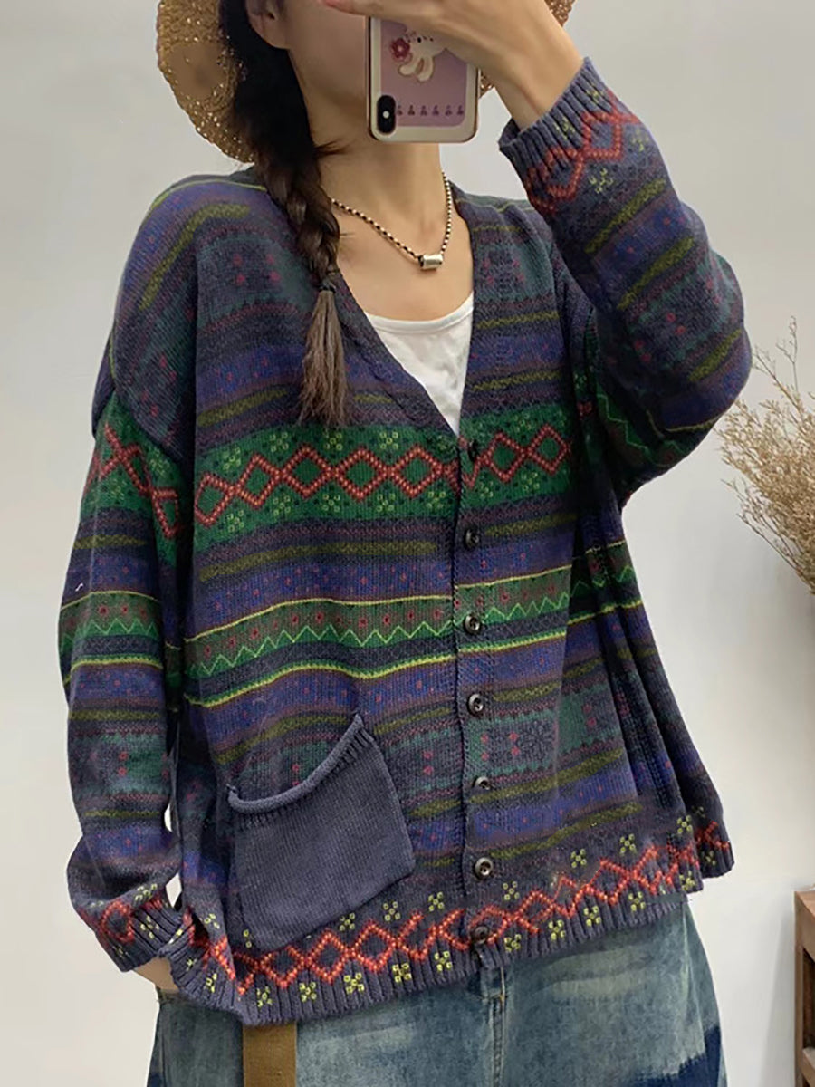 Plus Size Women Autumn Geometric Knitted V-neck Sweater