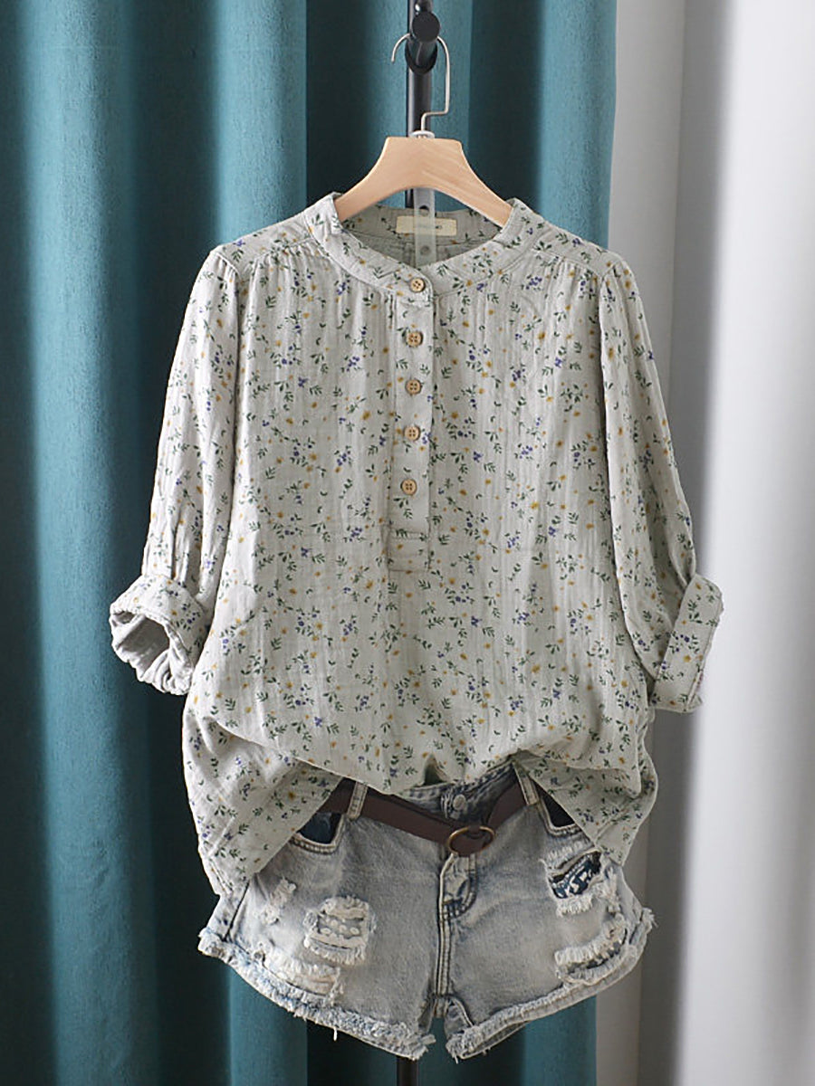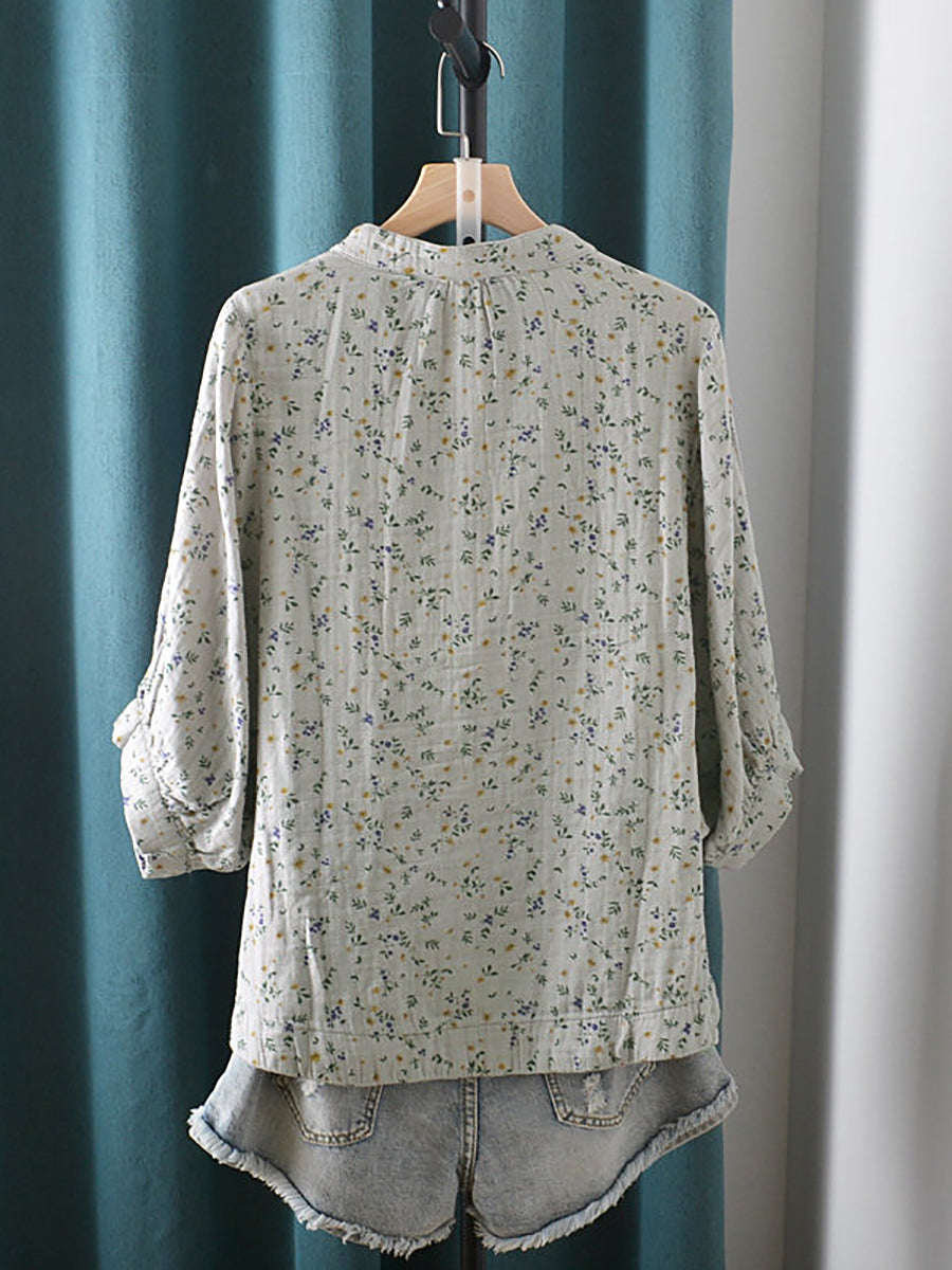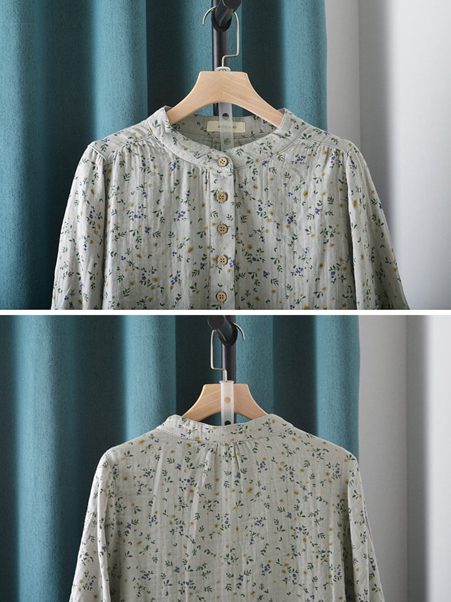 Women Summer Artsy Floral 100%Cotton Stand Collar Blouse