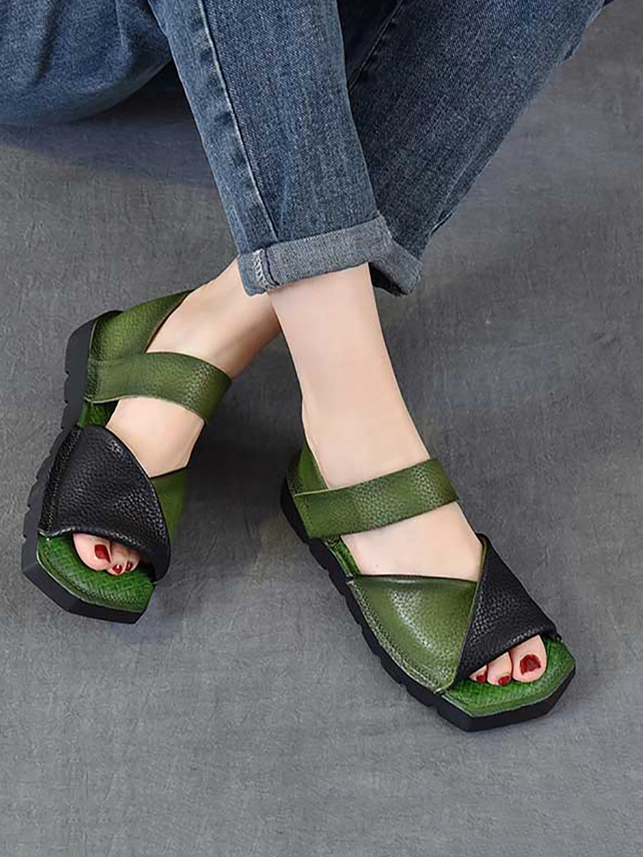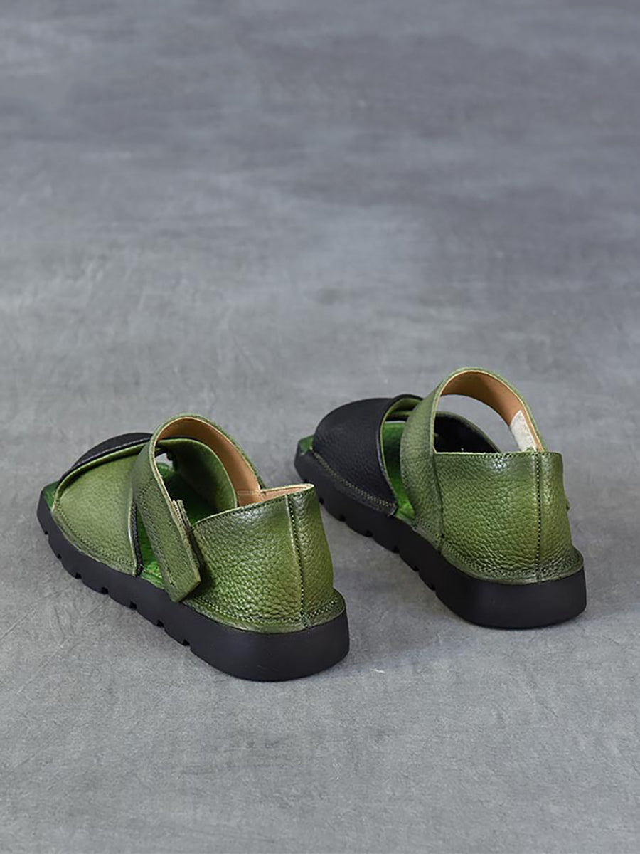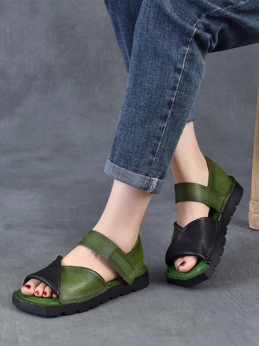 Women Summer Retro Colorblock Leather Flat Sandals