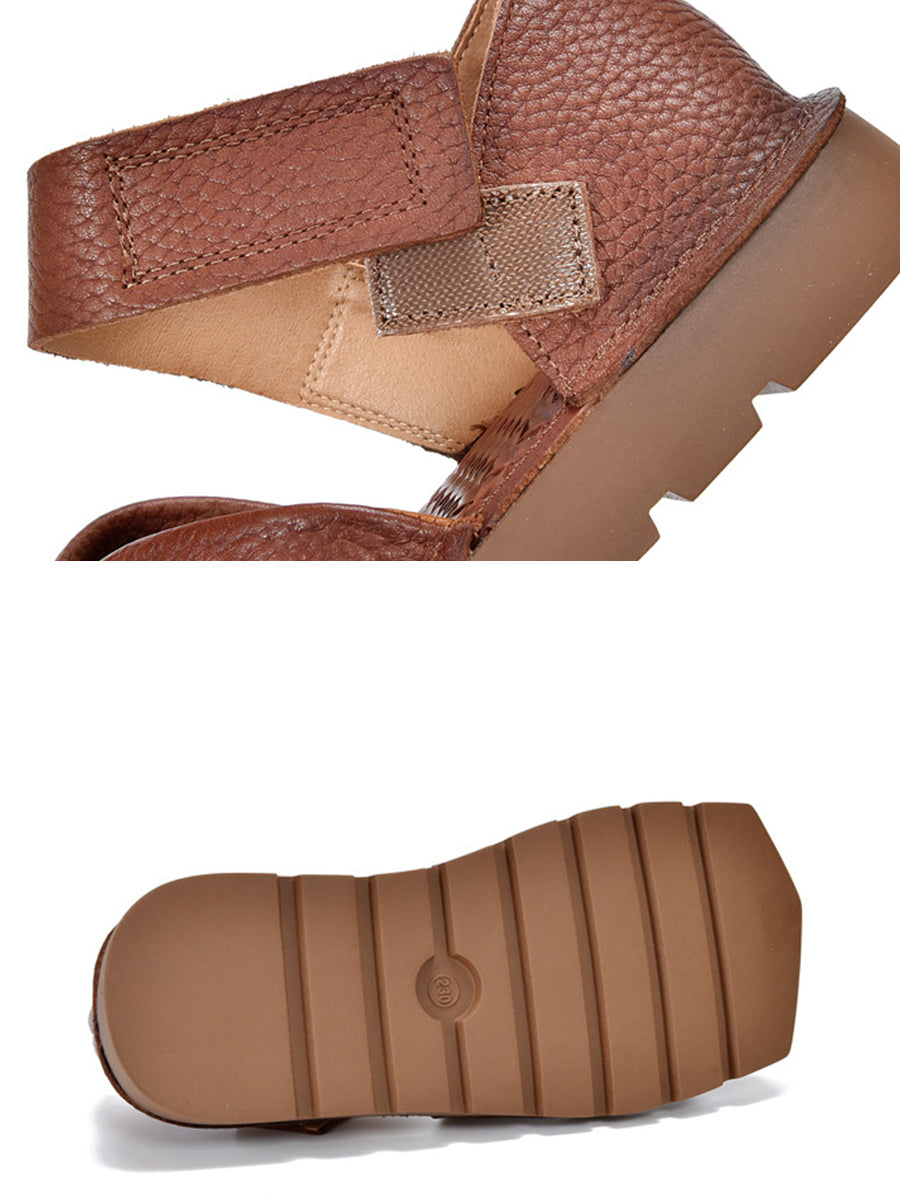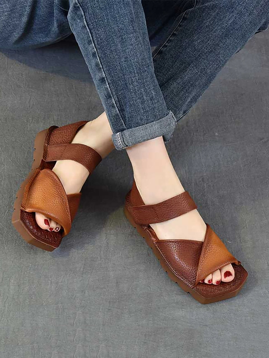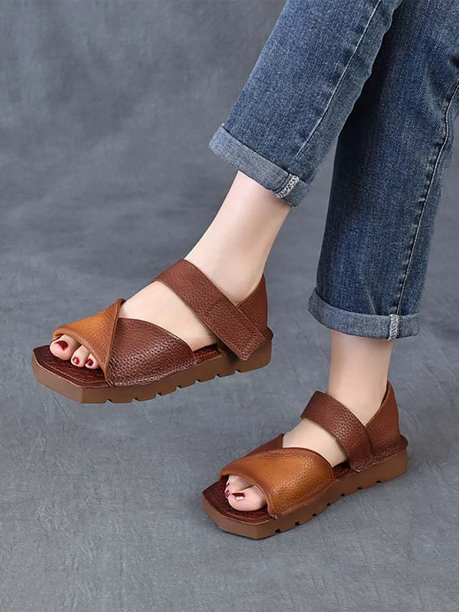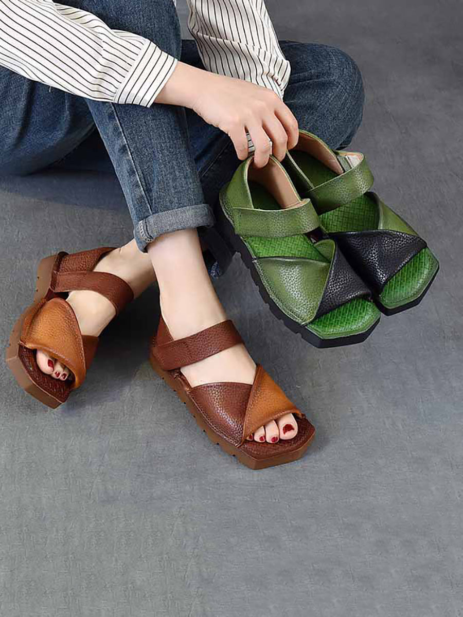 Women Summer Retro Colorblock Leather Flat Sandals