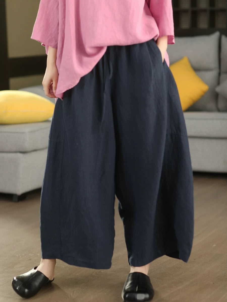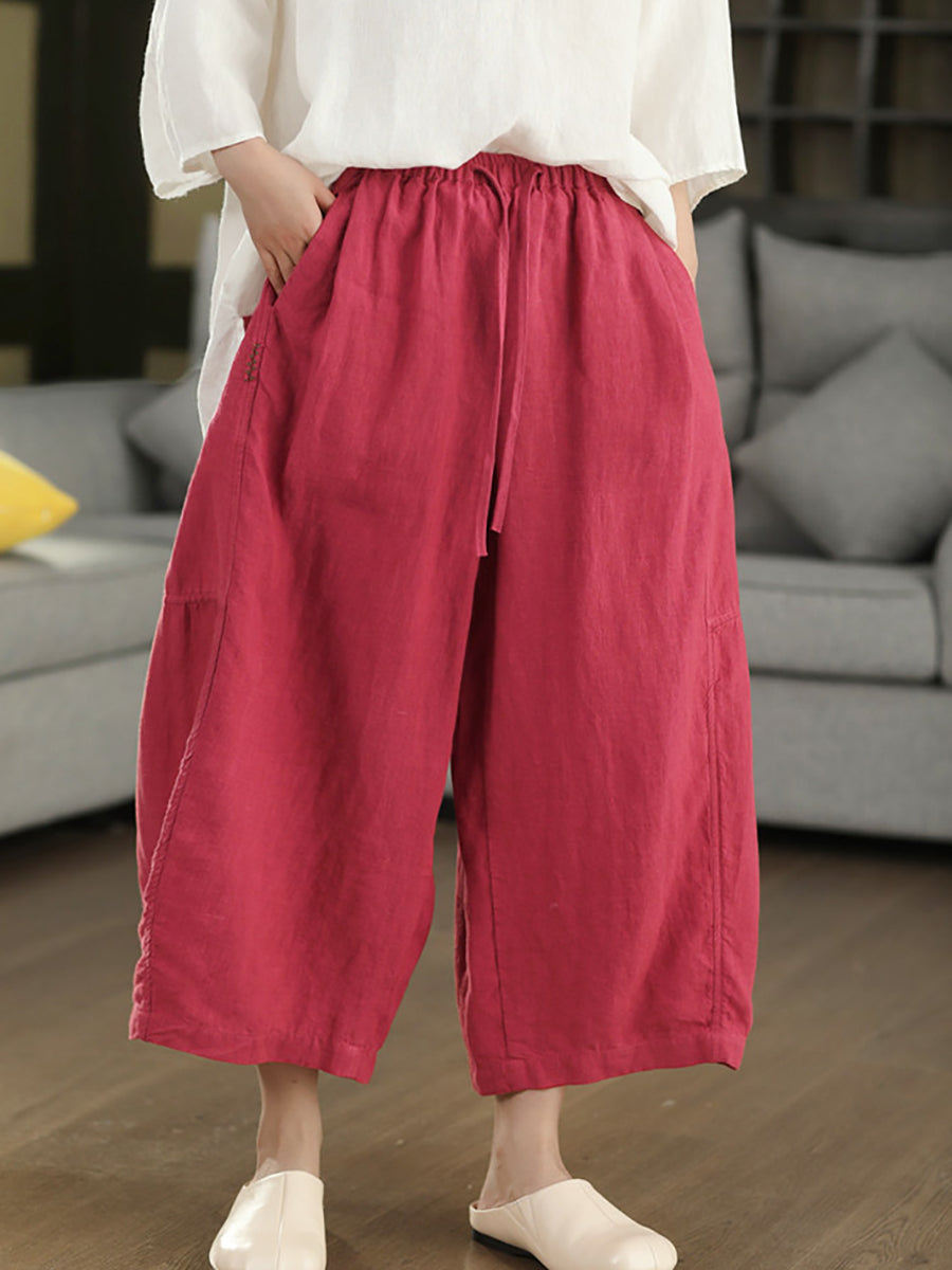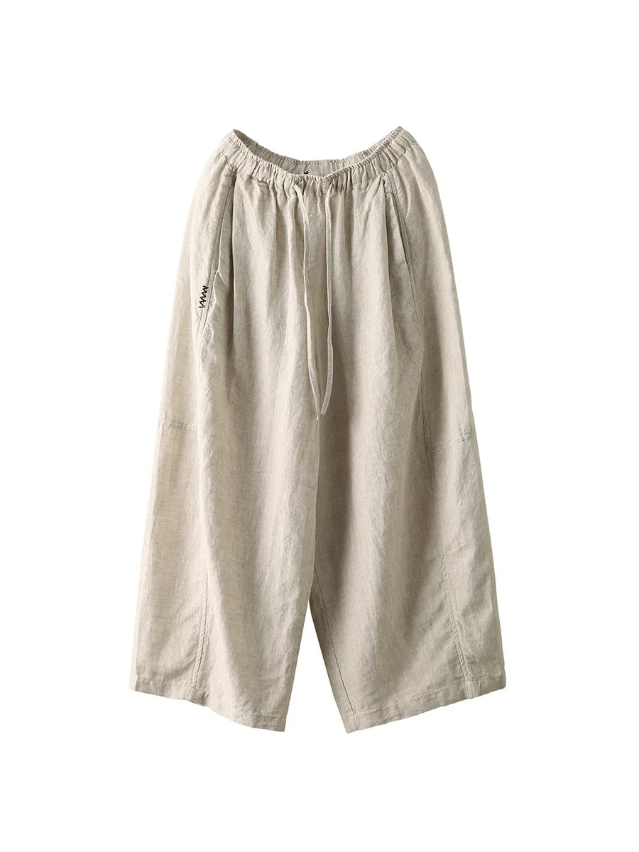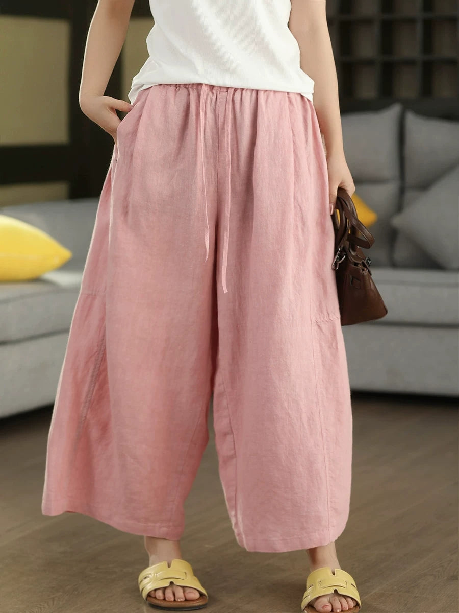 Women Summer Retro Pure Color 100%Linen Wide-leg Pants