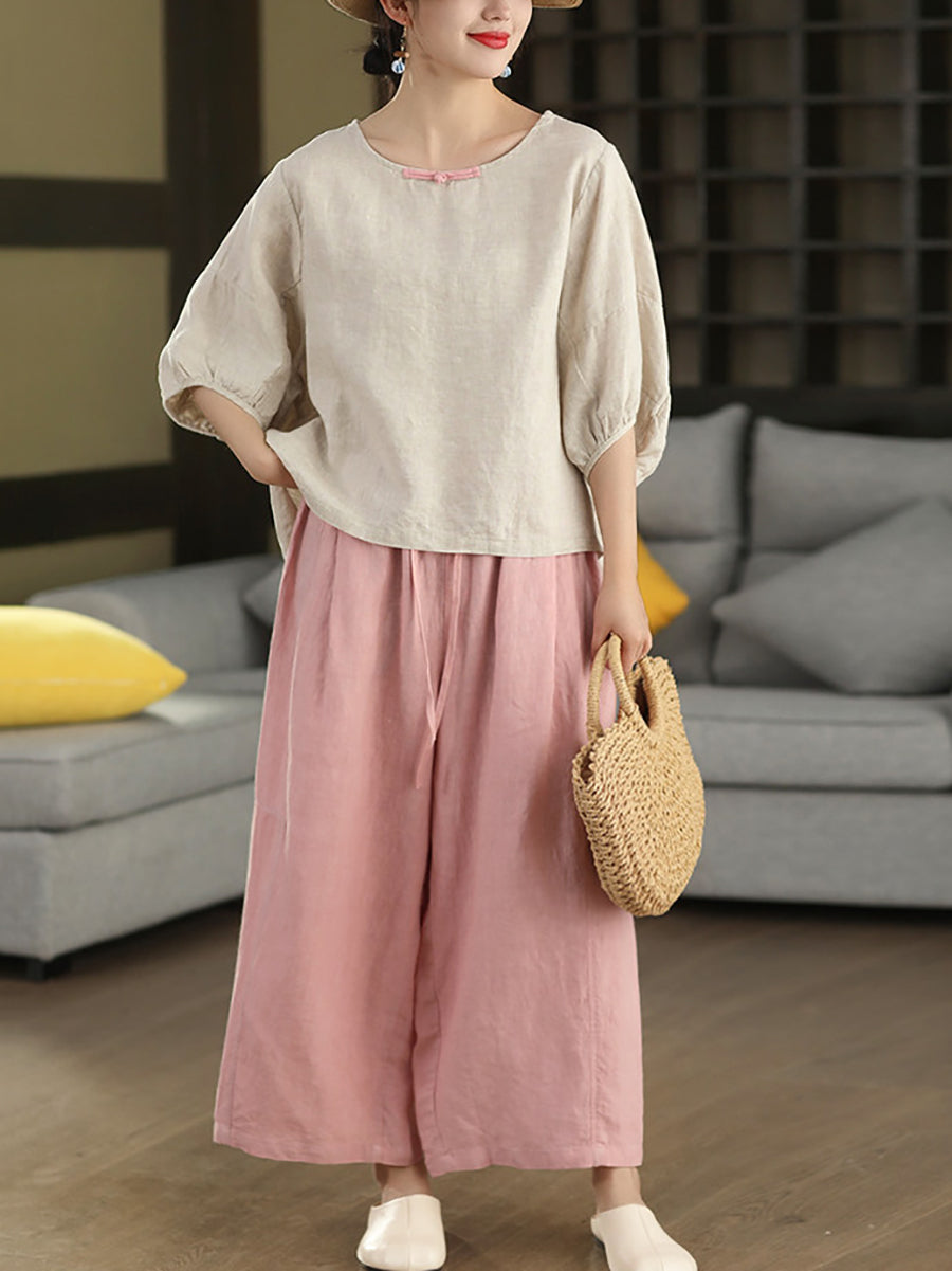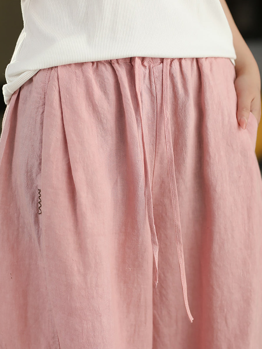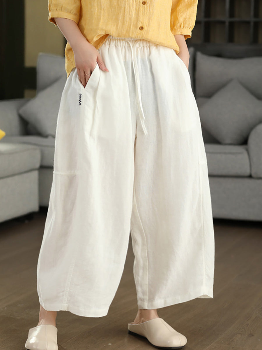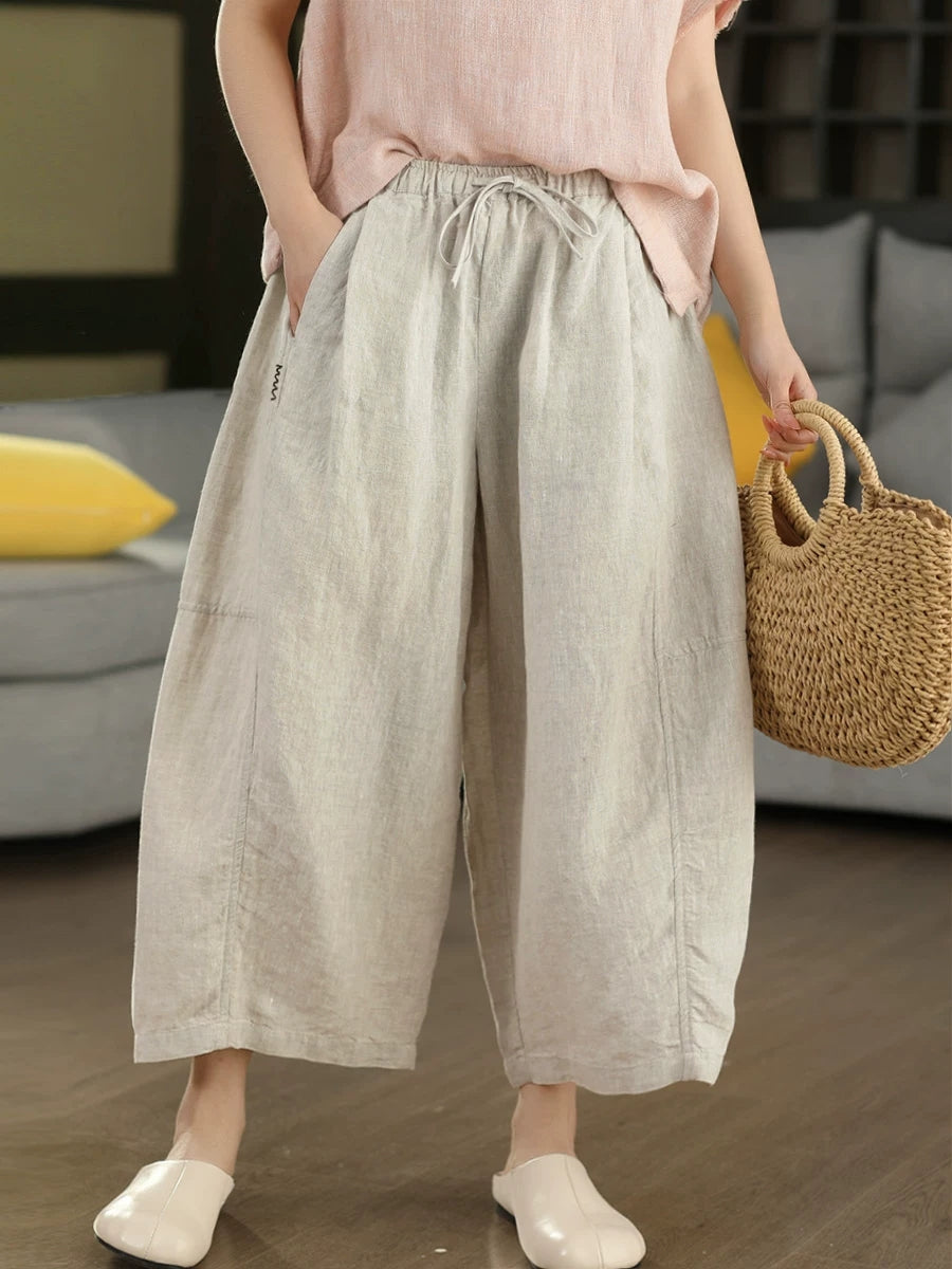 Women Summer Retro Pure Color 100%Linen Wide-leg Pants