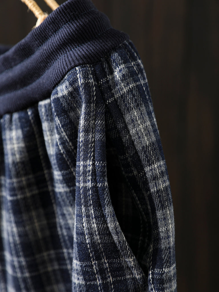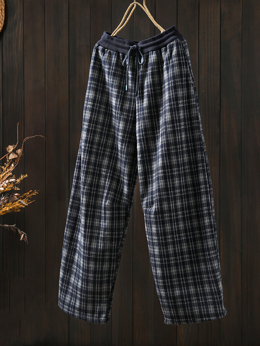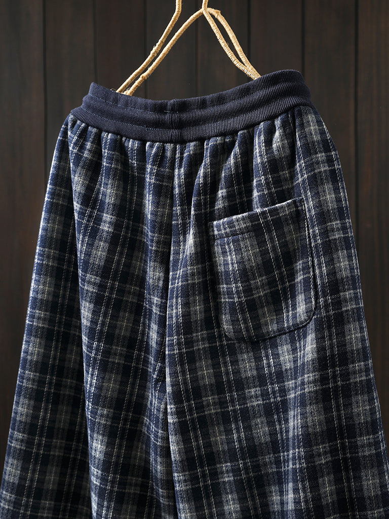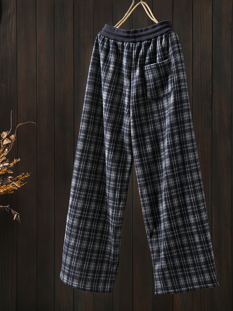 Women Winter Retro Plaid Fleece-lined Wide-leg Pants