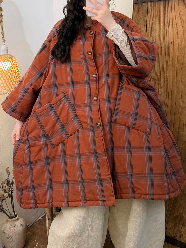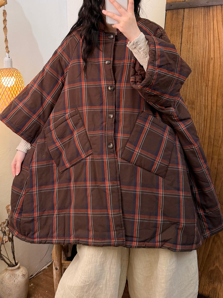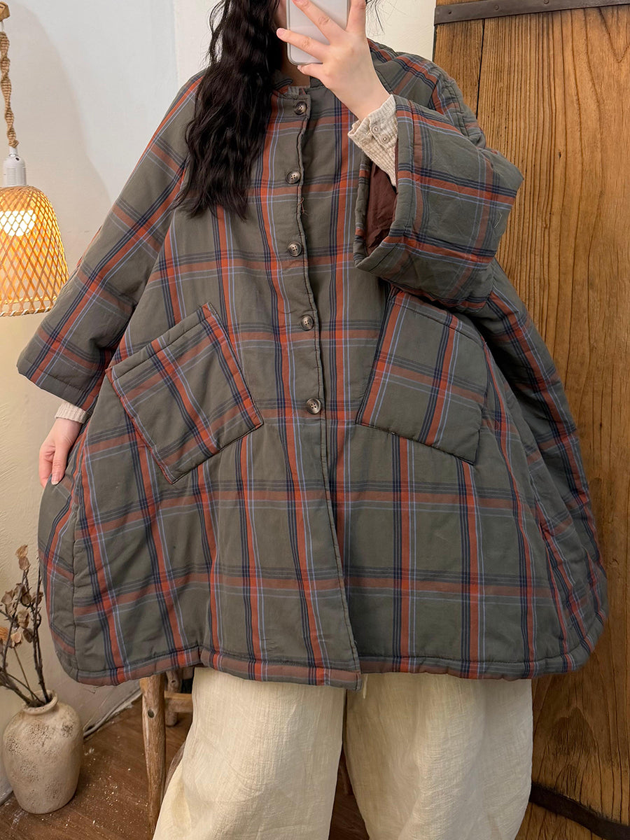 Women Winter Retro Plaid Stand Collar Padded Overcoat