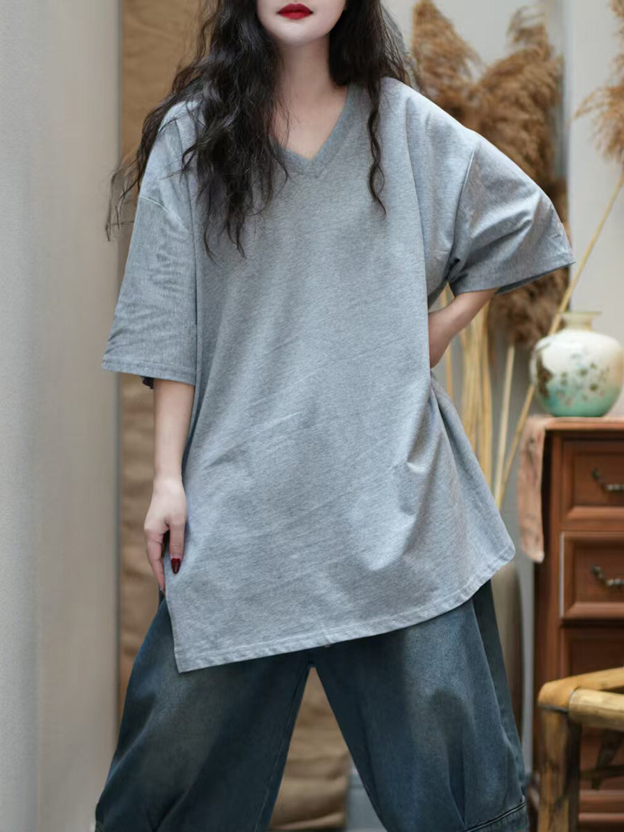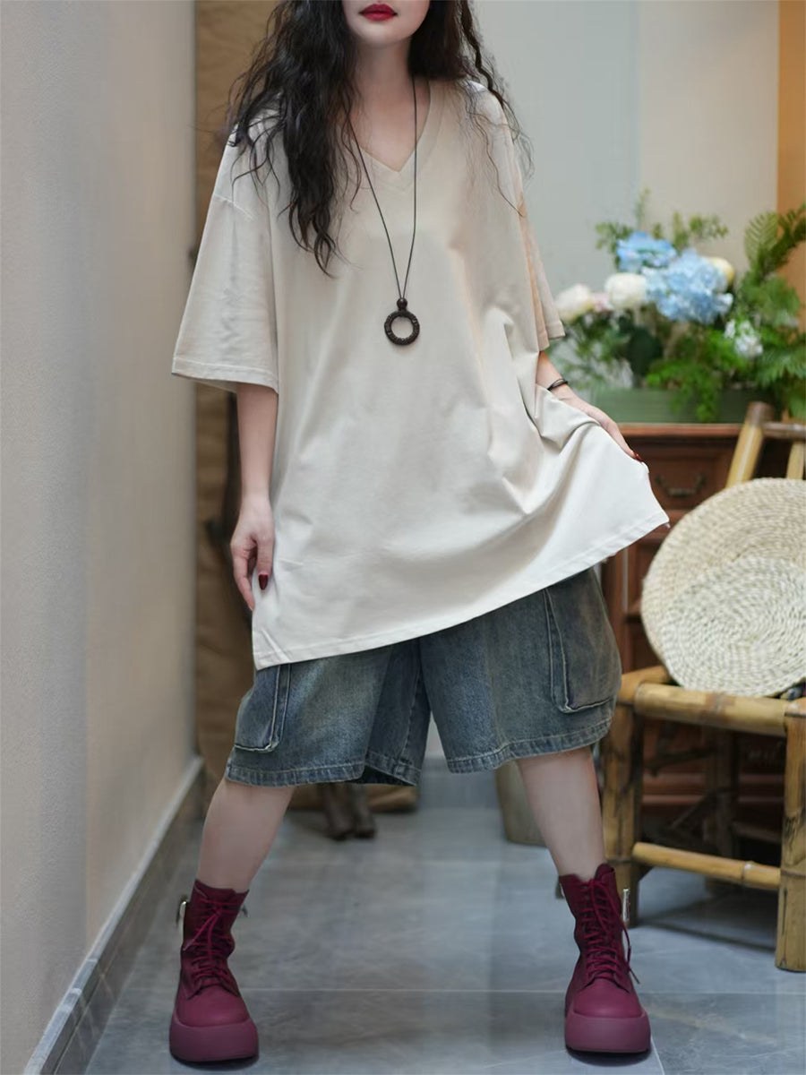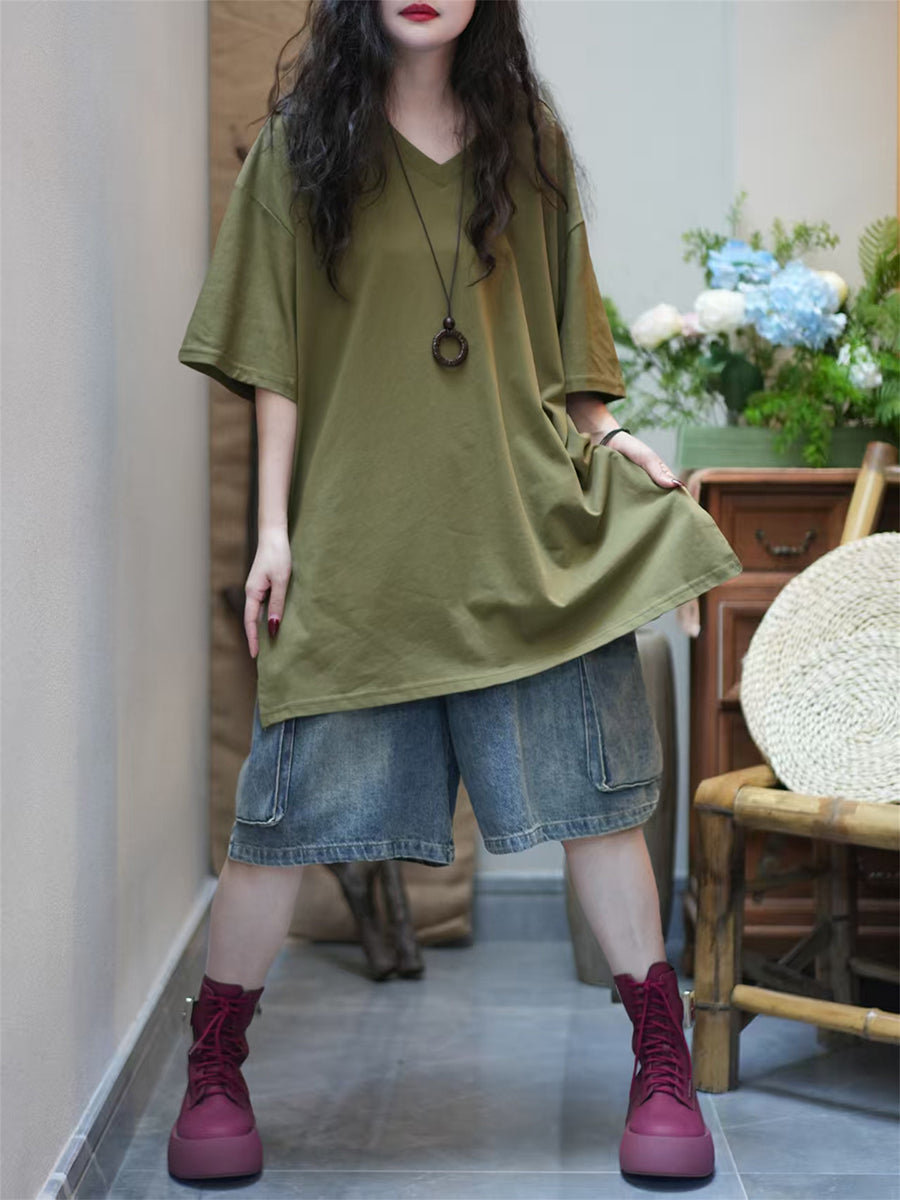 Women Summer Artsy Pure Color V-Neck Cotton T-Shirt