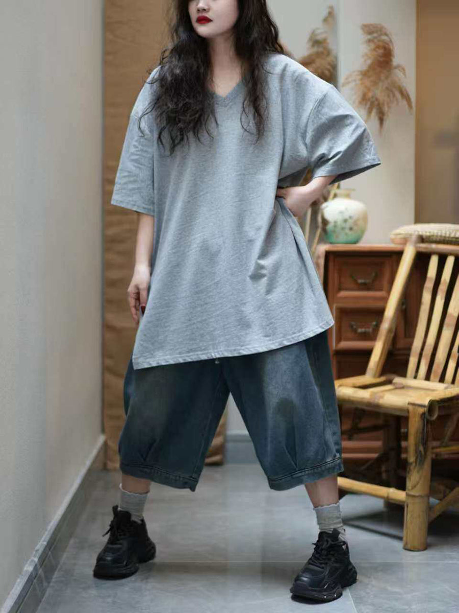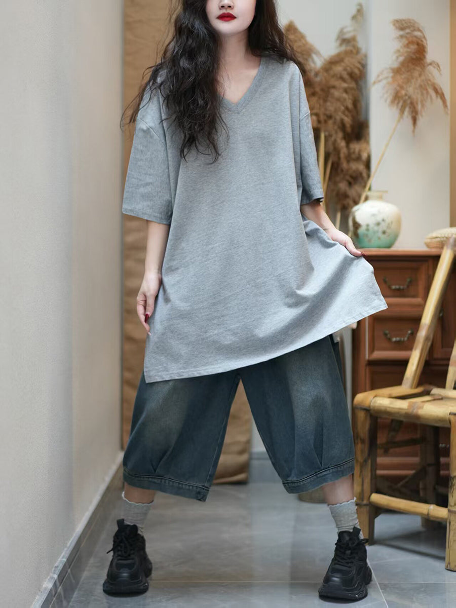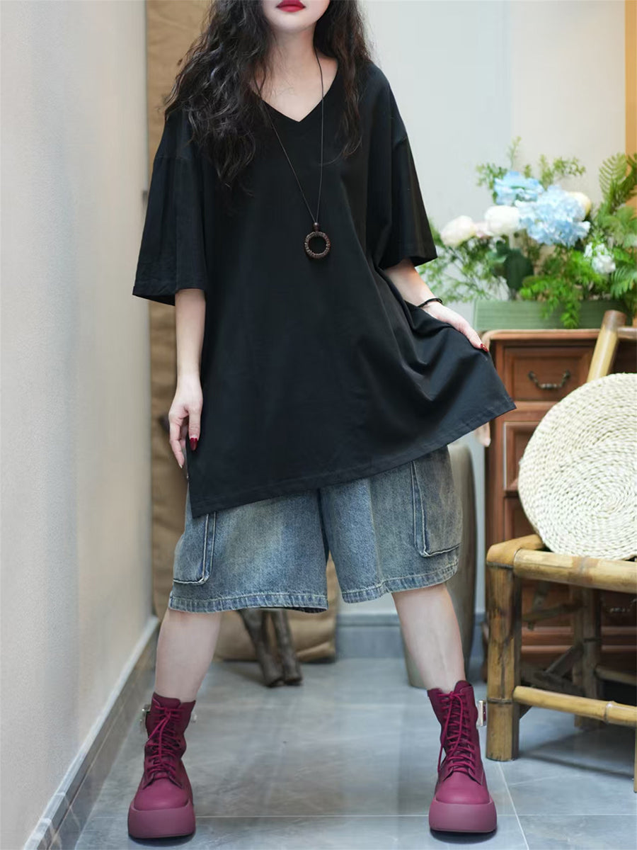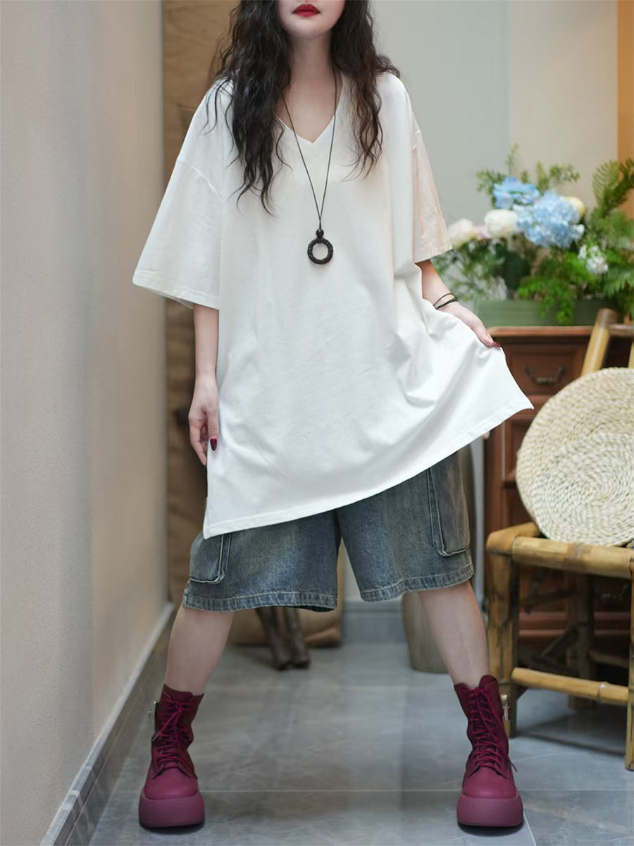 Women Summer Artsy Pure Color V-Neck Cotton T-Shirt