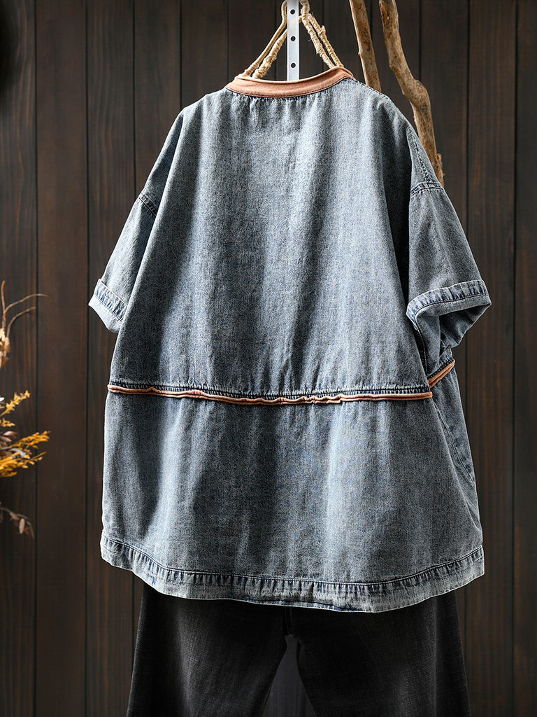 Women Summer Casual Colorblock O-Neck Denim Shirt
