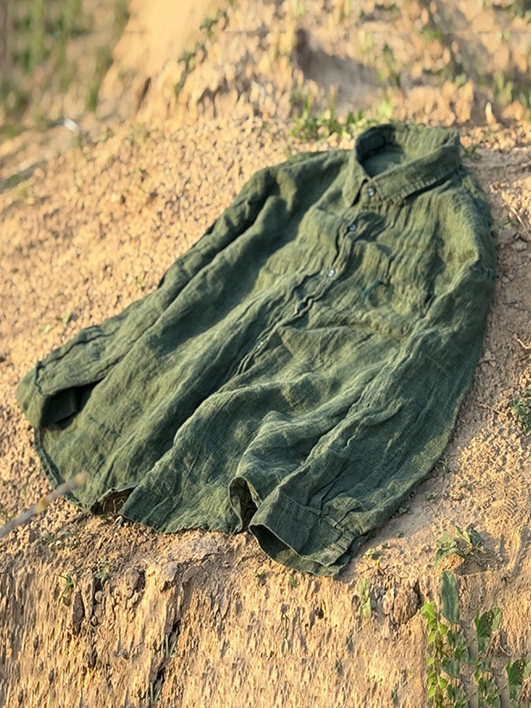 Women Summer Retro Pure Color Turn-down Collar Linen Shirt