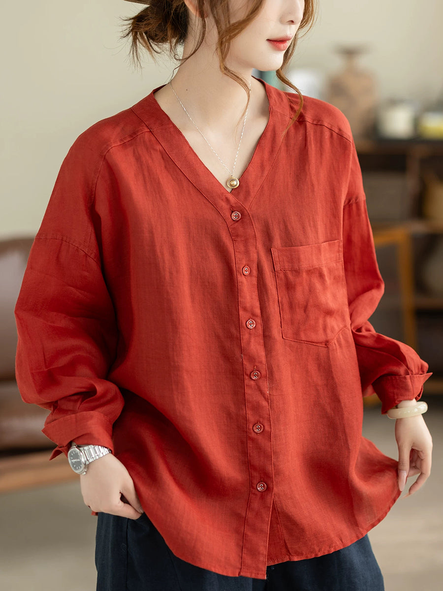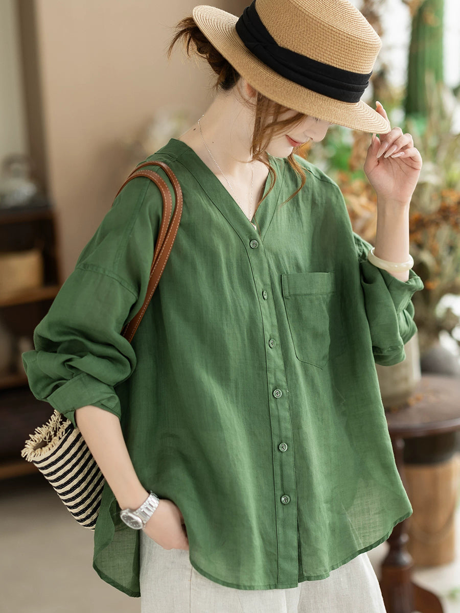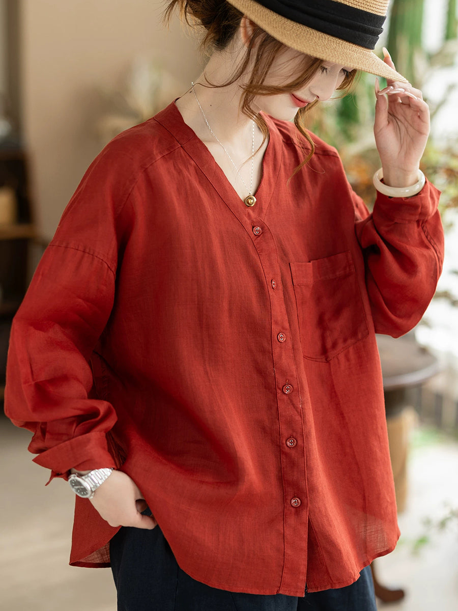 Women Summer Artsy Pure Color V-Neck 100%Ramie Shirt