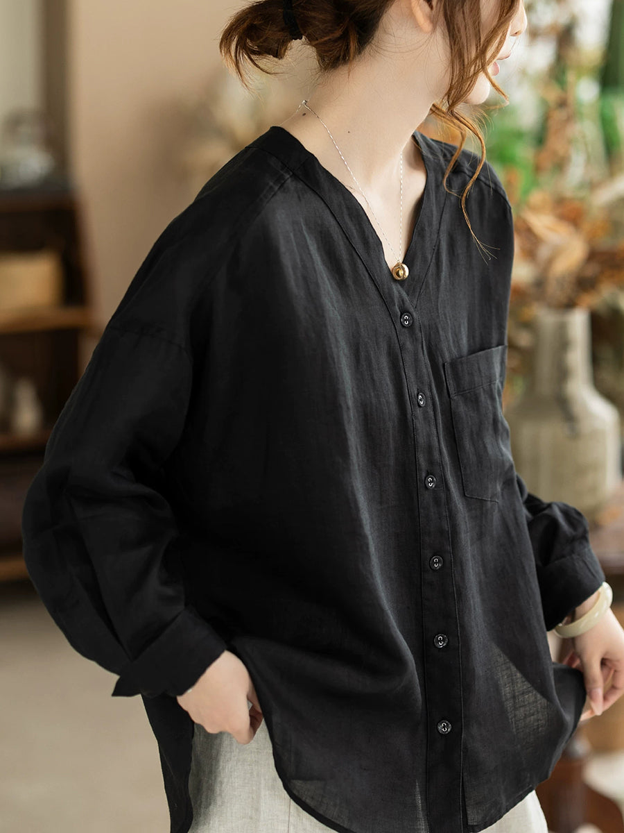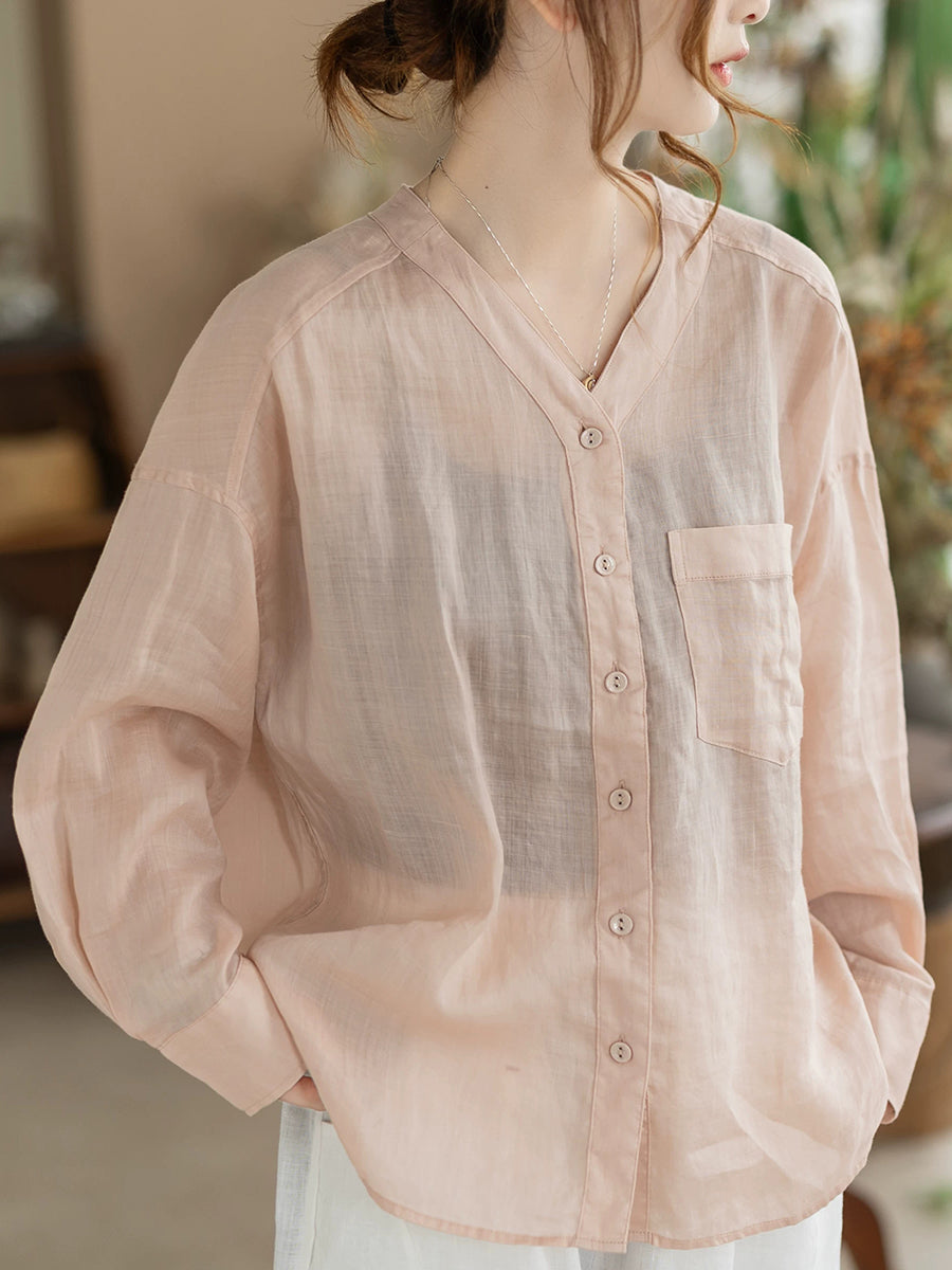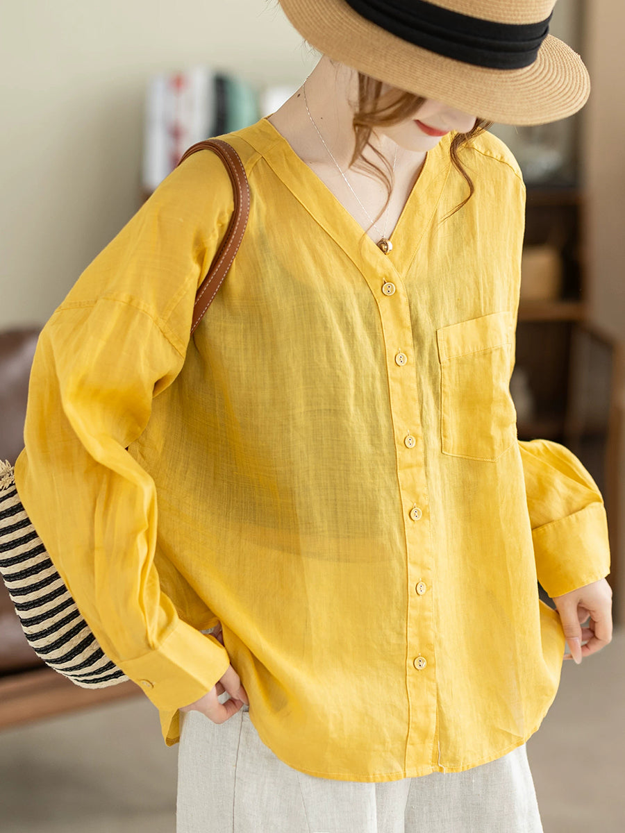 Women Summer Artsy Pure Color V-Neck 100%Ramie Shirt