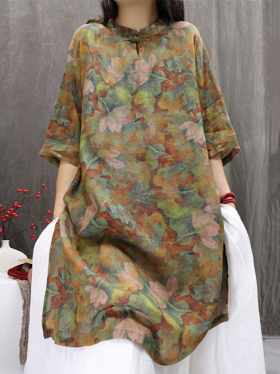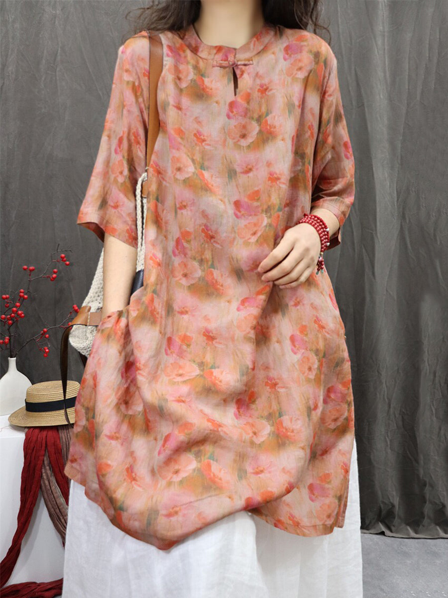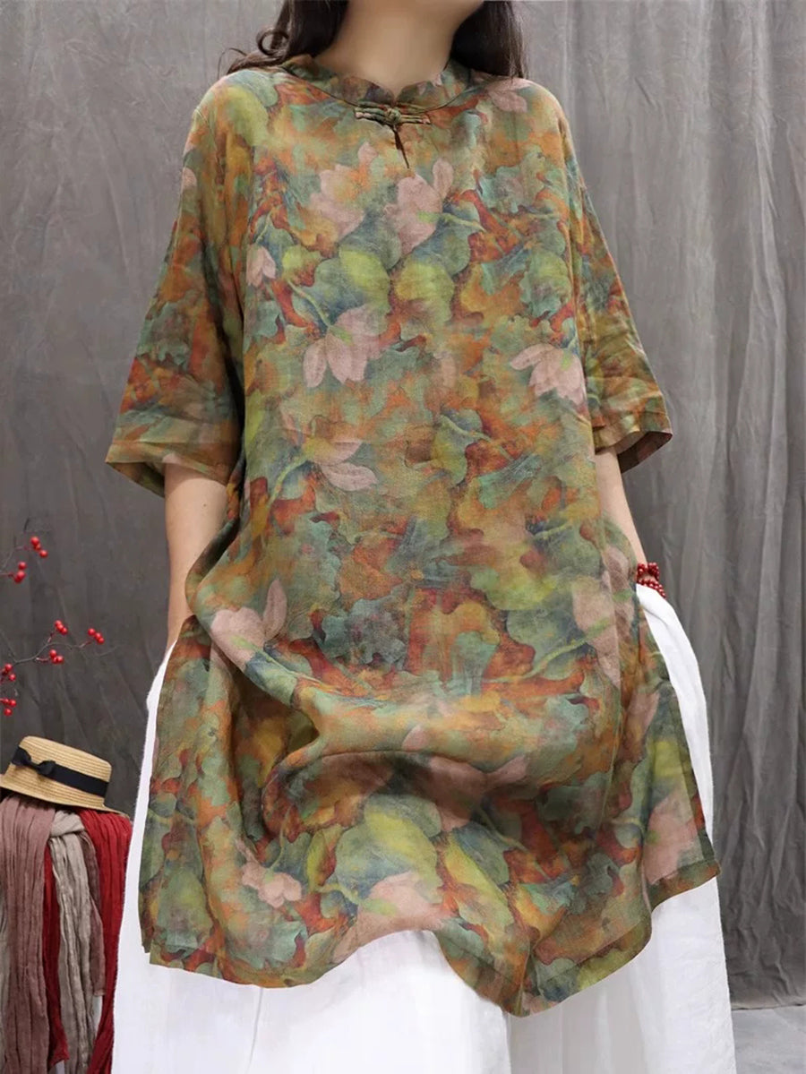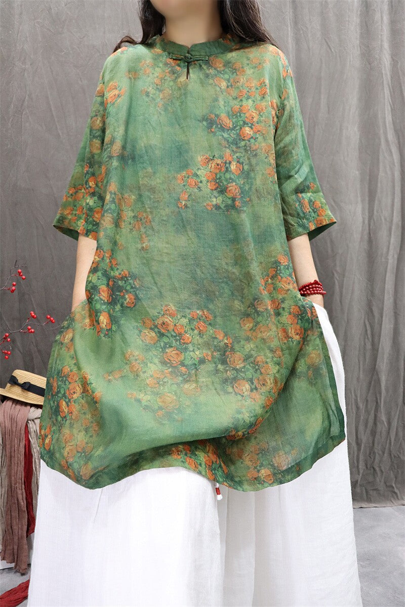 Women Summer Artsy Flower 100%Ramie Blouse Dress