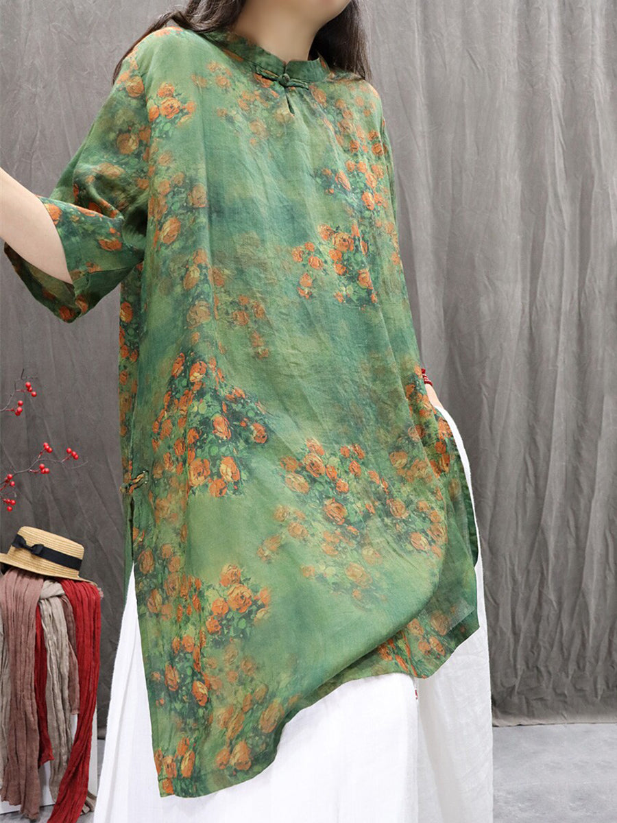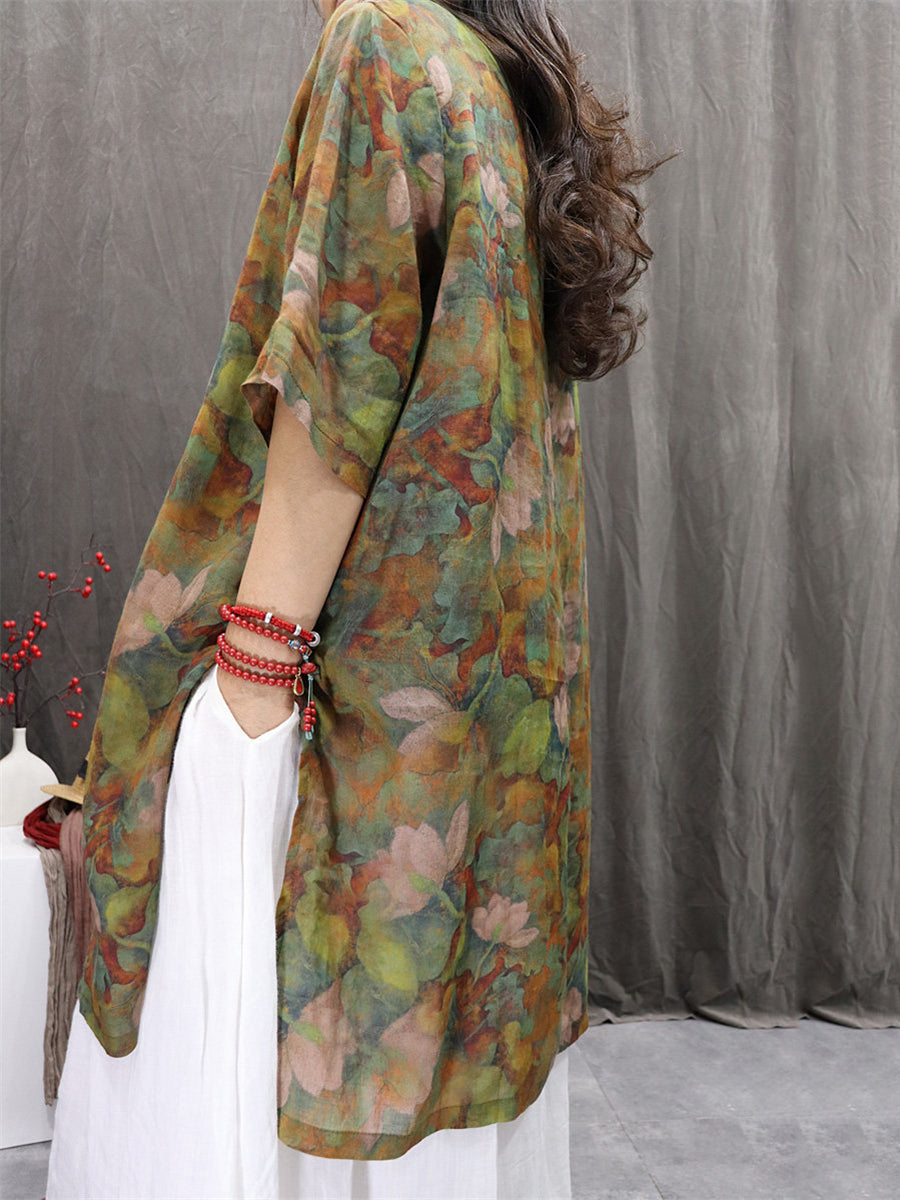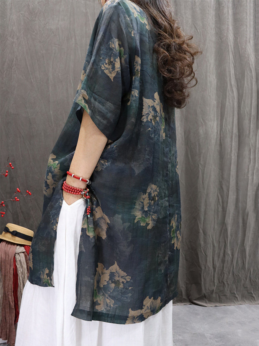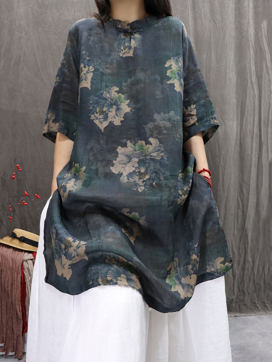 Women Summer Artsy Flower 100%Ramie Blouse Dress