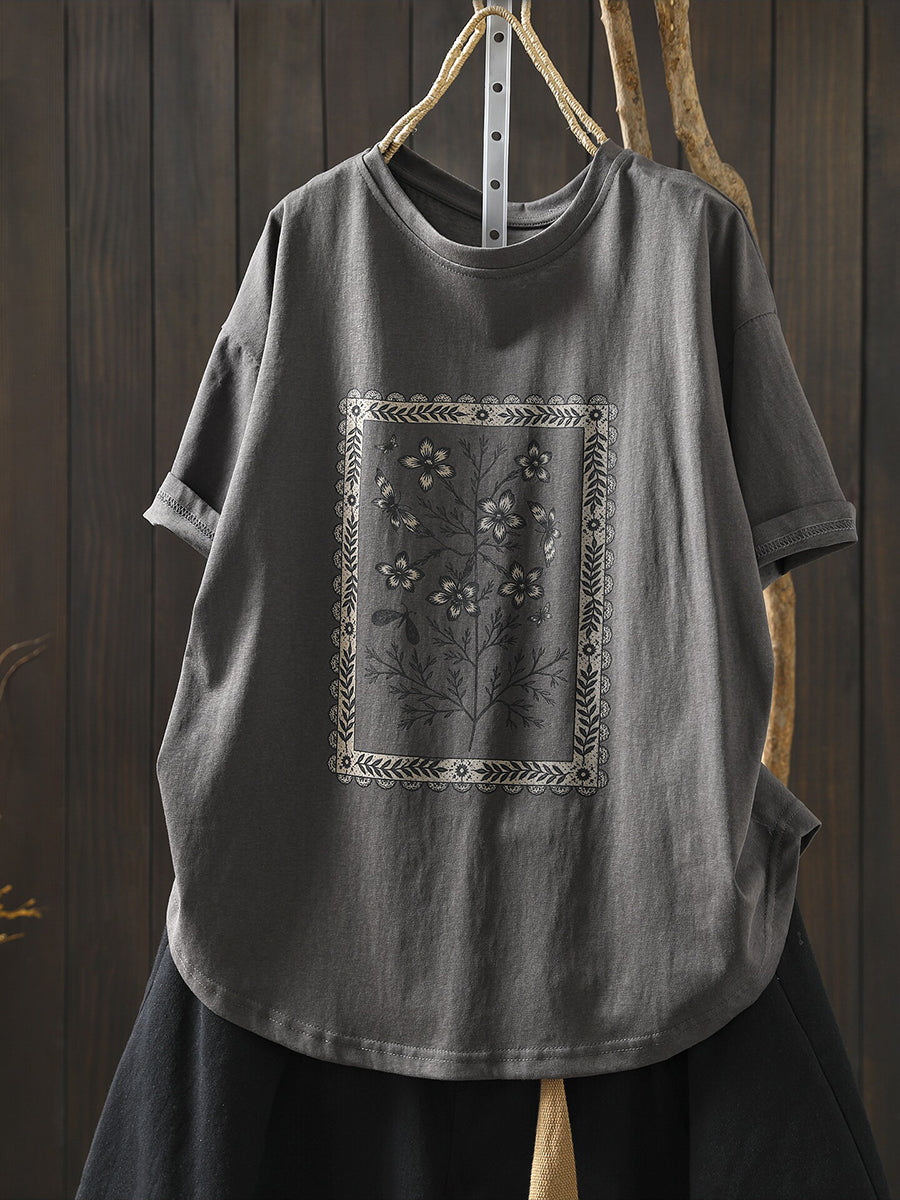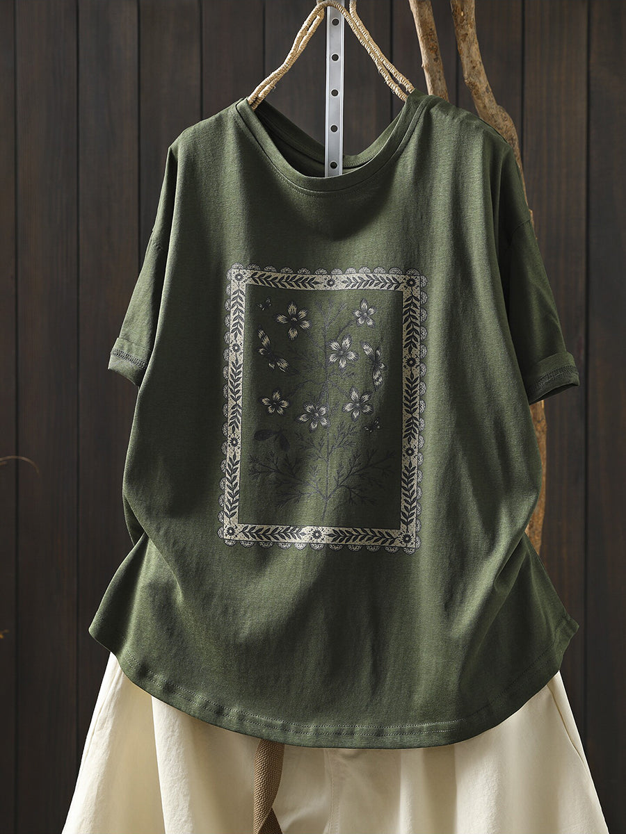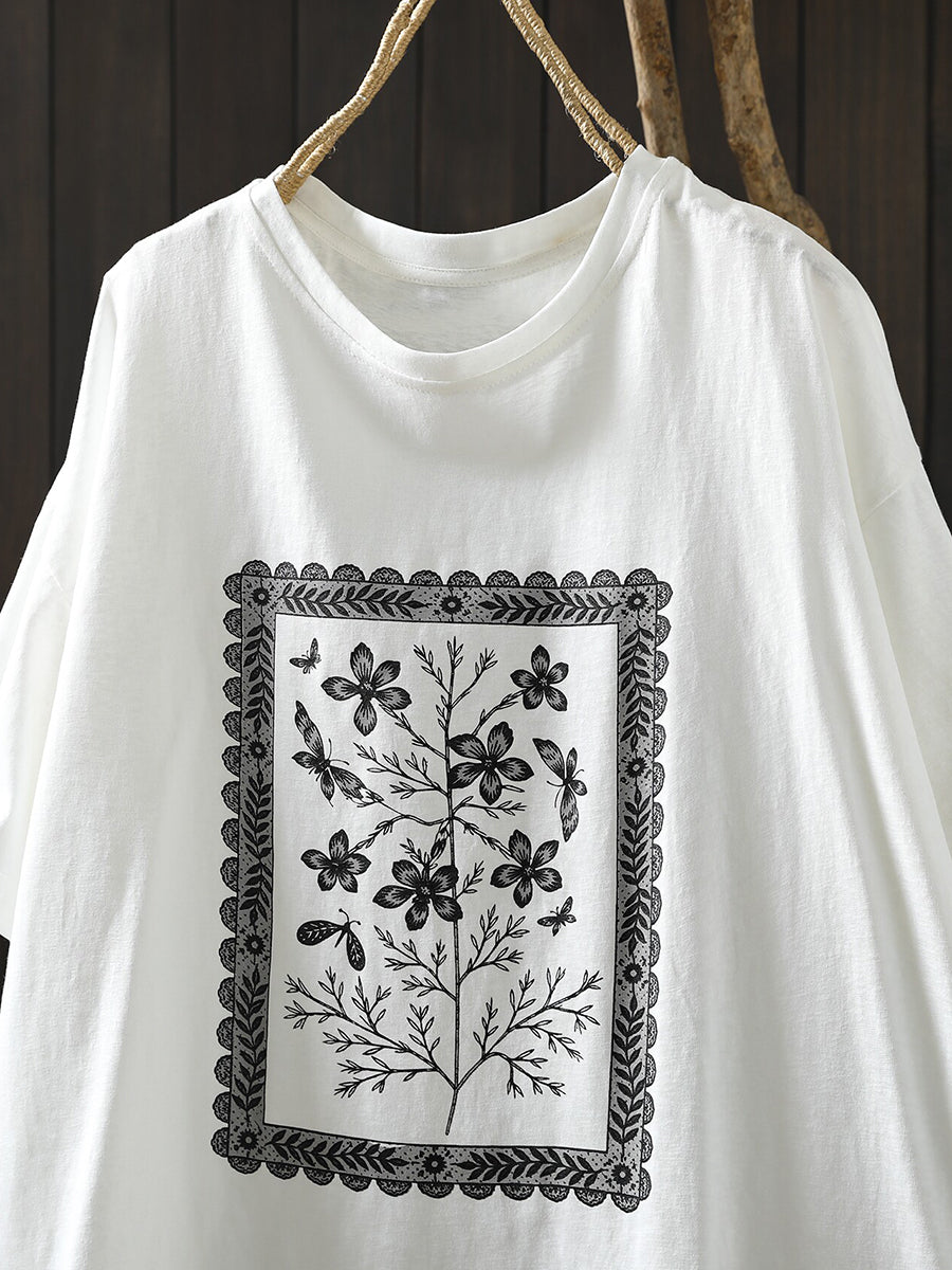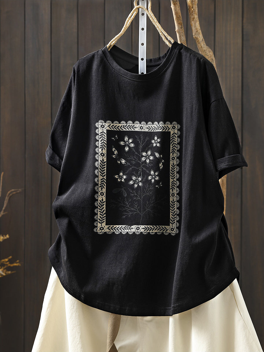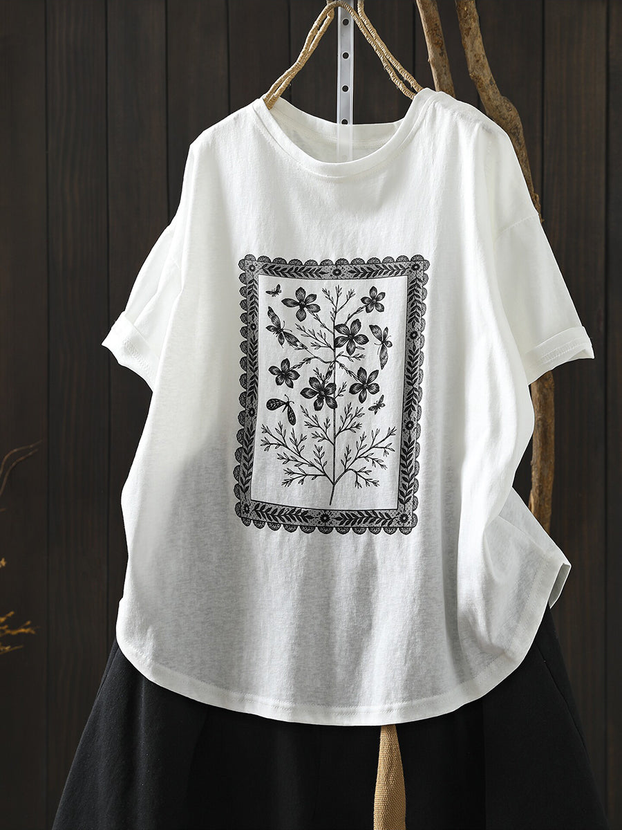 Women Summer Artsy Flower O-Neck Cotton T-Shirt