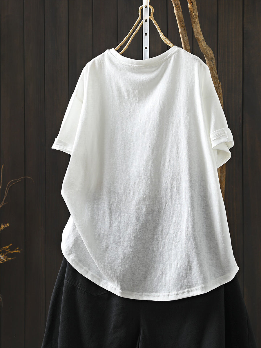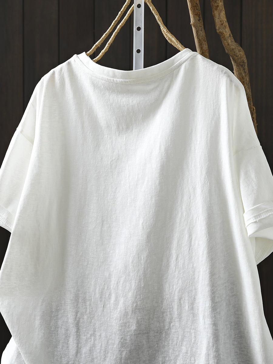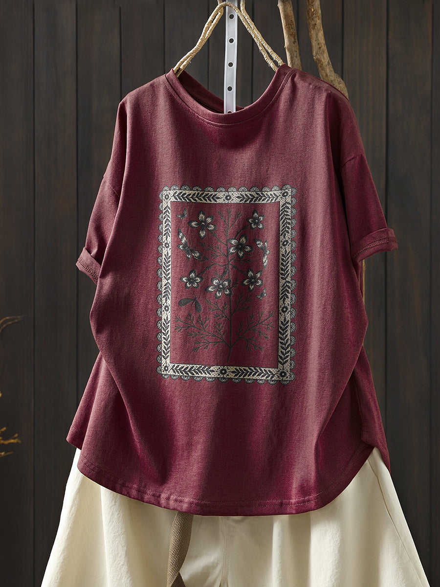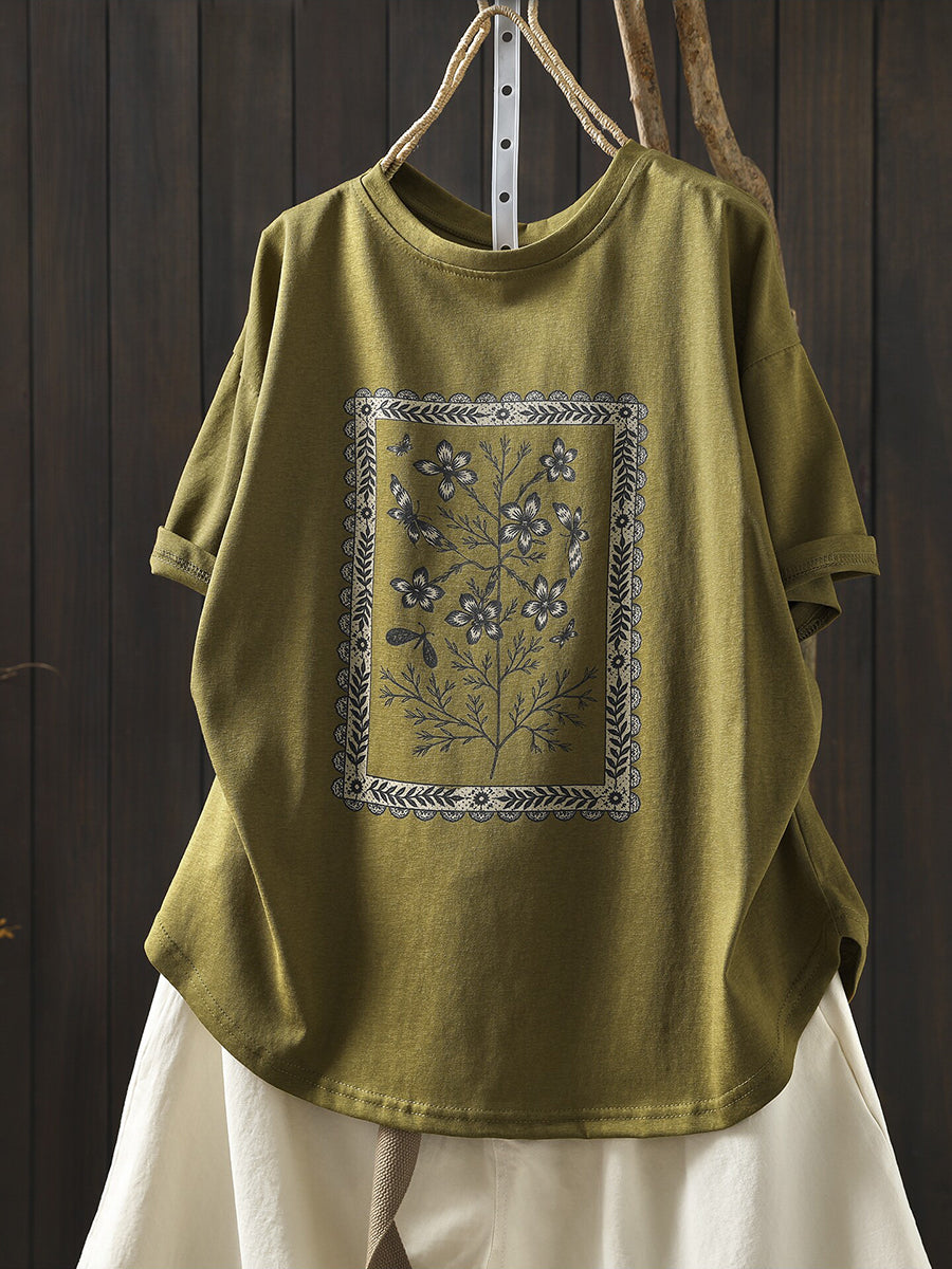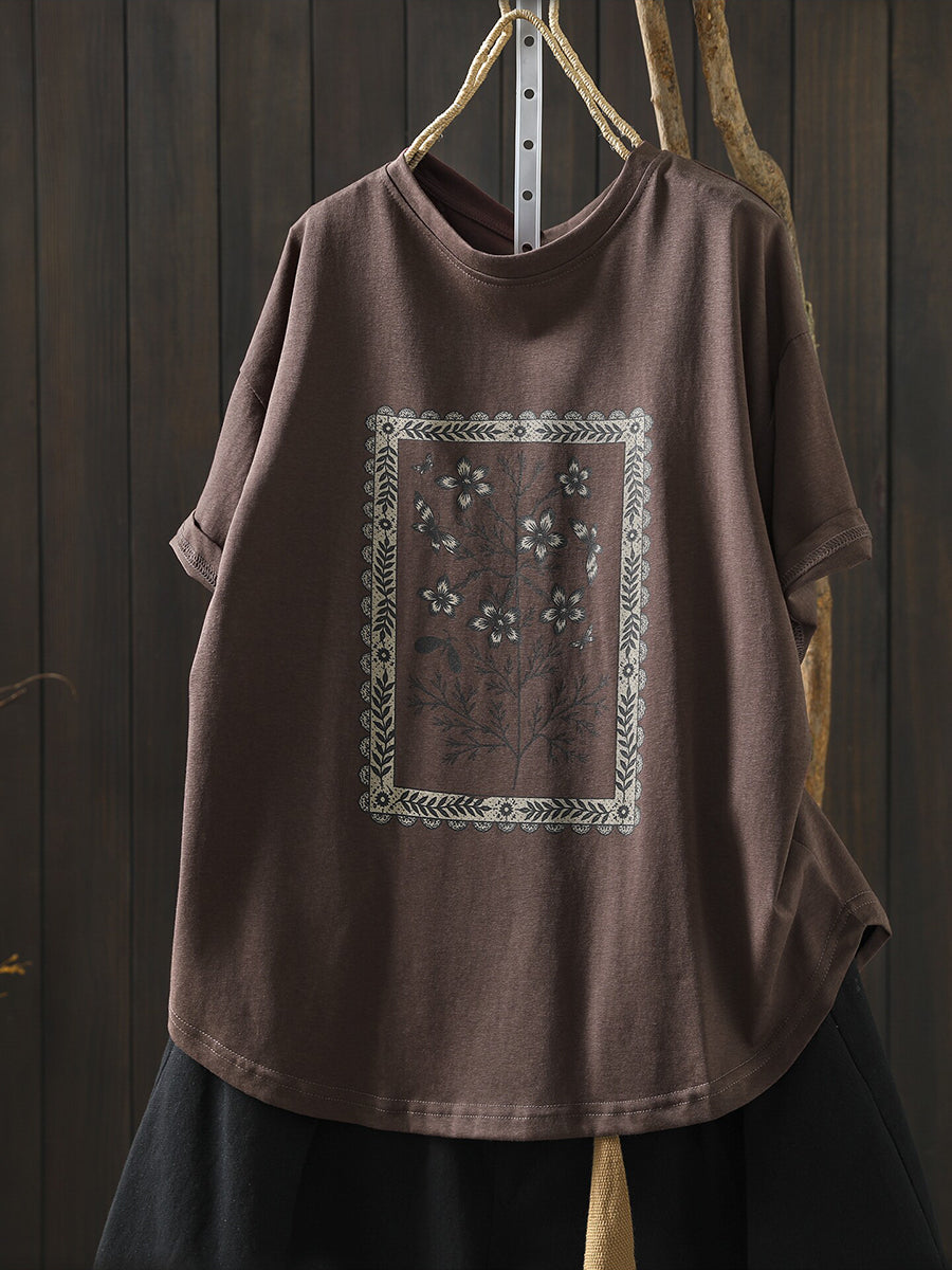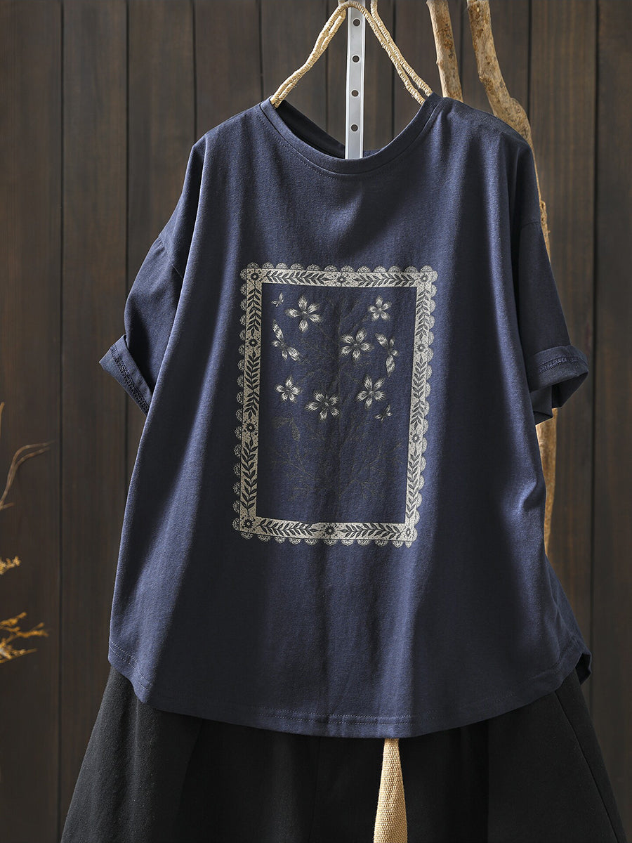Women Summer Artsy Flower O-Neck Cotton T-Shirt