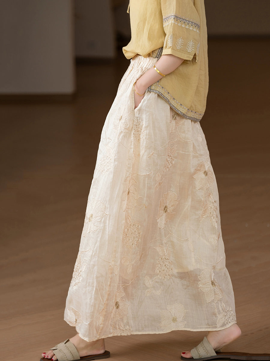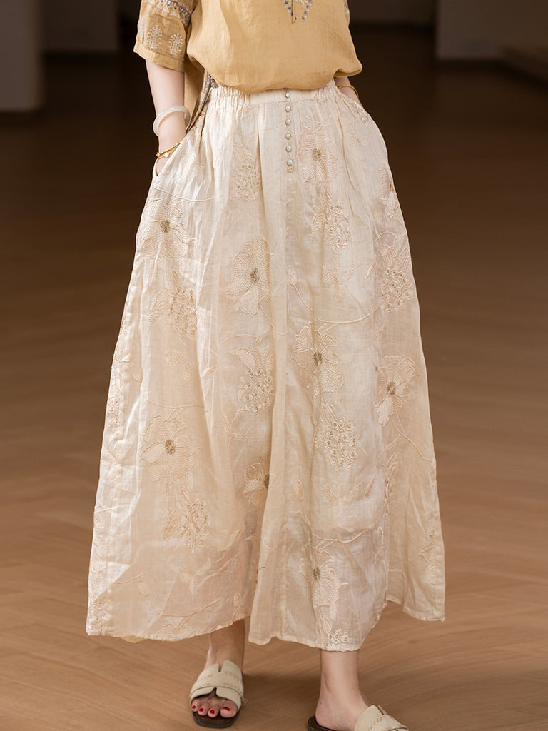 Plus Size Women Summer Artsy Flower Embroidery 100%Ramie Skirt