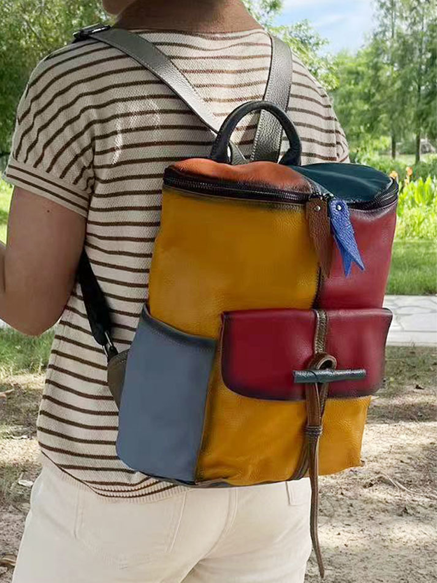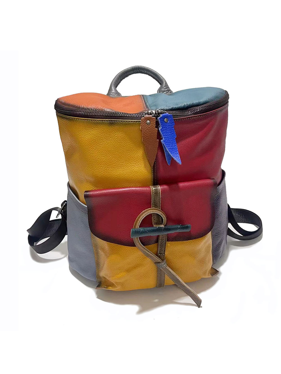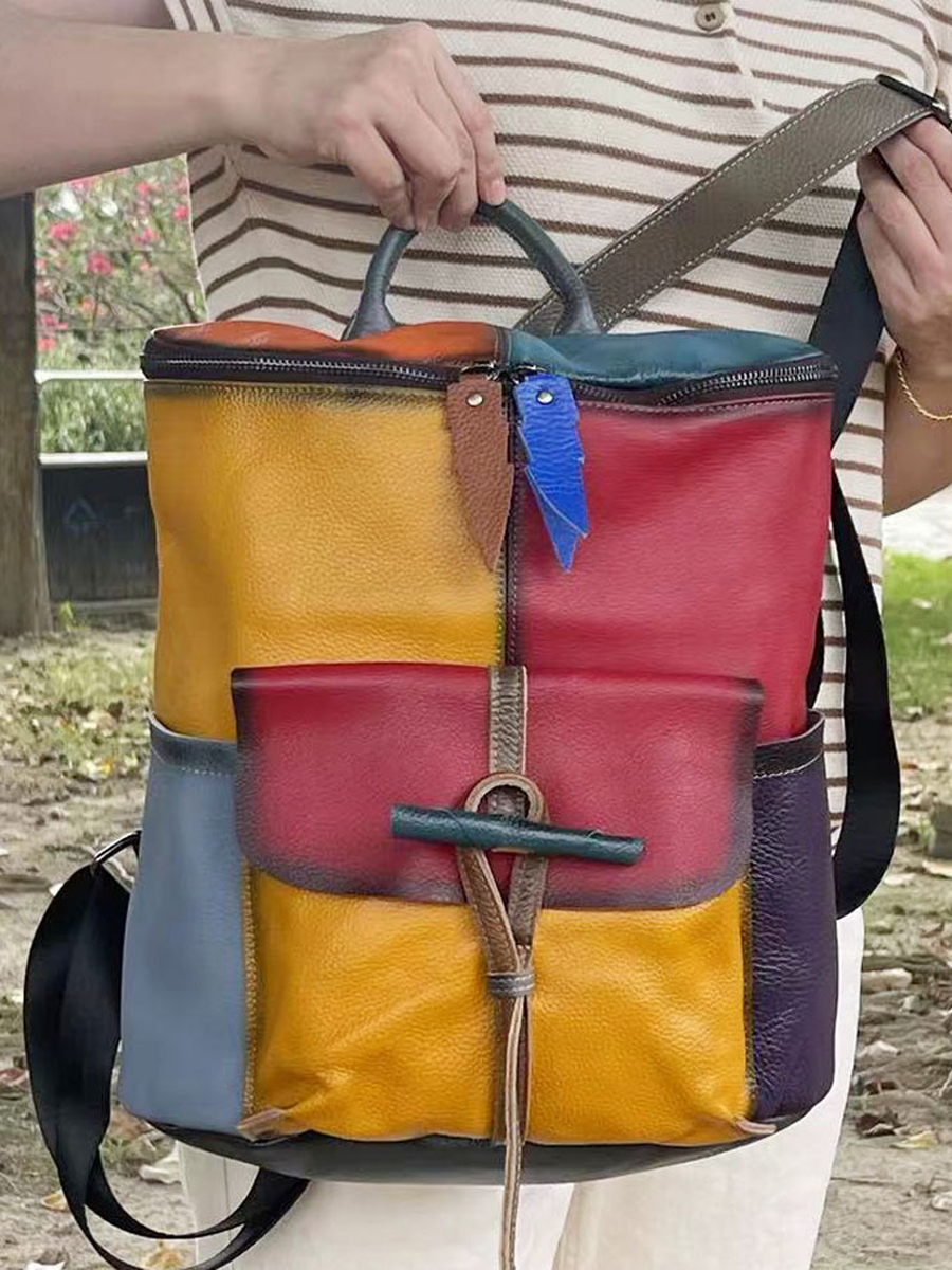 Retro Genunie Leather Colorblock Large Capacity Backpack