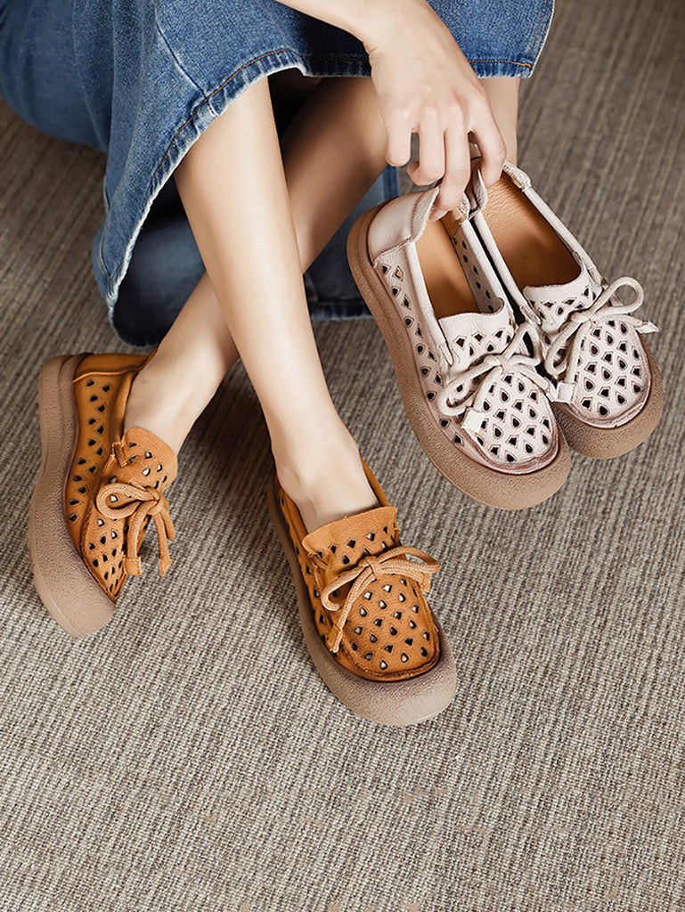 Women Summer Genuine Leather Hollow Out Flat Shoes