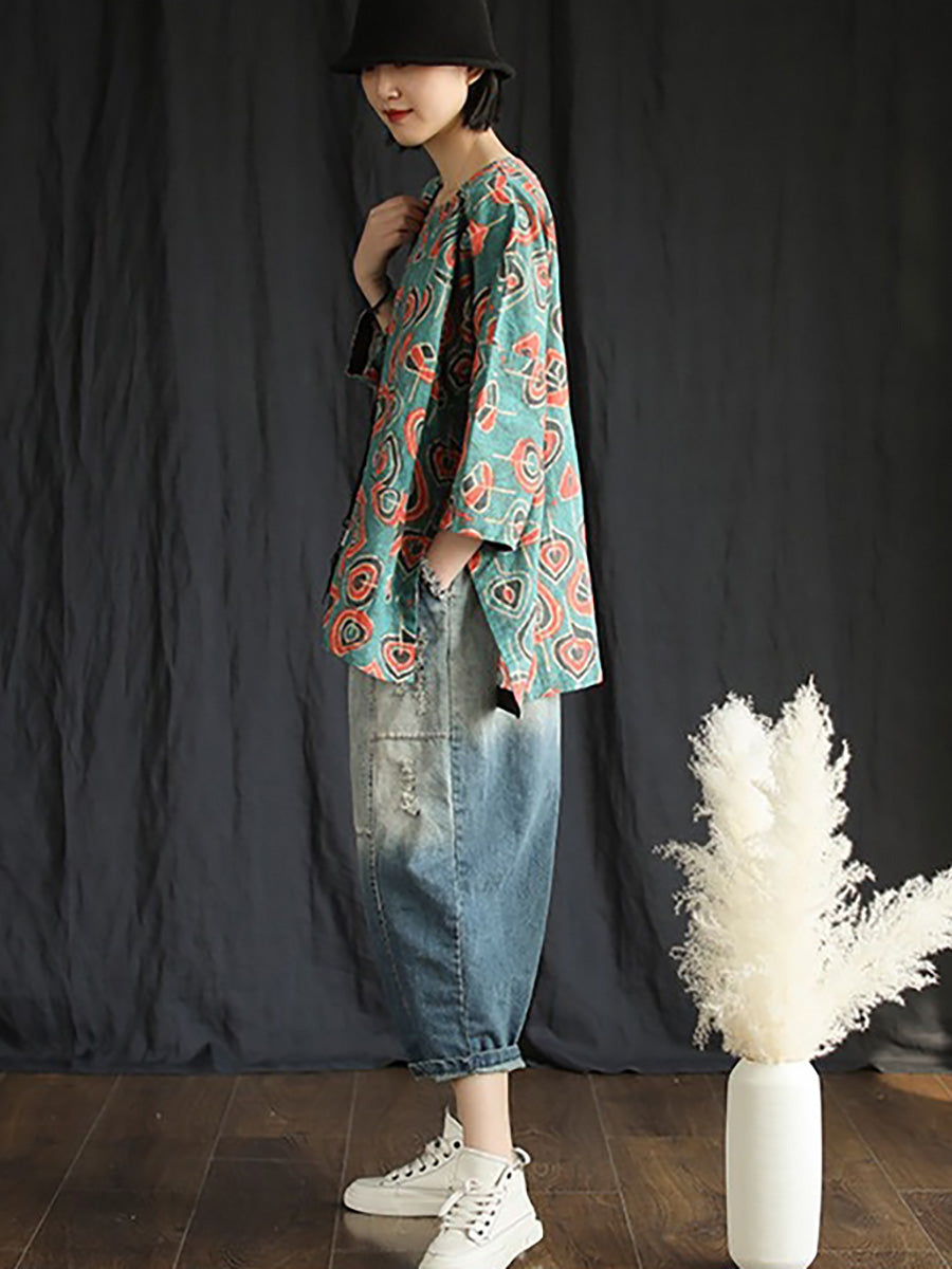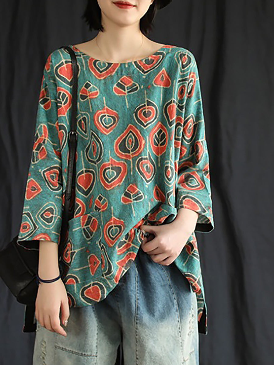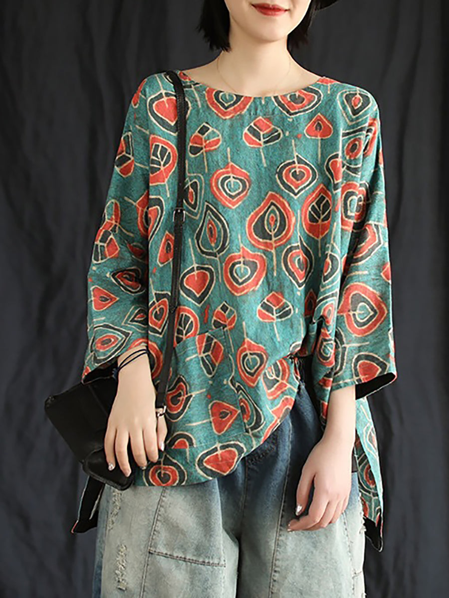 Plus Size Buykud Casual Floral 100% Linen T-Shirt