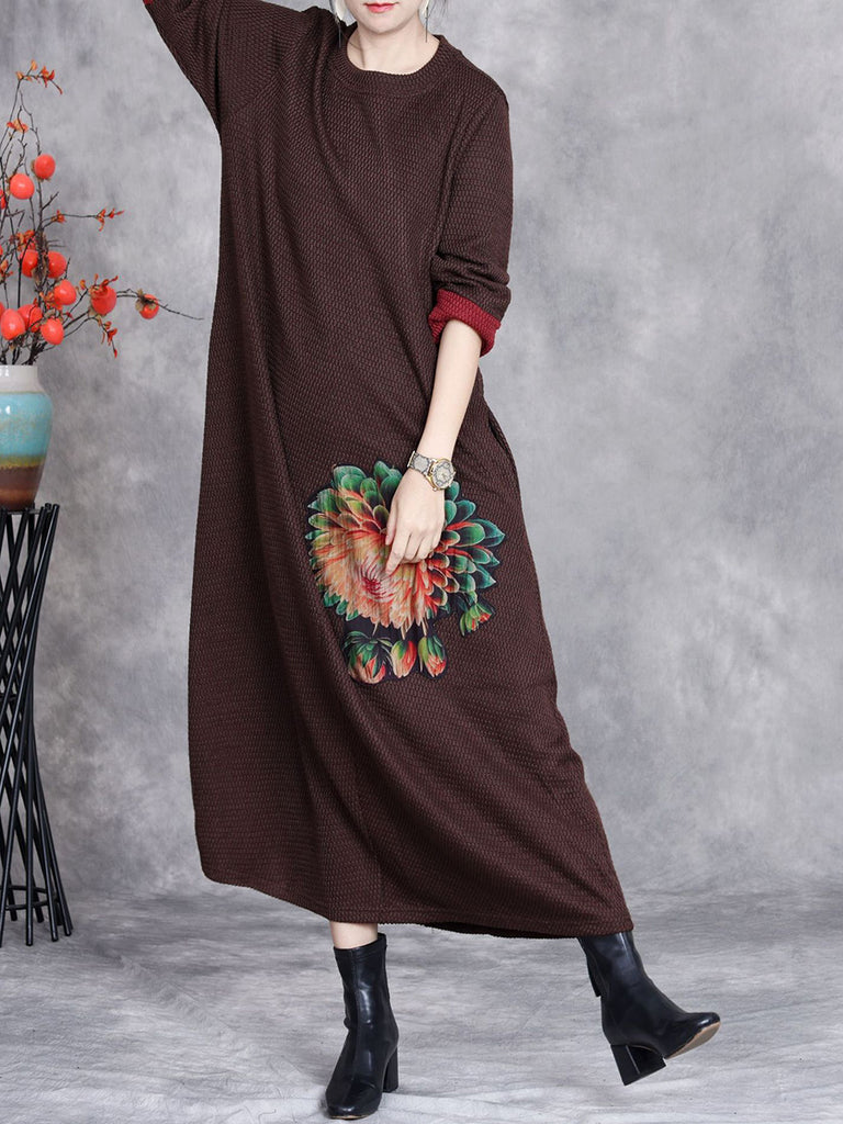 Women Autumn Artsy Flower Knit O-Neck Dress