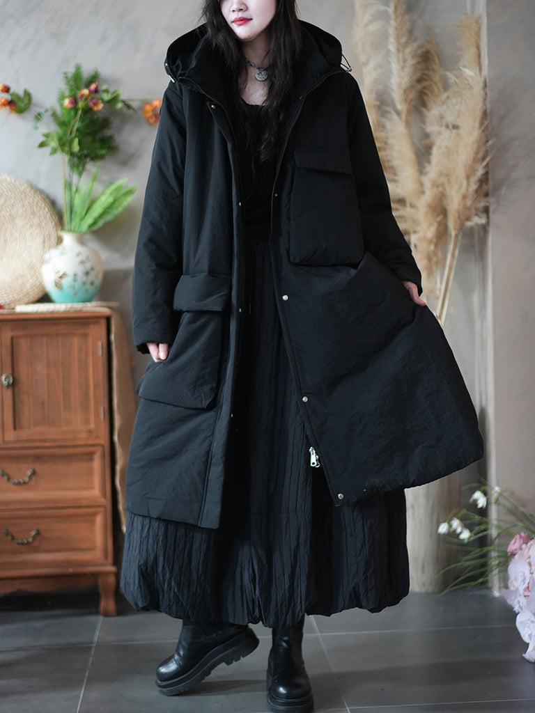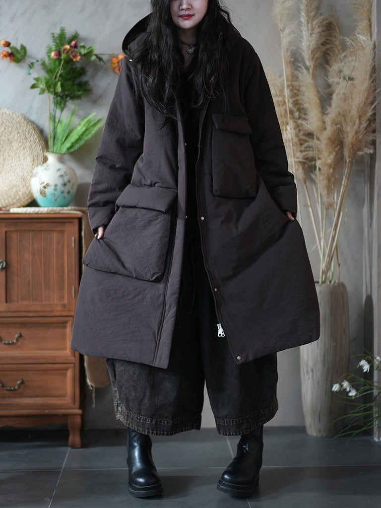 Women Winter Pure Color Pocket Padded Hooded Coat