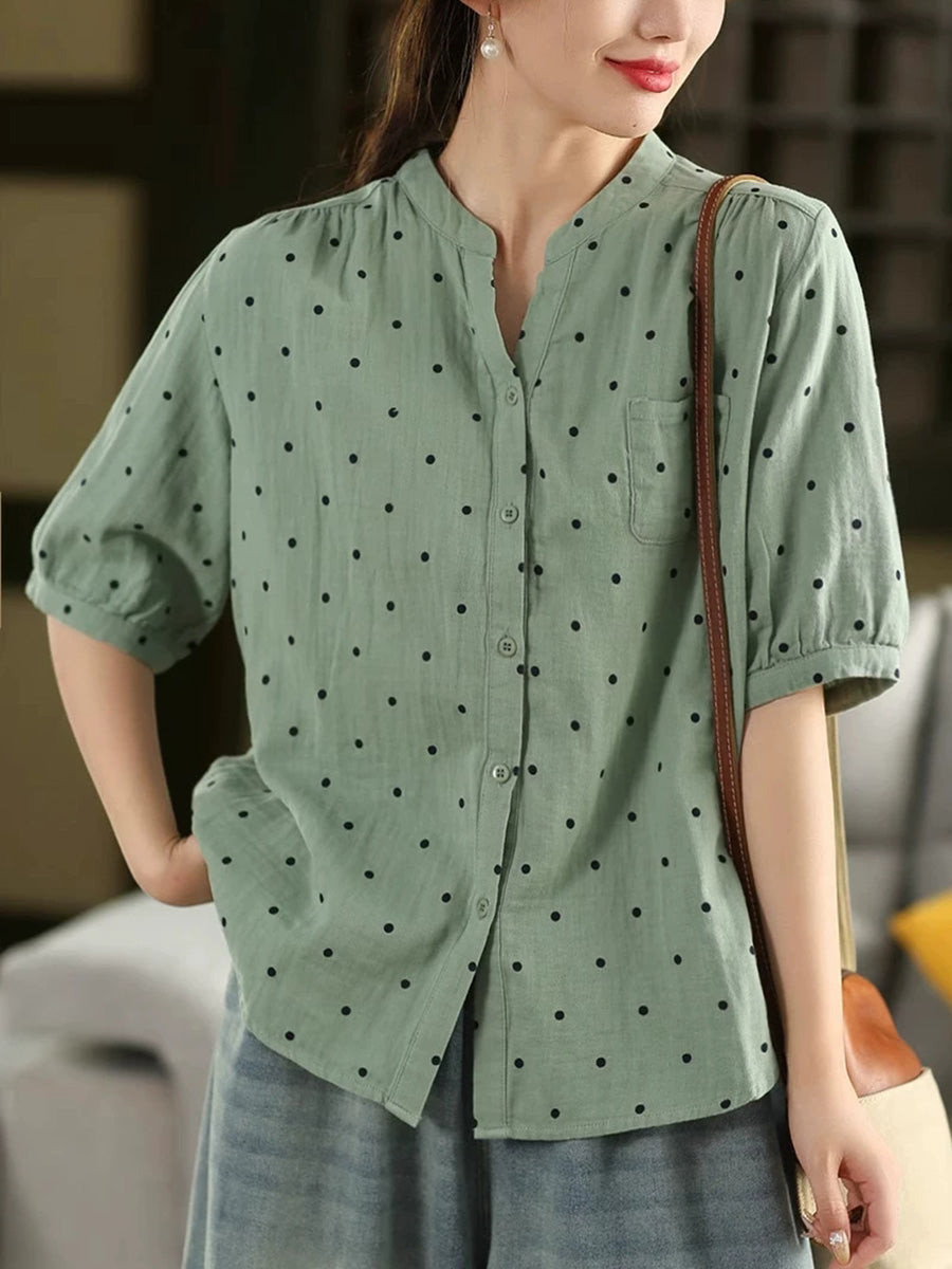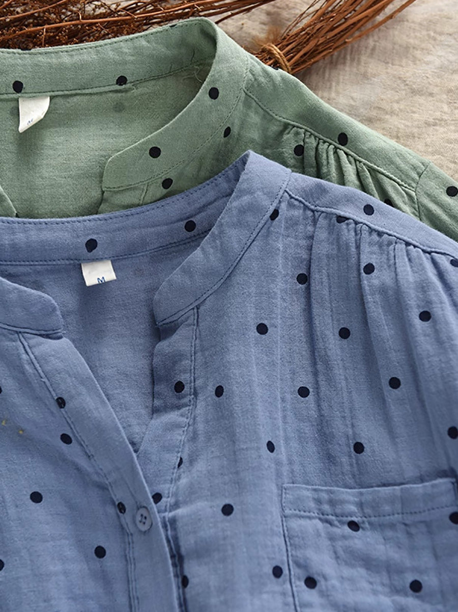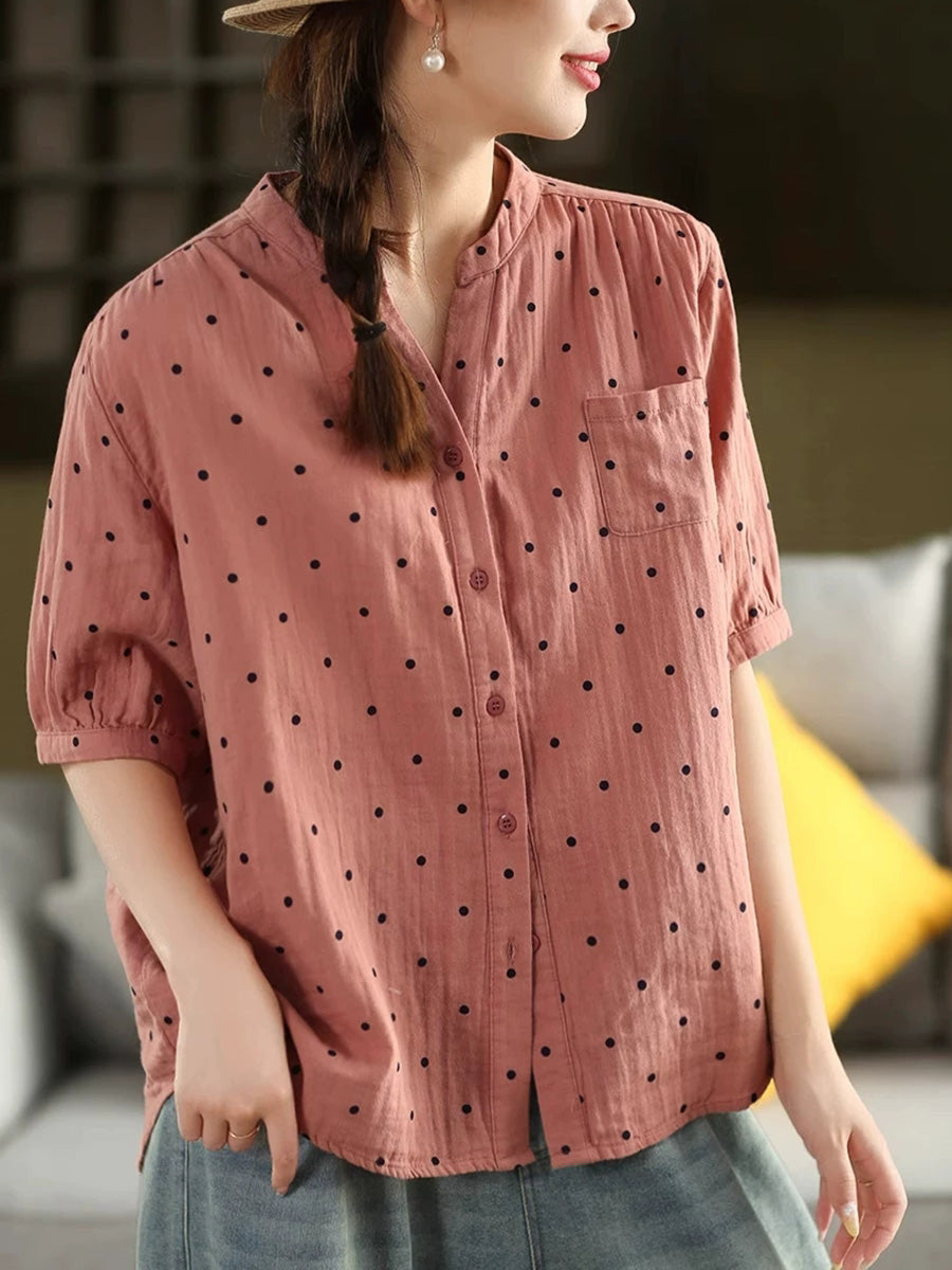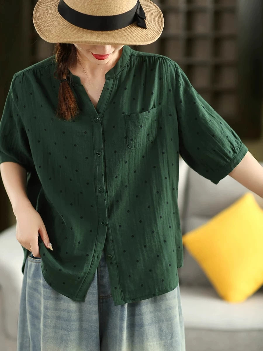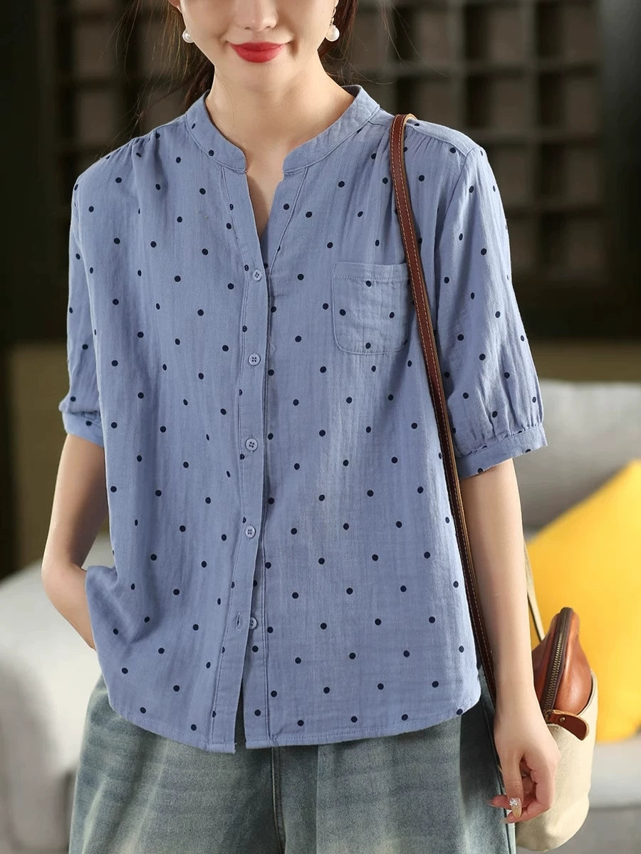 Women Summer Artsy Dot Stand Collar 100%Cotton Shirt