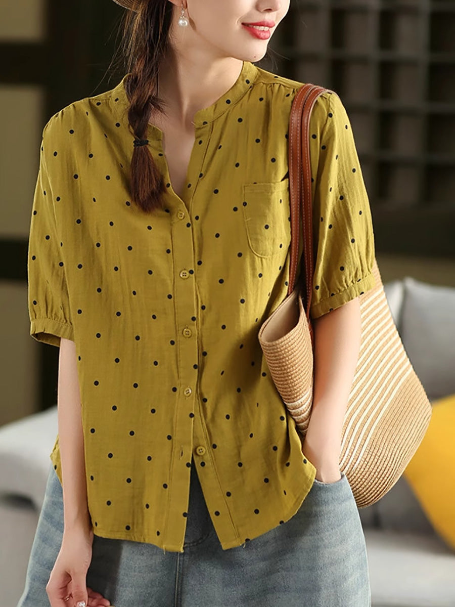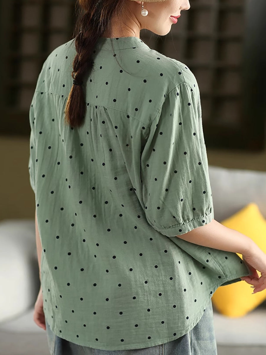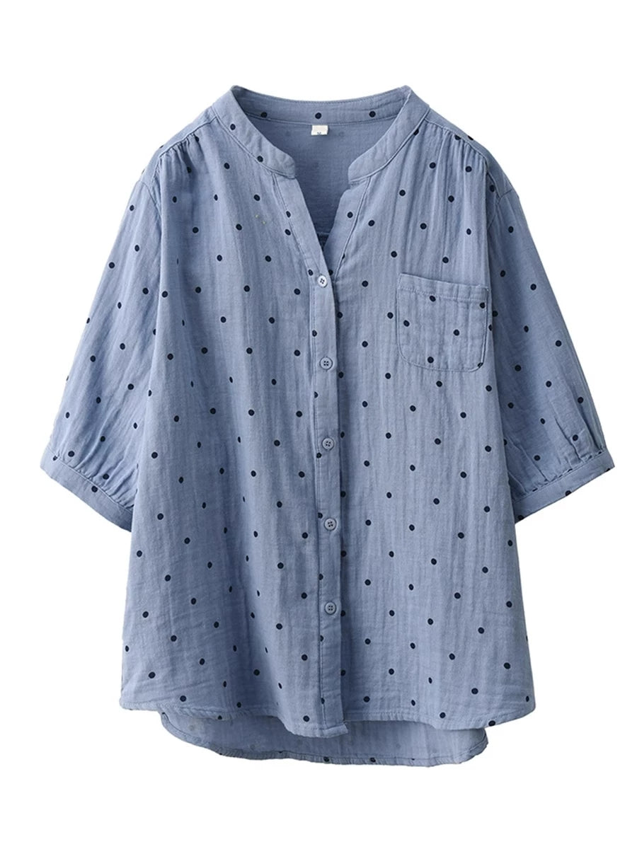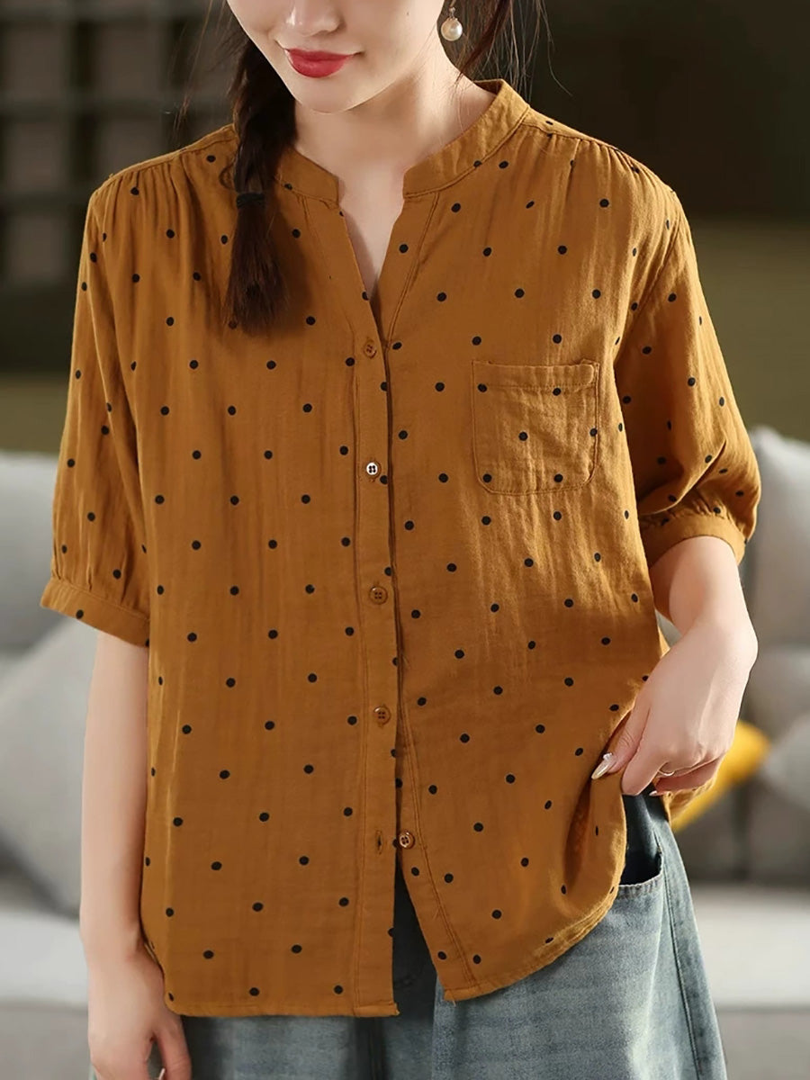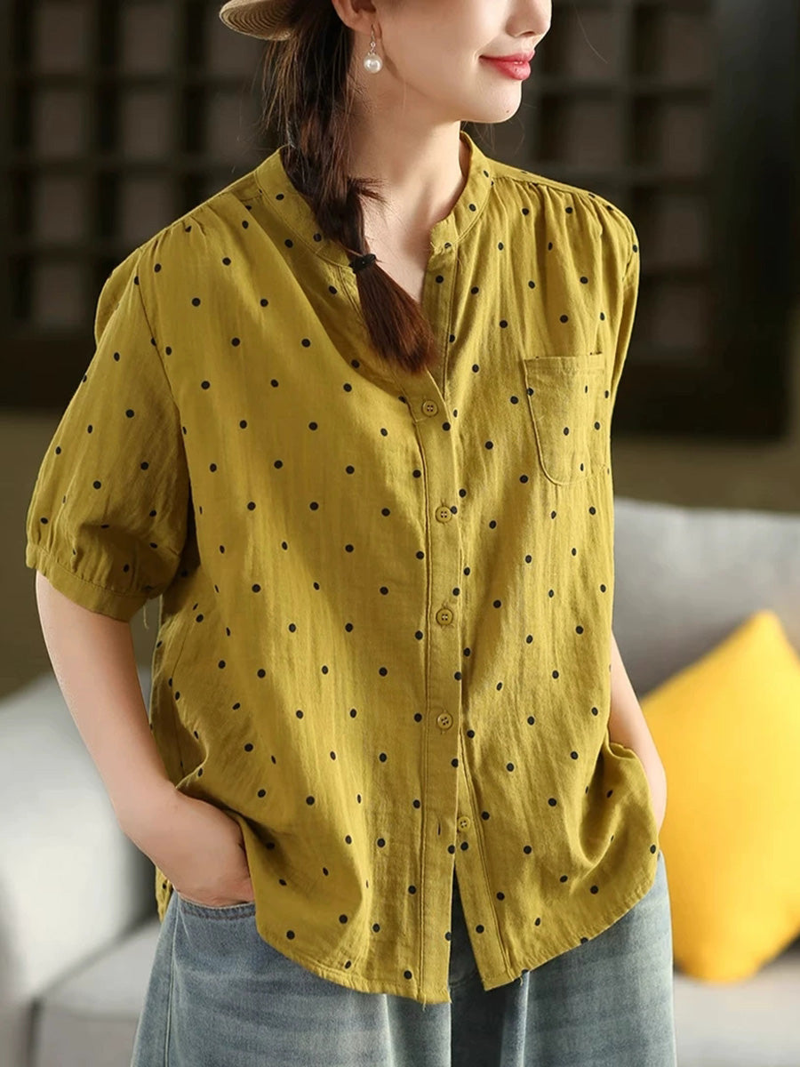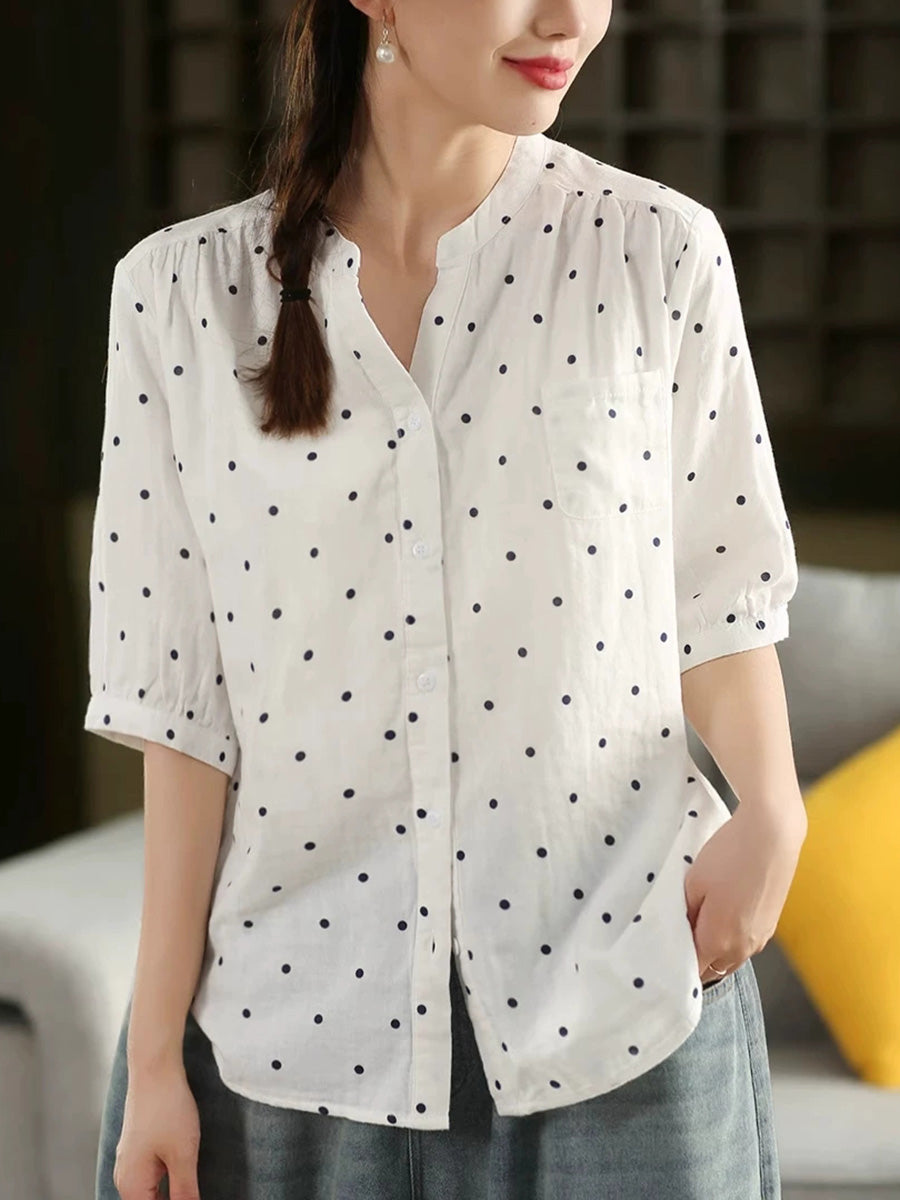 Women Summer Artsy Dot Stand Collar 100%Cotton Shirt