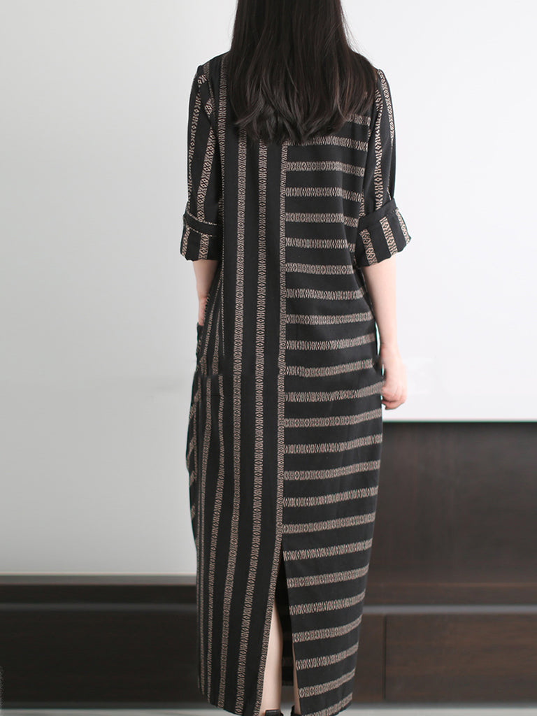 Plus Size Women Autumn Retro Stripe V-Neck 100%Cotton Dress