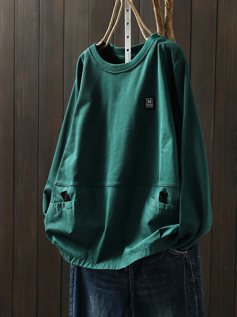 Women Autumn Pure Color Spliced O-Neck 100%Cotton Shirt