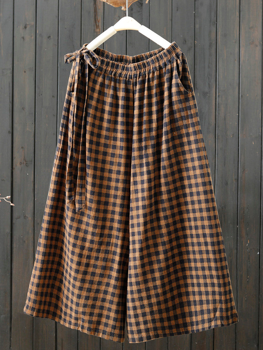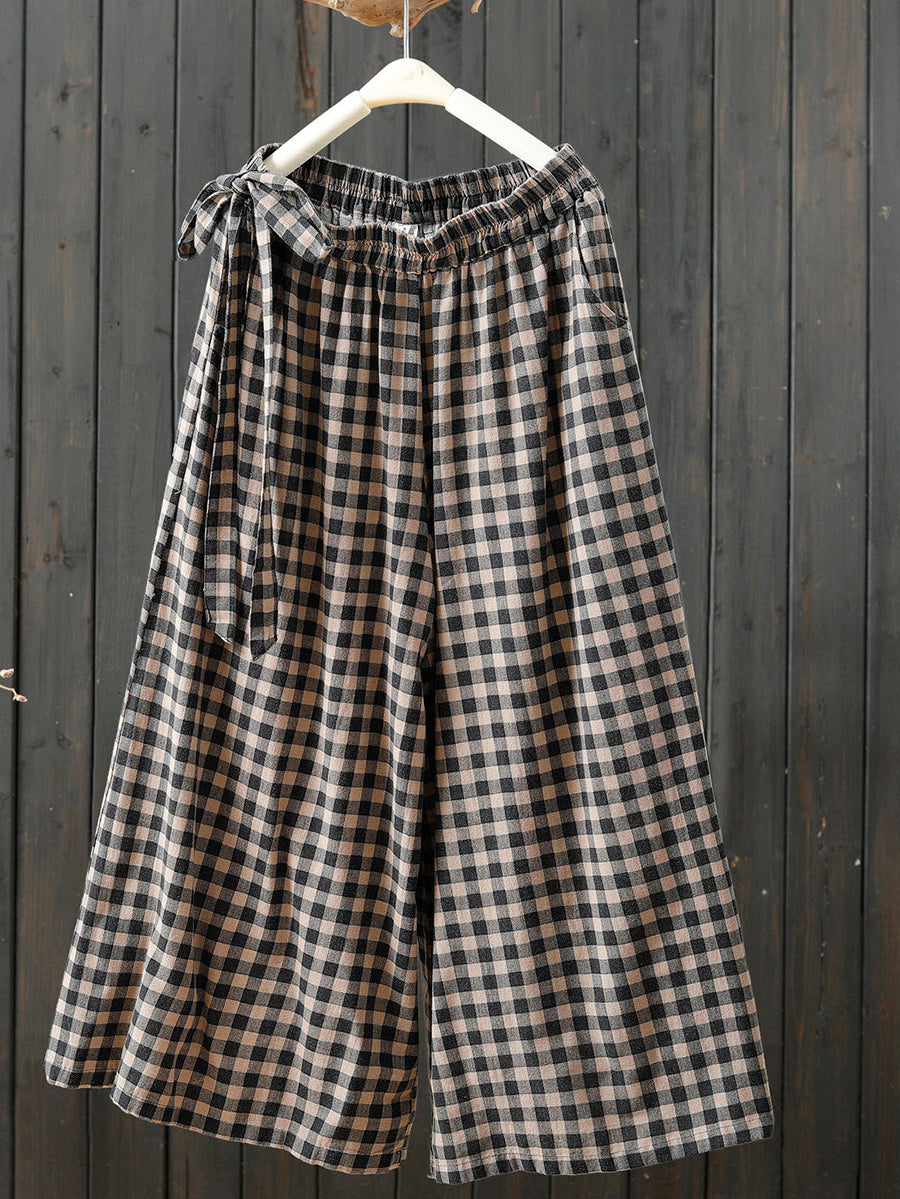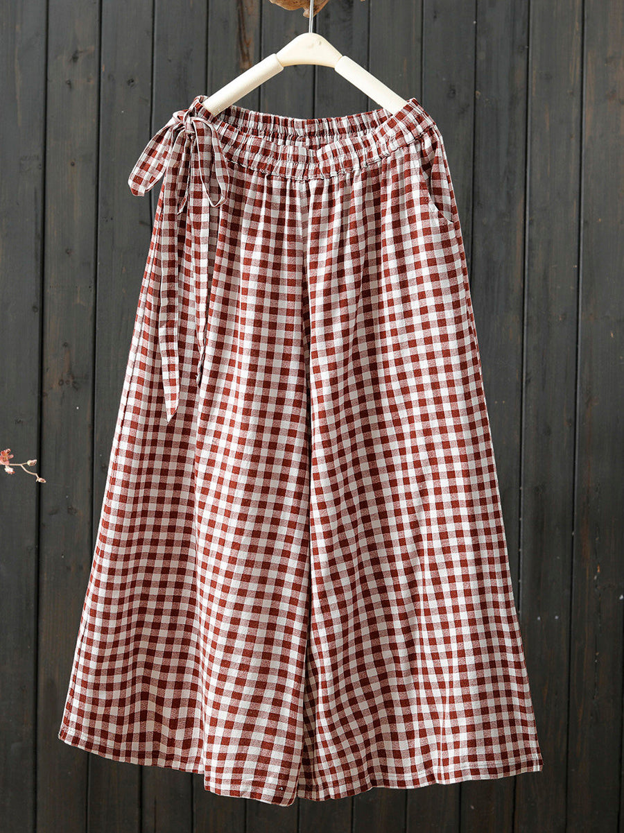Women Spring Retro Plaid 100%Cotton Wide-leg Pants