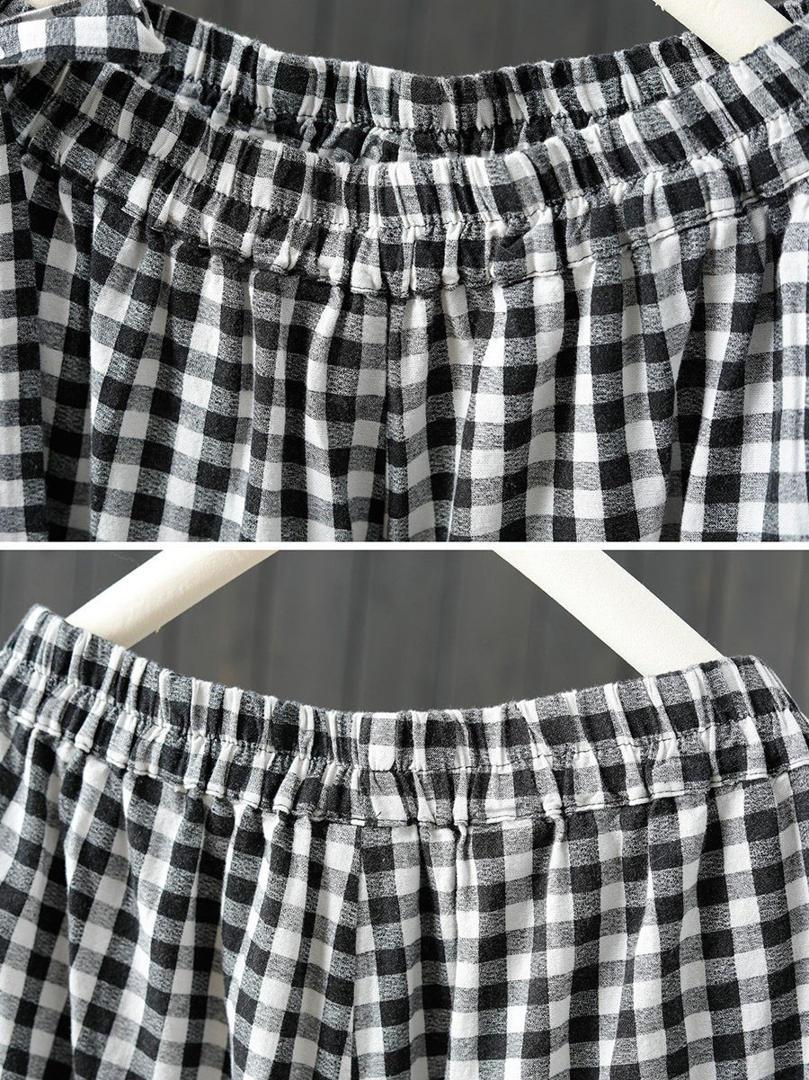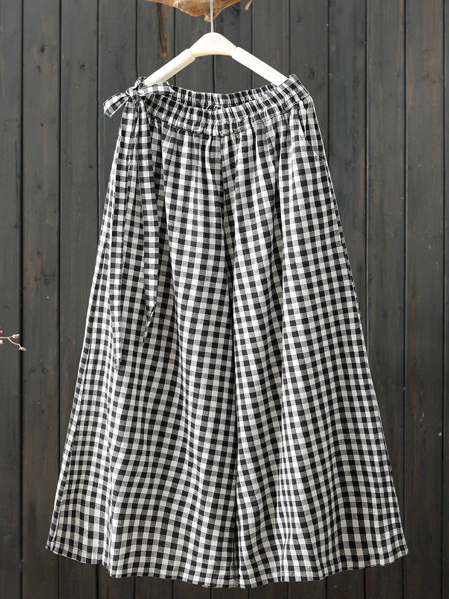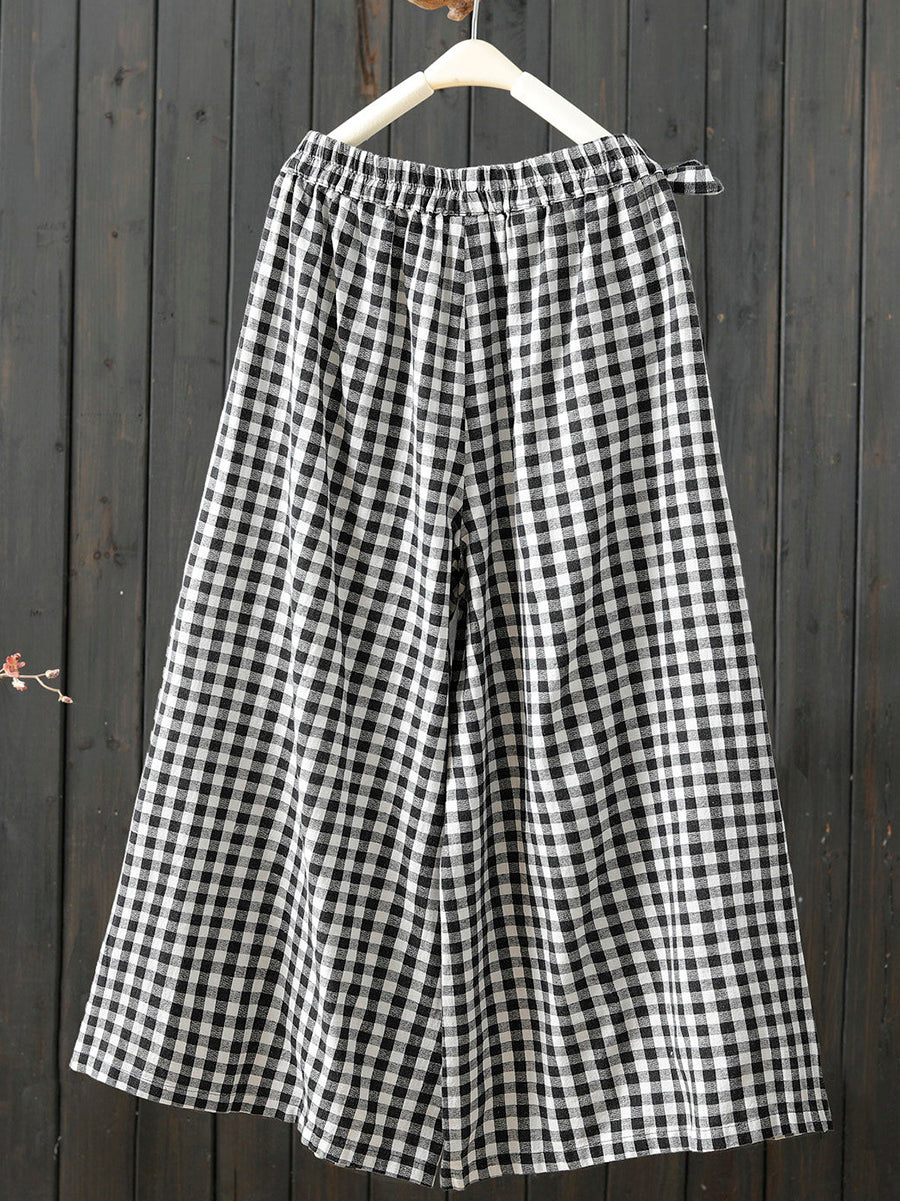 Women Spring Retro Plaid 100%Cotton Wide-leg Pants