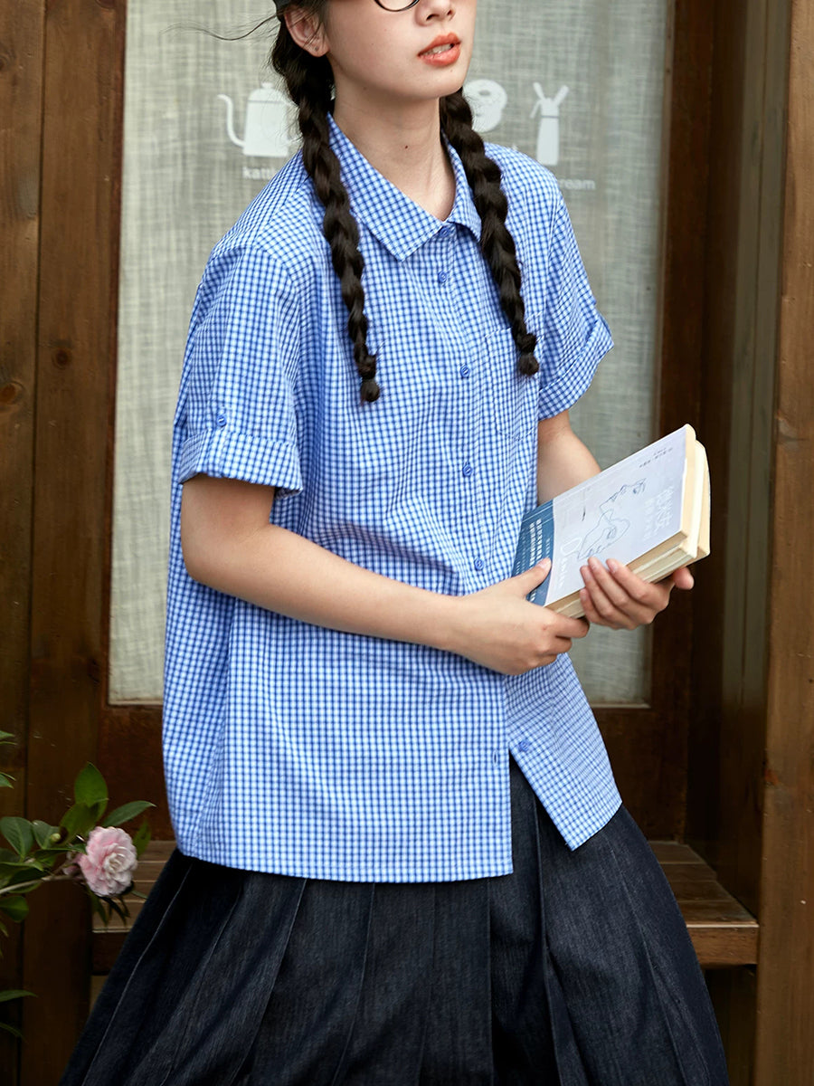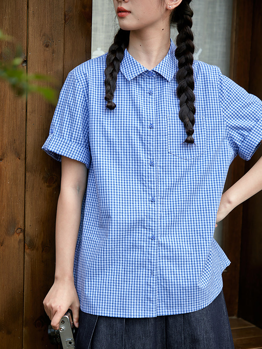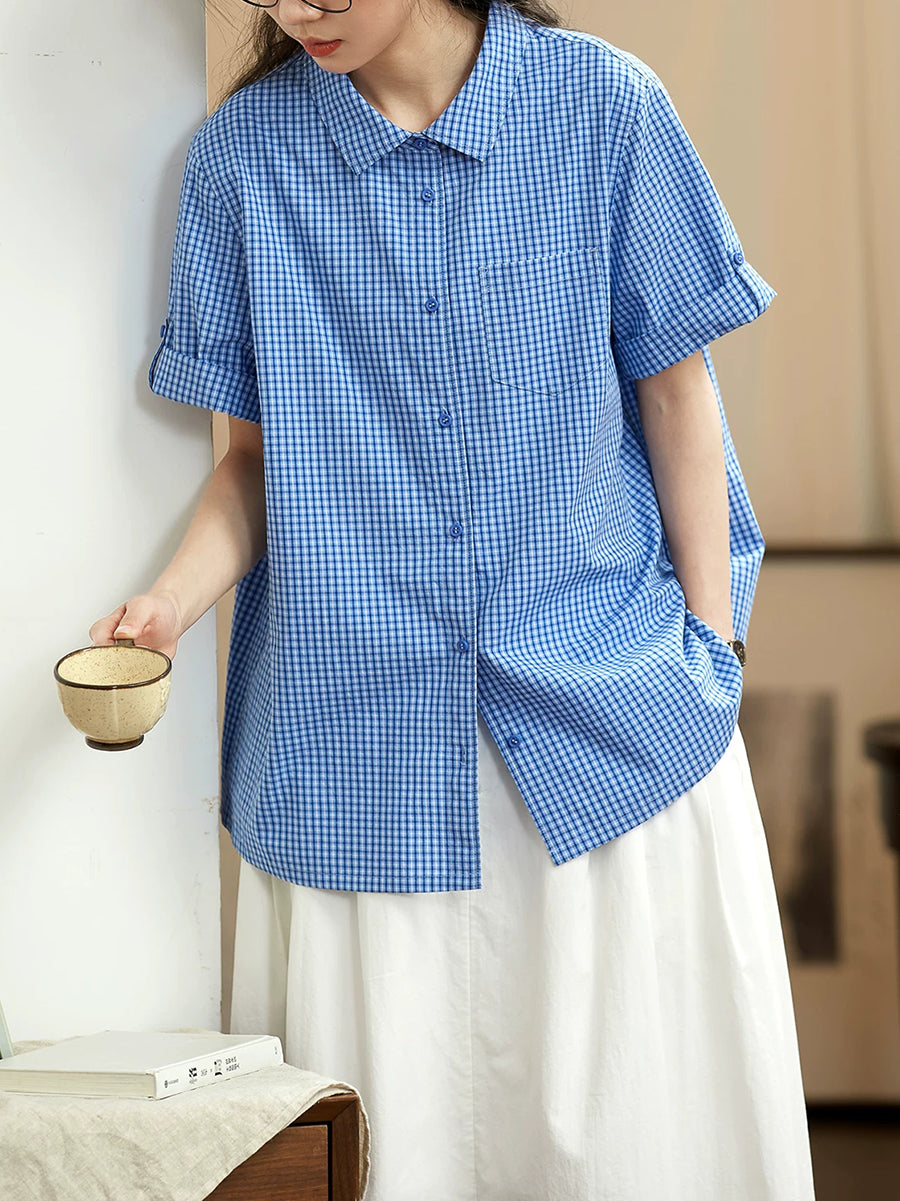 Women Spring Retro Plaid Turn-down Collar 100%Cotton Shirt