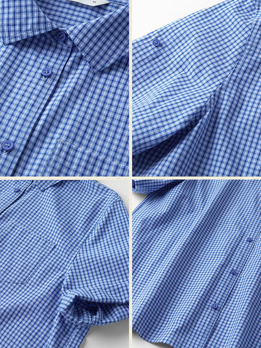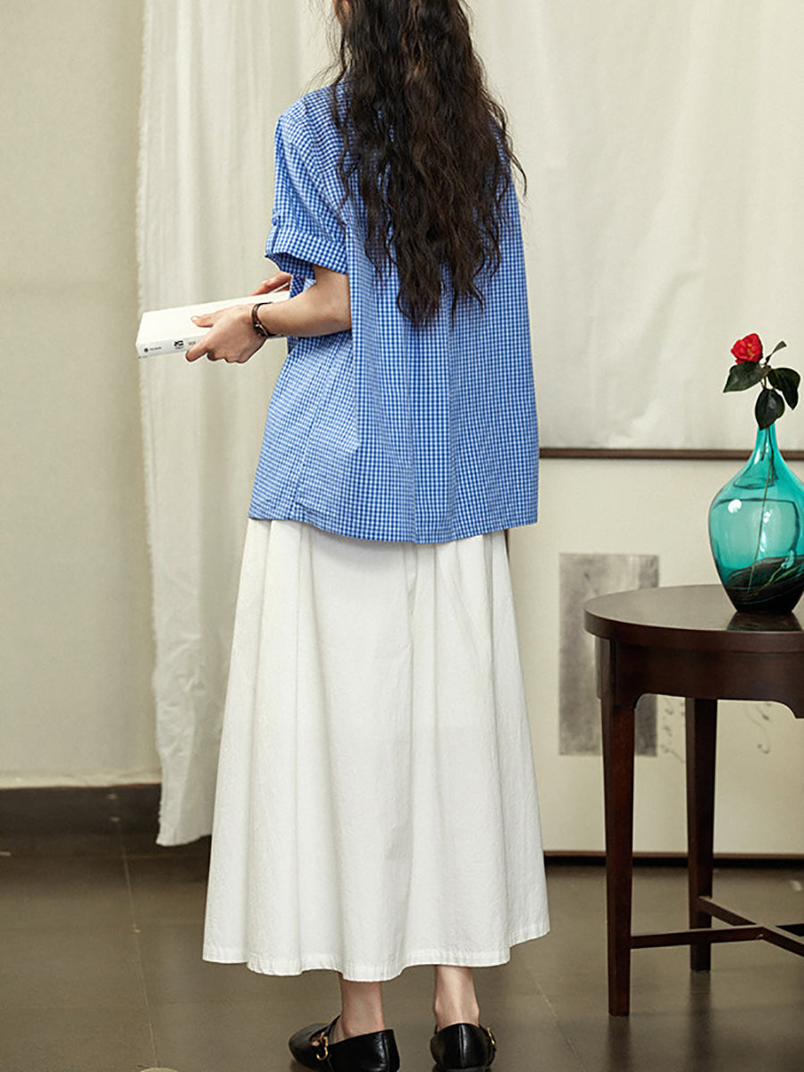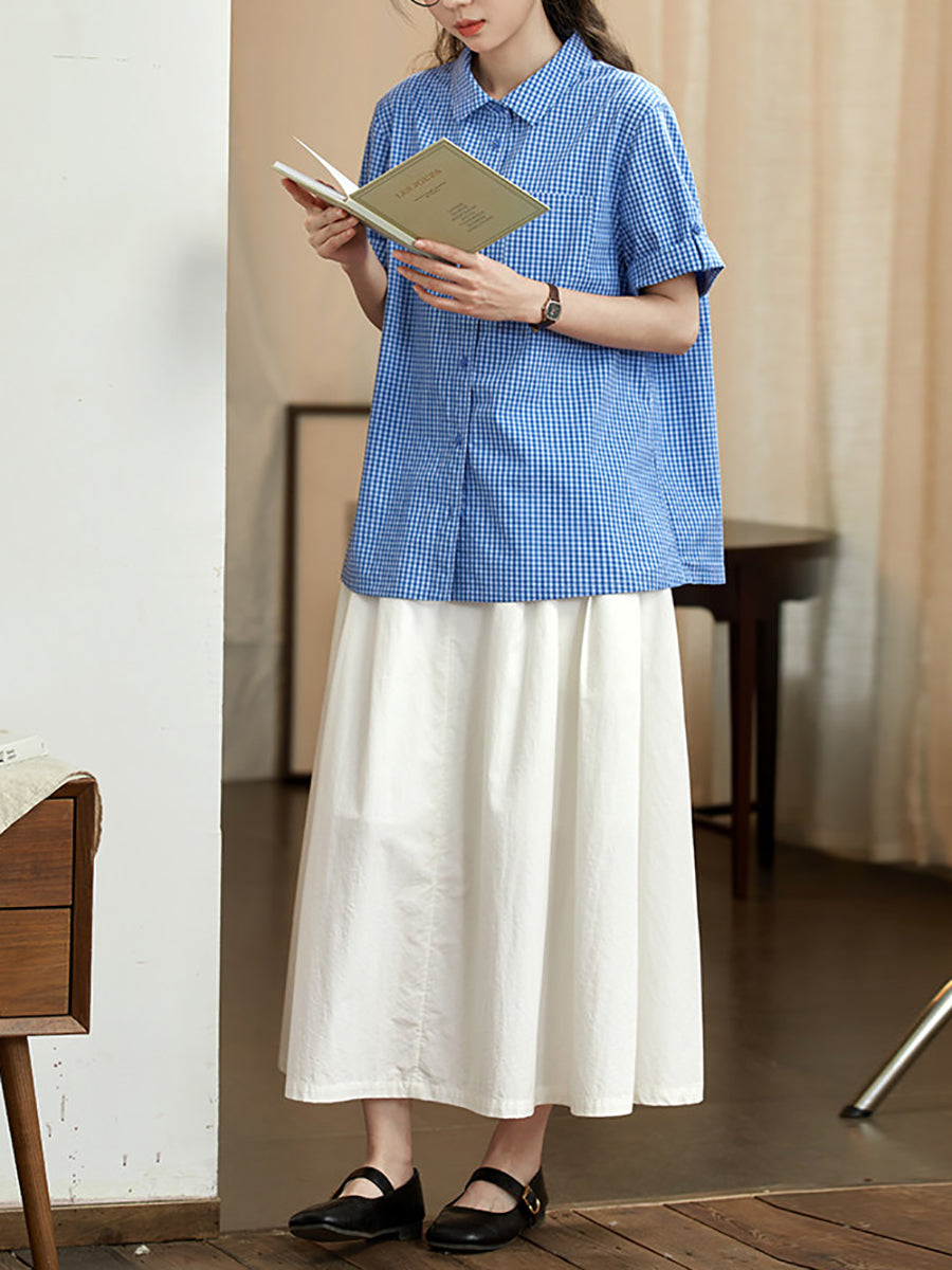 Women Spring Retro Plaid Turn-down Collar 100%Cotton Shirt