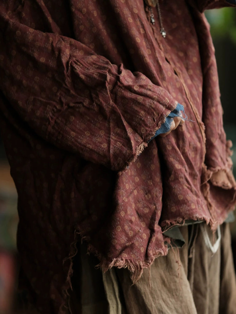 Women Autumn Retro Print O-Neck Raw-edge Cotton Shirt
