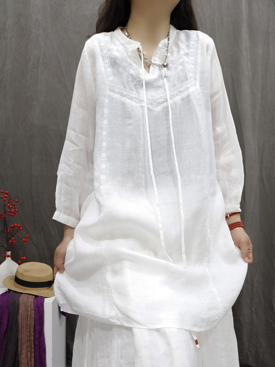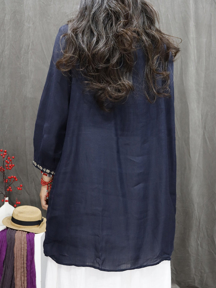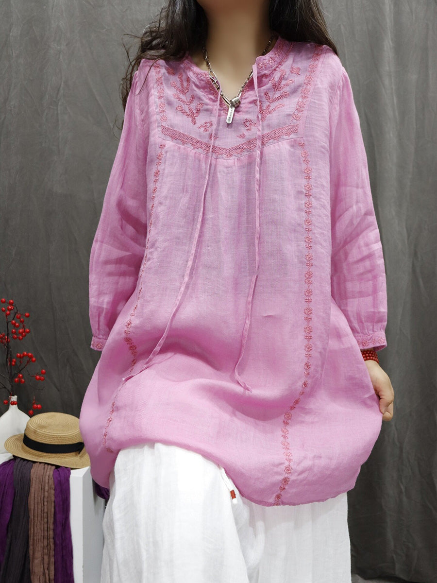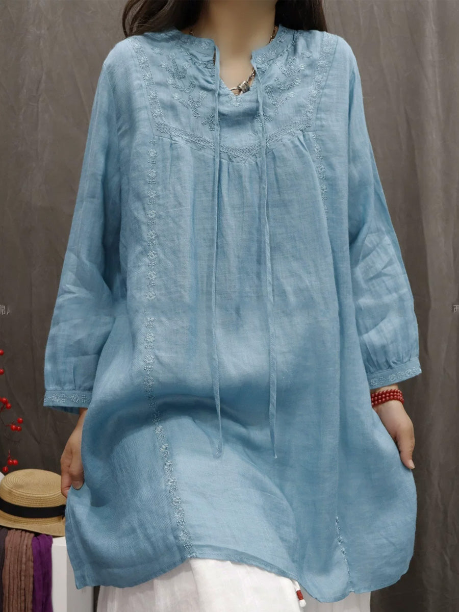 Women Spring Artsy Embroidery 100%Ramie V-Neck Blouse