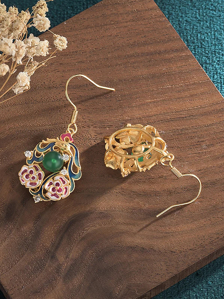Women Chinese Style Enamel Flower Jade Silver Earrings