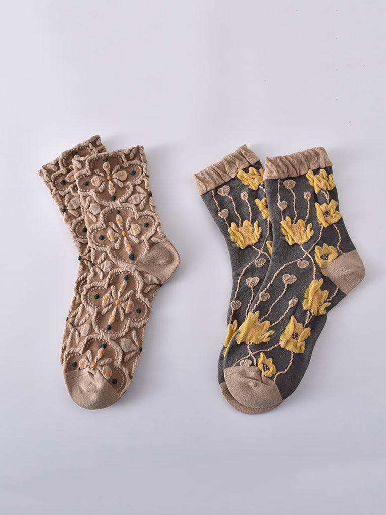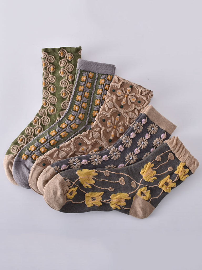 5 Pairs Women Autumn Vintage Flower Jacquard Socks