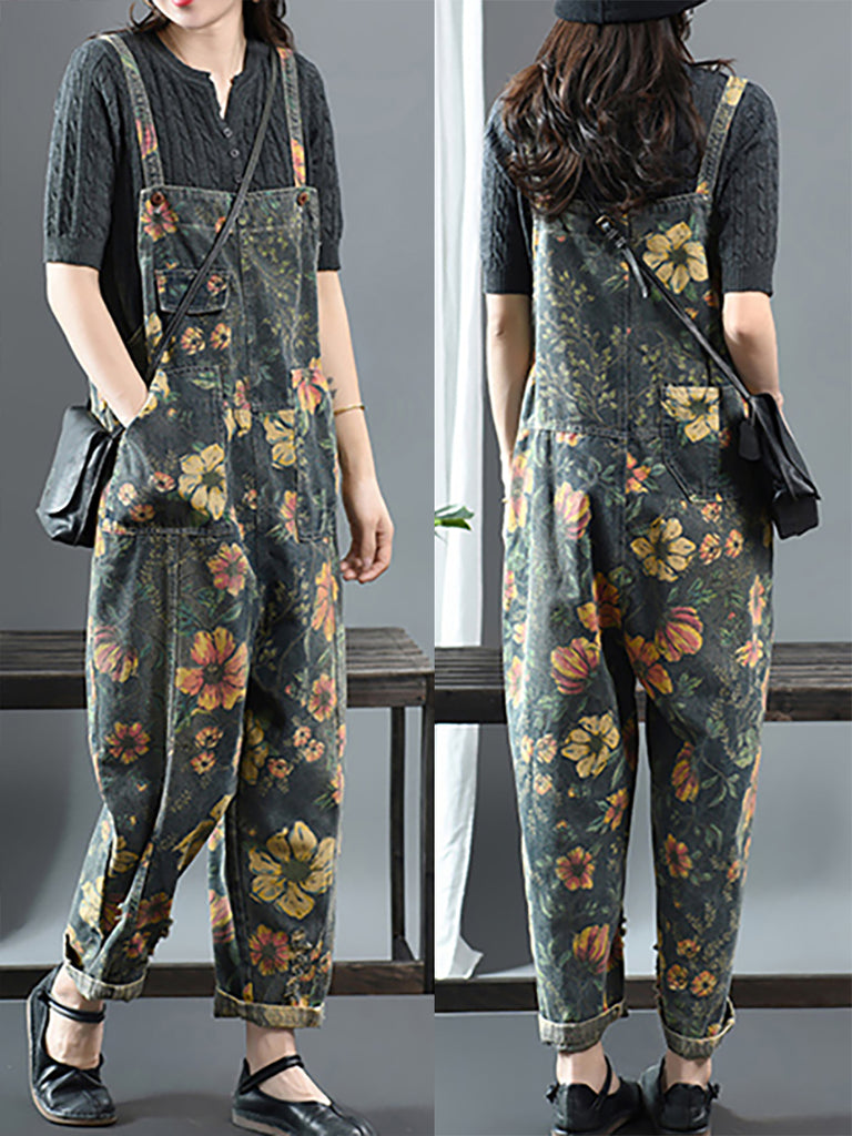 Plus Size - Flower Print Casual Denim Cotton Jumpsuit Dungarees