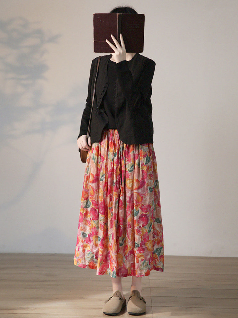 Plus Size Women Summer Artsy Flower Drwastring Ramie Skirt