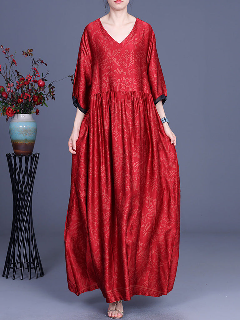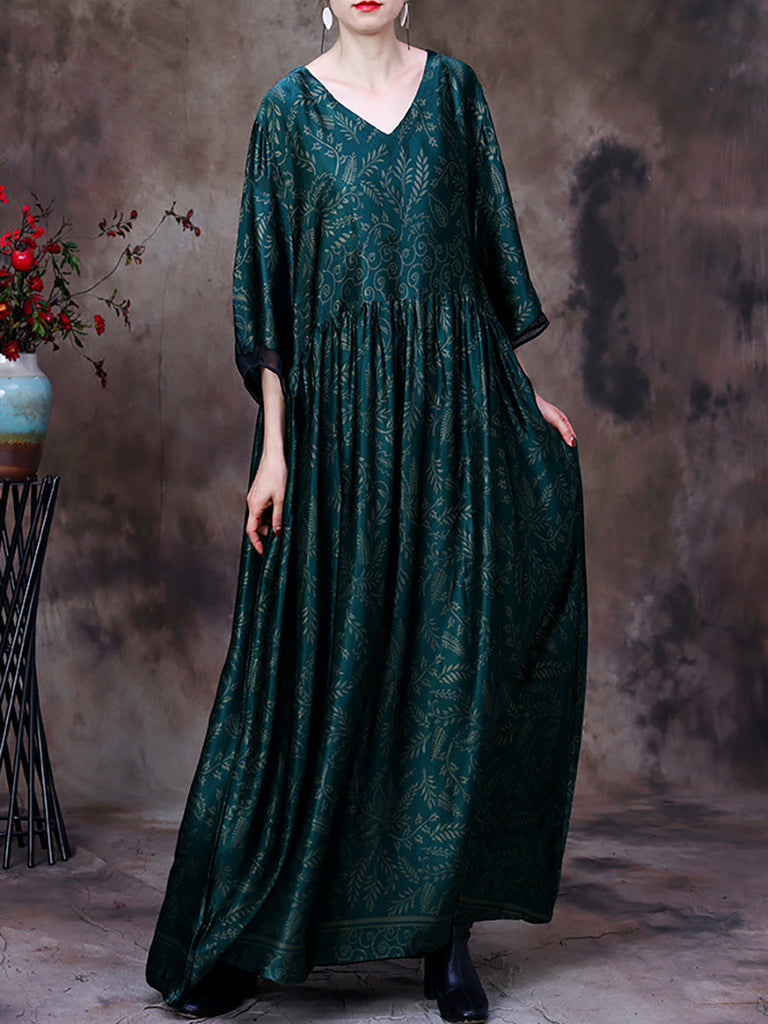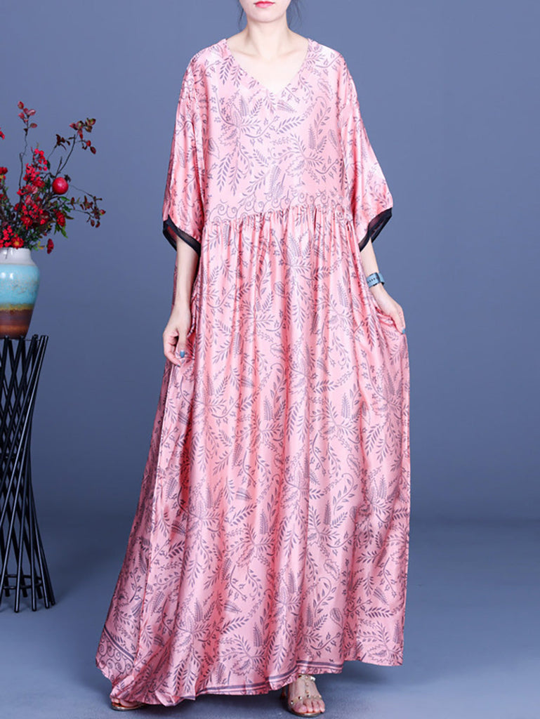 Plus Size Women Summer Vintage Flower Print Pleat V-Neck Dress