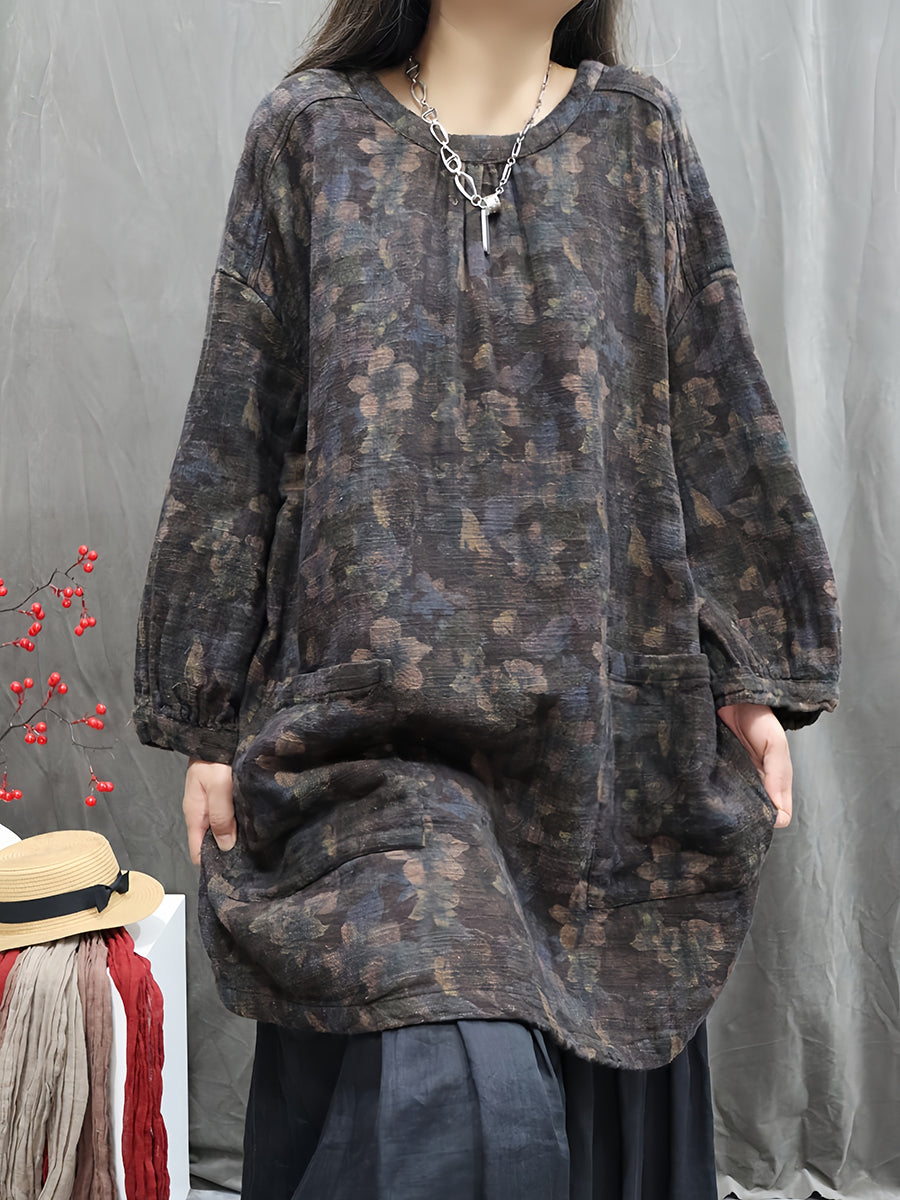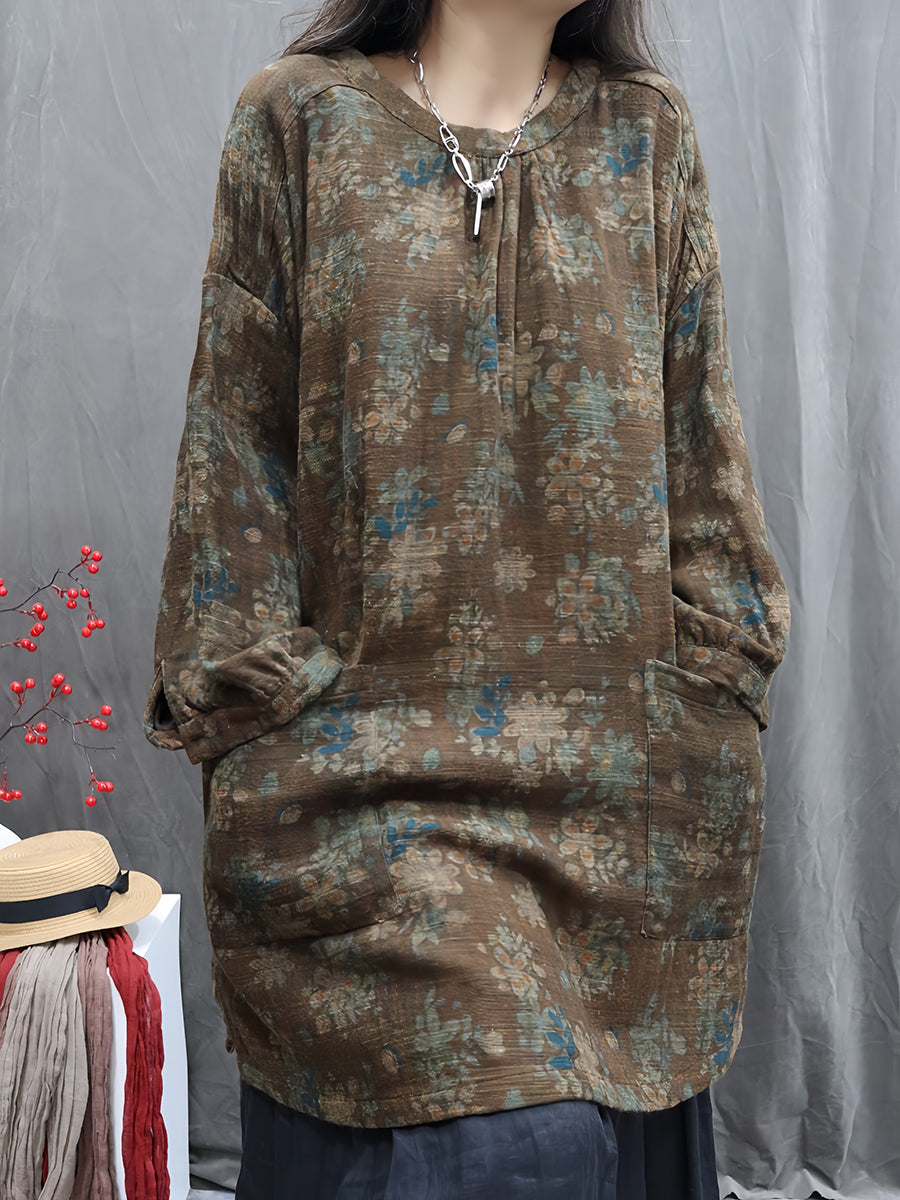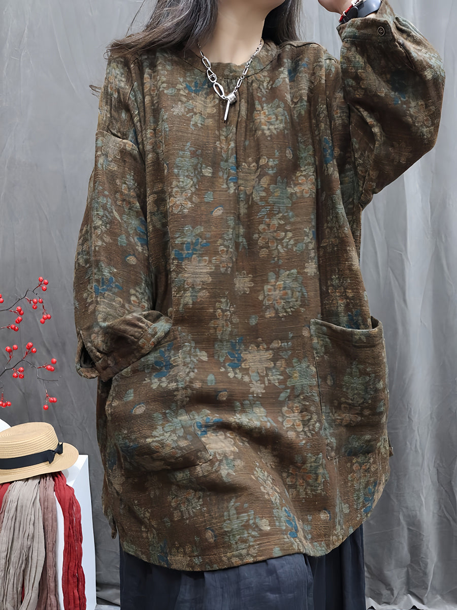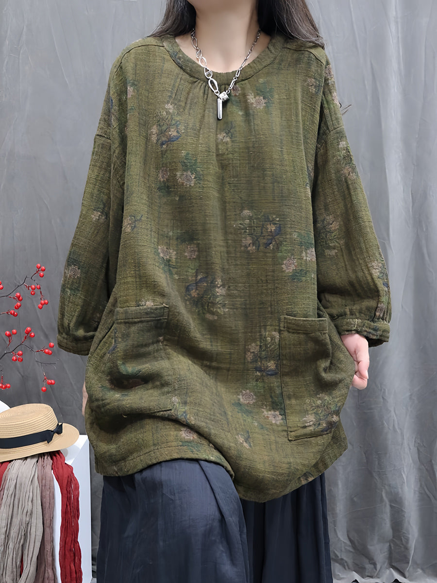Women Artsy Autumn Flower O-Neck 100%Linen Blouse